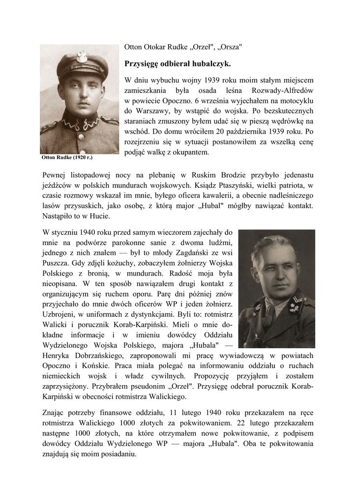 Otton Otokar Rudke „Orzeł", „Orsza" Przysięgę odbierał hubalczyk. Otton Rudke (1920 r.) W dniu wybuchu wojny 1939 roku moim stałym miejscem zamieszkania była osada leśna Rozwady-Alfredów w powiecie Opoczno. 6 września wyjechałem na motocyklu do Warszawy, by wstąpić do wojska. Po bezskutecznych staraniach zmuszony byłem udać się w pieszą wędrówkę na wschód. Do domu wróciłem 20 października 1939 roku. Po rozejrzeniu się w sytuacji postanowiłem za wszelką cenę podjąć walkę z okupantem. Pewnej listopadowej nocy na plebanię w Ruskim Brodzie przybyło jedenastu jeźdźców w polskich mundurach wojskowych. Ksiądz Ptaszyński, wielki patriota, w czasie rozmowy wskazał im mnie, byłego oficera kawalerii, a obecnie nadleśniczego lasów przysuskich, jako osobę, z którą major „Hubal" mógłby nawiązać kontakt. Nastąpiło to w Hucie. W styczniu 1940 roku przed samym wieczorem zajechały do mnie na podwórze parokonne sanie z dwoma ludźmi, jednego z nich znałem — był to młody Zagdański ze wsi Puszcza. Gdy zdjęli kożuchy, zobaczyłem żołnierzy Wojska Polskiego z bronią, w mundurach. Radość moja była nieopisana. W ten sposób nawiązałem drugi kontakt z organizującym się ruchem oporu. Parę dni później znów przyjechało do mnie dwóch oficerów WP i jeden żołnierz. Uzbrojeni, w uniformach z dystynkcjami. Byli to: rotmistrz Walicki i porucznik Korab-Karpiński. Mieli o mnie dokładne informacje i w imieniu dowódcy Oddziału Wydzielonego Wojska Polskiego, majora „Hubala" — Henryka Dobrzańskiego, zaproponowali mi pracę wywiadowczą w powiatach Opoczno i Końskie. Praca miała polegać na informowaniu oddziału o ruchach niemieckich wojsk i władz cywilnych. Propozycję przyjąłem i zostałem zaprzysiężony. Przybrałem pseudonim „Orzeł". Przysięgę odebrał porucznik KorabKarpiński w obecności rotmistrza Walickiego. Znając potrzeby finansowe oddziału, 11 lutego 1940 roku przekazałem na ręce rotmistrza Walickiego 1000 złotych za pokwitowaniem. 22 lutego przekazałem następne 1000 złotych, na które otrzymałem nowe pokwitowanie, z podpisem dowódcy Oddziału Wydzielonego WP — majora „Hubala". Oba te pokwitowania znajdują się moim posiadaniu. Podziękowanie dla Ottona Rudke za przekazanie 1000 zł na rzecz oddziału majora Hubala z dnia 22.02.1940 r. Ponadto przekazałem schowane w lesie: jeden ckm, jeden rkm i 9 karabinów wraz z kilkoma skrzynkami amunicji. Major „Hubal" był później częstym gościem w moim domu, a pewnego wieczora przywiózł cały sztab – kilkunastu oficerów. Wszyscy ubrani byli w mundury wojskowe. Przeżywaliśmy wówczas radość nie do opisania. Zdawało się nam, że Polska znów powstała. Entuzjazm rósł z dnia na dzień. Chłopi dostarczali do Gałek żywność i broń. Codziennie zgłaszali się żołnierze różnych rodzajów broni. Oddział powiększał się i rósł w siłę. W jego skład wchodziły wówczas: kawaleria, saperzy, piechota, grupy specjalne, lekarz i ksiądz zakonnik z klasztoru w Studziannie. Oprócz broni różnego rodzaju było nawet jedno działo. Oddział „Hubala" rozrósł się do przeszło 300 ludzi. „Hubalczycy" unikali początkowo większych bitew, przerzucając się z miejsca na miejsce. Do pierwszego starcia z Niemcami doszło pod Maciejowicami. Potem nastąpiły walki w Górach Świętokrzyskich i wielki bój pod Huciskami. Niemcy ponieśli w tych walkach duże straty. Na wiosnę 1940 roku z Warszawy do Gałek przyjechał pułkownik Leopold Okulicki (pseudonim „Miller"), komendant okręgu ZWZ Łódź, i wydał „Hubalowi" w imieniu Komendy Głównej ZWZ rozkaz rozwiązania oddziału. Broń, amunicję, sprzęt i dokumenty należało ukryć, ludzi rozpuścić i przejść do konspiracji. Major „Hubal" był bardzo podniecony, w złości powiedział: — Ja takich rozkazów nie przyjmuję, raz przysięgę składałem i żadna siła do jej złamania mnie nie zmusi. Mam was w d... — i wyszedł na podwórze. Kilkunastu najbardziej oddanych ludzi otoczyło „Hubala" wołając: — My z wami! Gdy się ściemniło, 18 jeźdźców opuściło sławną wieś Gałki na najlepszych koniach. Smutny był obraz przemykających się żołnierzy Wydzielonego Oddziału Wojska Polskiego. W Opocznie spotkałem się jeszcze z kilkoma oficerami „Hubala" i ułatwiłem im wyjazd do Piotrkowa. Major „Hubal" na czele swojej małej grupki wyjechał w lasy spalskie. Na początku maja 1940 roku rozeszła się wiadomość, że zginął w lesie pod Anielinem. Został przeszyty serią broni maszynowej, z odległości kilku metrów, 29 kwietnia 1940 roku. W lipcu zaszło do mnie kilku rozbitków z jego oddziału z erkaemem. Od nich dowiedziałem się, w jakich okolicznościach zginął „Hubal". Podobno został pochowany z honorami, lecz grobu nikt nie mógł odnaleźć. Niemcy w barbarzyński sposób pomordowali wszystkich mężczyzn z Gałek, a wieś spalili. Nastąpił okres ciszy, nic się w okolicy nie działo, aż dopiero w roku 1942 w letnią noc zawitał nieliczny oddział GL. Jednego z gwardzistów znałem i jemu dałem na potrzeby oddziału i dwie blaszane skrzynki z amunicją, znalezione w lesie. Wkrótce ' potem przyszedł liczniejszy oddział GL połączony z pierwszym. Dowódca oddziału powiedział, że nosi pseudonim „Wilk", a oddział należy do Gwardii Ludowej. Po spożyciu przygotowanej na poczekaniu kolacji zaczęliśmy rozmawiać. Dowódca oddziału — Józef Rogulski spod Drzewicy — zapronował mi współpracę z Gwardią Ludową. Propozycję przyjąłem, gdyż było to zgodne z moimi poglądami. Nie mogłem pozostawać bezczynnym. Jednakże oddział „Wilka" więcej nie odwiedzał mojej okolicy, podobno przeniósł się nad Pilicę. Latem 1943 roku zaczęto wywozić Żydów do obozów śmierci. Pewnego dnia zaszła do mnie Żydówka z Drzewicy i poprosiła o pomoc. Postarałem się dla niej o wiejski przyodziewek i per-hydrolem utleniłe