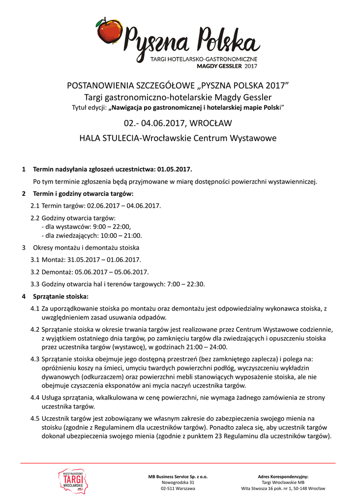 POSTANOWIENIA SZCZEGÓŁOWE „PYSZNA POLSKA 2017” Targi gastronomiczno-hotelarskie Magdy Gessler Tytuł edycji: „Nawigacja po gastronomicznej i hotelarskiej mapie Polski” 02.- 04.06.2017, WROCŁAW HALA STULECIA-Wrocławskie Centrum Wystawowe 1 Termin nadsyłania zgłoszeń uczestnictwa: 01.05.2017. Po tym terminie zgłoszenia będą przyjmowane w miarę dostępności powierzchni wystawienniczej. 2 Termin i godziny otwarcia targów: 2.1 Termin targów: 02.06.2017 – 04.06.2017. 2.2 Godziny otwarcia targów: - dla wystawców: 9:00 – 22:00, - dla zwiedzających: 10:00 – 21:00. 3 Okresy montażu i demontażu stoiska 3.1 Montaż: 31.05.2017 – 01.06.2017. 3.2 Demontaż: 05.06.2017 – 05.06.2017. 3.3 Godziny otwarcia hal i terenów targowych: 7:00 – 22:30. 4 Sprzątanie stoiska: 4.1 Za uporządkowanie stoiska po montażu oraz demontażu jest odpowiedzialny wykonawca stoiska, z uwzględnieniem zasad usuwania odpadów. 4.2 Sprzątanie stoiska w okresie trwania targów jest realizowane przez Centrum Wystawowe codziennie, z wyjątkiem ostatniego dnia targów, po zamknięciu targów dla zwiedzających i opuszczeniu stoiska przez uczestnika targów (wystawcę), w godzinach 21:00 – 24:00. 4.3 Sprzątanie stoiska obejmuje jego dostępną przestrzeń (bez zamkniętego zaplecza) i polega na: opróżnieniu koszy na śmieci, umyciu twardych powierzchni podłóg, wyczyszczeniu wykładzin dywanowych (odkurzaczem) oraz powierzchni mebli stanowiących wyposażenie stoiska, ale nie obejmuje czyszczenia eksponatów ani mycia naczyń uczestnika targów. 4.4 Usługa sprzątania, wkalkulowana w cenę powierzchni, nie wymaga żadnego zamówienia ze strony uczestnika targów. 4.5 Uczestnik targów jest zobowiązany we własnym zakresie do zabezpieczenia swojego mienia na stoisku (zgodnie z Regulaminem dla uczestników targów). Ponadto zaleca się, aby uczestnik targów dokonał ubezpieczenia swojego mienia (zgodnie z punktem 23 Regulaminu dla uczestników targów). MB Business Service Sp. z o.o. Nowogrodzka 31 02-511 Warszawa Adres Korespondencyjny: Targi Wrocławskie MB Wita Stwosza 16 pok. nr 1, 50-148 Wrocław 5 Karty wstępu: 5.1 Do wstępu na tereny targowe w okresie trwania targów, montażu i demontażu upoważniają uczestników targów karty wystawcy. 5.2 Karty wystawcy są przydzielane przez MB Międzynarodowe Targi Wrocławskie w ilości zależnej od wielkości powierzchni zamówionej przez wystawcę, według następujących zasad: - 2 karty stoisko do 10 m2, - 4 karty stoisko do 20 m2, - 6 kart stoisko do 50 m2, - 8 kart stoisko do 75 m2, - 10 kart stoisko do 100 m2, - 12 kart stoisko do 200 m2, - po jednej karcie na każde 50 m2 powyżej 200 m2. 5.3 Dodatkowe karty wystawcy, ponad limit określony powyżej, są sprzedawane na podstawie zgłoszenia drogą elektroniczną na adres [email protected]. Jeżeli zamówienie wpłynęło do MB Międzynarodowe Targi Wrocławskie w terminie ok. 1 miesiąca przed targami, zamówione karty są wysyłane przez MB Międzynarodowe Targi Wrocławskie na adres zamawiającego listem poleconym, a płatność za nie powinna być uregulowana na podstawie faktury wystawionej po targach. Jeżeli zamówienie wpłynęło do MB Międzynarodowe Targi Wrocławskie w terminie krótszym niż 1 miesiąc przed targami, odbioru zamówionych kart dokonuje się w Recepcji Wystawców na terenie Centrum Wystawowym, po uiszczeniu należności gotówką lub kartą płatniczą. 5.4 Karty wstępu dla ekip budujących stoiska są wystawiane przez MB Międzynarodowe Targi Wrocławskie na okres montażu i demontażu na podstawie pisemnego zamówienia uczestnika targów lub przedsiębiorcy budującego stoiska. Odbioru zamówionych kart dokonuje się w Recepcji Wystawców. 6 Karty wjazdu i karty parkingowe: 6.1 Uczestnicy targów, którzy chcą uzyskać możliwość wjazdu samochodem osobowym lub samochodem dostawczym na tereny targowe są zobowiązani zgłosić takie zapotrzebowanie do MB Business Service Sp. z o.o. najpóźniej do dnia 25.05.2017 r. z podaniem marki samochodu, nr rejestracyjnego wraz z terminem i szacowaną godziną wjazdu/wyjazdu. 6.2 Na podstawie zgłoszeń, o których mowa wyżej uczestnicy targów otrzymają przepustki samochodowe uprawniające do wjazdu na teren kompleksu Hali Stulecia w dniach montażowych tj. 31.05.01.06.2017 r. w godzinach od 8:00 do 22:00, w dniu 2.06.2017 r. w godzinach od 6:00 do 11:00, w dniach demontażowych: 4.06.2017 r. w godzinach od 17:00 do 5.06.2017 r. do godziny 2:00, przy czym maksymalny postoju jednego samochodu to 4 godziny od momentu wjazdu na teren Kompleksu Hali Stulecia. Za każdy przypadek nie przestrzegania wyznaczonych godzin wyjazdu z terenu Kompleksu Hali Stulecia, uczestnikowi targów naliczona zostanie kara umowna w wysokości 300,00 zł od każdego pojazdu za każdą rozpoczętą godzinę postoju. 6.3 Wykonawcy stoisk i dostawcy / odbiorcy eksponatów są uprawnieni do wjazdu na tereny targowe w okresie montażu i demontażu, na podstawie kart wjazdu na montaż / demontaż lub zlecenia dostawy / odbioru. Karty wjazdu na montaż / demontaż są wydawane na podstawie pisemnego zamówienia w Recepcji Wystawców. MB Business Service Sp. z o.o. Nowogrodzka 31 02-511 Warszawa Adres Korespondencyjny: Targi Wrocławskie MB Wita Stwosza 16 pok. nr 1, 50-148 Wrocław 6.4 W ostatnim dniu targów, po ich zamknięciu dla publiczności, tj. dnia 04.06.2017 po godz. 22:00, w celu demontażu stoisk będą wpuszczane na tereny targowe, poza samochodami osobowymi, także pojazdy dostawcze oraz samochody ciężarowe o ładowności do 8 t i długości do 8 m, bez przyczep. Wjazd pojazdów wielkogabarytowych i specjalistycznych jest możliwy następnego dnia po zakończeniu targów, tj. dnia 05.06.2017 od godz. 7:00. 6.5 Niedozwolonym jest: • wjazd na tereny targowe bez ważnych dokumentów uprawniających do wjazdu, • parkowanie pojazdów na drodze pożarowej oraz w strefie wyznaczonej dla pieszych, • pozostawienie pojazdów 