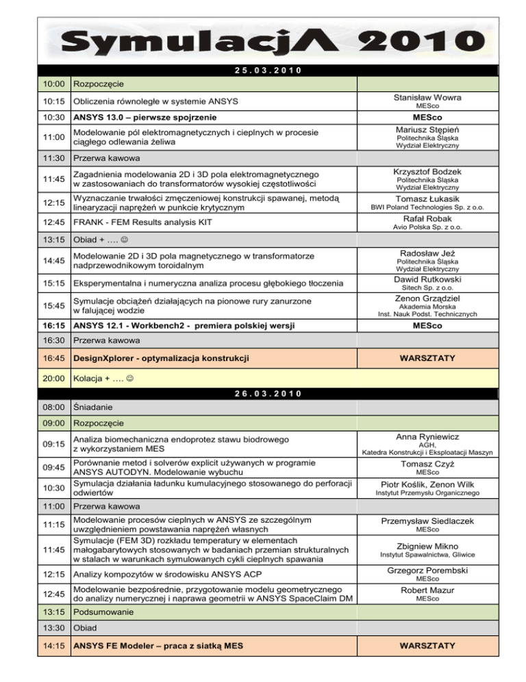 25.03.2010 10:00 Rozpoczęcie 10:15 Obliczenia równoległe w systemie ANSYS 10:30 ANSYS 13.0 – pierwsze spojrzenie 11:00 Stanisław Wowra MESco MESco Modelowanie pól elektromagnetycznych i cieplnych w procesie ciągłego odlewania żeliwa Mariusz Stępień Politechnika Śląska Wydział Elektryczny 11:30 Przerwa kawowa 11:45 Zagadnienia modelowania 2D i 3D pola elektromagnetycznego w zastosowaniach do transformatorów wysokiej częstotliwości cz 12:15 Wyznaczanie trwałości zmęczeniowej ęczeniowej konstrukcji spawanej, metodą metod linearyzacji naprężeń w punkcie krytycznym Krzysztof Bodzek Politechnika Śląska Wydział Elektryczny Tomasz Łukasik BWI Poland Technologies Sp. z o.o. Rafał Robak 12:45 FRANK - FEM Results analysis KIT Avio Polska Sp. z o.o. 13:15 Obiad + …. ☺ 14:45 Modelowanie 2D i 3D pola magnetycznego w transformatorze nadprzewodnikowym toroidalnym Radosław Jeż Politechnika Śląska Wydział Elektryczny 15:15 Eksperymentalna i numeryczna analiza procesu głębokiego gł tłoczenia Dawid Rutkowski Symulacje obciążeń działających ących na pionowe rury zanurzone w falującej wodzie Zenon Grządziel 15:45 16:15 ANSYS 12.1 - Workbench2 - premiera polskiej wersji Sitech Sp. z o.o. Akademia Morska Inst. Nauk Podst. Technicznych MESco 16:30 Przerwa kawowa ptymalizacja konstrukcji 16:45 DesignXplorer - optymalizacja WARSZTATY 20:00 Kolacja + …. ☺ 26.03.2010 08:00 Śniadanie 09:00 Rozpoczęcie 09:15 Analiza biomechaniczna endoprotez stawu biodrowego z wykorzystaniem MES Porównanie metod i solverów explicit używanych u w programie ANSYS AUTODYN.. Modelowanie wybuchu Symulacja działania ładunku kumulacyjnego stosowanego do perforacji 10:30 odwiertów 09:45 Anna Ryniewicz AGH, Katedra Konstrukcji i Eksploatacji Maszyn Tomasz Czyż MESco Piotr Koślik, Zenon Wilk Instytut Przemysłu Organicznego 11:00 Przerwa kawowa Modelowanie procesów cieplnych w ANSYS ze szczególnym uwzględnieniem dnieniem powstawania napr naprężeń własnych Symulacje (FEM 3D) rozkładu temperatury w elementach 11:45 małogabarytowych stosowanych w badaniach przemian strukturalnych w stalach w warunkach symulowanych cykli cieplnych spawania 11:15 12:15 Analizy kompozytów w środowisku rodowisku ANSYS ACP Modelowanie bezpośrednie, rednie, przygotowanie modelu geometrycznego 12:45 do analizy numerycznej i naprawa geometrii w ANSYS SpaceClaim DM Przemysław Siedlaczek MESco Zbigniew Mikno Instytut Spawalnictwa, Gliwice Grzegorz Porembski MESco Robert Mazur MESco 13:15 Podsumowanie 13:30 Obiad siatk MES 14:15 ANSYS FE Modeler – praca z siatką WARSZTATY