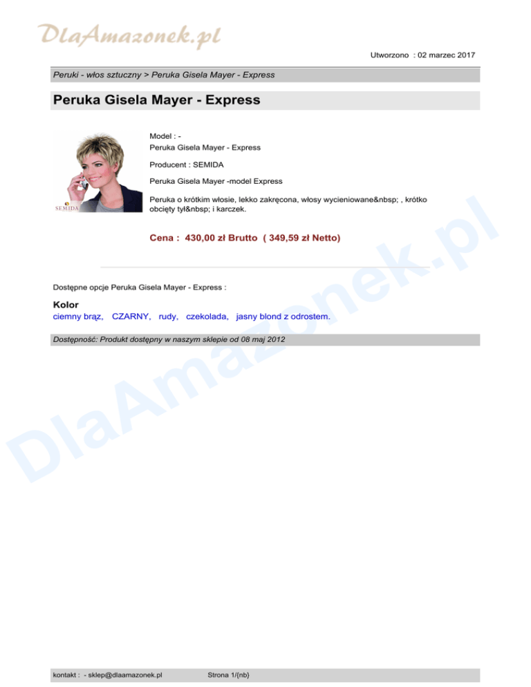 Utworzono : 02 marzec 2017 Peruki - włos sztuczny > Peruka Gisela Mayer - Express Peruka Gisela Mayer - Express Model : Peruka Gisela Mayer - Express Producent : SEMIDA Peruka Gisela Mayer -model Express l p . k e Peruka o krótkim włosie, lekko zakręcona, włosy wycieniowane , krótko obcięty tył i karczek. Cena : 430,00 zł Brutto ( 349,59 zł Netto) n o z a Dostępne opcje Peruka Gisela Mayer - Express : Kolor ciemny brąz, CZARNY, rudy, czekolada, jasny blond z odrostem. Dostępność: Produkt dostępny w naszym sklepie od 08 maj 2012 m A a l D kontakt : - [email protected] Strona 1/{nb}