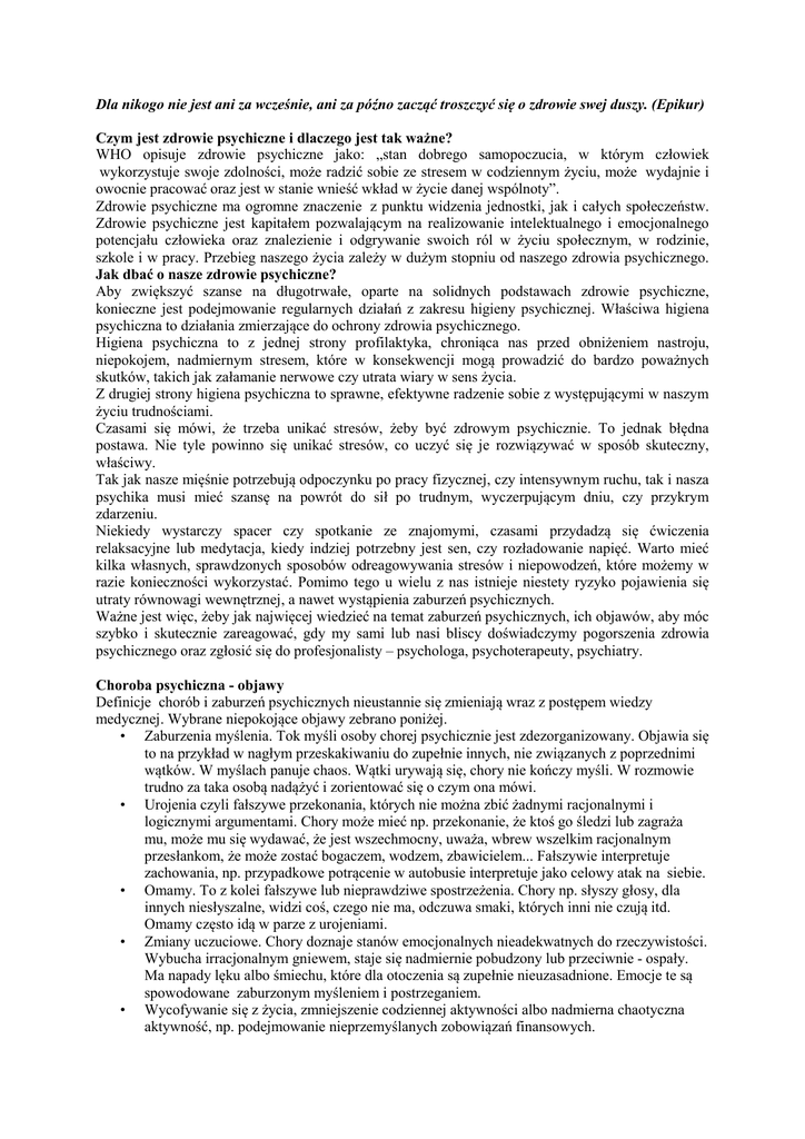 Dla nikogo nie jest ani za wcześnie, ani za późno zacząć troszczyć się o zdrowie swej duszy. (Epikur) Czym jest zdrowie psychiczne i dlaczego jest tak ważne? WHO opisuje zdrowie psychiczne jako: „stan dobrego samopoczucia, w którym człowiek wykorzystuje swoje zdolności, może radzić sobie ze stresem w codziennym życiu, może wydajnie i owocnie pracować oraz jest w stanie wnieść wkład w życie danej wspólnoty”. Zdrowie psychiczne ma ogromne znaczenie z punktu widzenia jednostki, jak i całych społeczeństw. Zdrowie psychiczne jest kapitałem pozwalającym na realizowanie intelektualnego i emocjonalnego potencjału człowieka oraz znalezienie i odgrywanie swoich ról w życiu społecznym, w rodzinie, szkole i w pracy. Przebieg naszego życia zależy w dużym stopniu od naszego zdrowia psychicznego. Jak dbać o nasze zdrowie psychiczne? Aby zwiększyć szanse na długotrwałe, oparte na solidnych podstawach zdrowie psychiczne, konieczne jest podejmowanie regularnych działań z zakresu higieny psychicznej. Właściwa higiena psychiczna to działania zmierzające do ochrony zdrowia psychicznego. Higiena psychiczna to z jednej strony profilaktyka, chroniąca nas przed obniżeniem nastroju, niepokojem, nadmiernym stresem, które w konsekwencji mogą prowadzić do bardzo poważnych skutków, takich jak załamanie nerwowe czy utrata wiary w sens życia. Z drugiej strony higiena psychiczna to sprawne, efektywne radzenie sobie z występującymi w naszym życiu trudnościami. Czasami się mówi, że trzeba unikać stresów, żeby być zdrowym psychicznie. To jednak błędna postawa. Nie tyle powinno się unikać stresów, co uczyć się je rozwiązywać w sposób skuteczny, właściwy. Tak jak nasze mięśnie potrzebują odpoczynku po pracy fizycznej, czy intensywnym ruchu, tak i nasza psychika musi mieć szansę na powrót do sił po trudnym, wyczerpującym dniu, czy przykrym zdarzeniu. Niekiedy wystarczy spacer czy spotkanie ze znajomymi, czasami przydadzą się ćwiczenia relaksacyjne lub medytacja, kiedy indziej potrzebny jest sen, czy rozładowanie napięć. Warto mieć kilka własnych, sprawdzonych sposobów odreagowywania stresów i niepowodzeń, które możemy w razie konieczności wykorzystać. Pomimo tego u wielu z nas istnieje niestety ryzyko pojawienia się utraty równowagi wewnętrznej, a nawet wystąpienia zaburzeń psychicznych. Ważne jest więc, żeby jak najwięcej wiedzieć na temat zaburzeń psychicznych, ich objawów, aby móc szybko i skutecznie zareagować, gdy my sami lub nasi bliscy doświadczymy pogorszenia zdrowia psychicznego oraz zgłosić się do profesjonalisty – psychologa, psychoterapeuty, psychiatry. Choroba psychiczna - objawy Definicje chorób i zaburzeń psychicznych nieustannie się zmieniają wraz z postępem wiedzy medycznej. Wybrane niepokojące objawy zebrano poniżej. • Zaburzenia myślenia. Tok myśli osoby chorej psychicznie jest zdezorganizowany. Objawia się to na przykład w nagłym przeskakiwaniu do zupełnie innych, nie związanych z poprzednimi wątków. W myślach panuje chaos. Wątki urywają się, chory nie kończy myśli. W rozmowie trudno za taka osobą nadążyć i zorientować się o czym ona mówi. • Urojenia czyli fałszywe przekonania, których nie można zbić żadnymi racjonalnymi i logicznymi argumentami. Chory może mieć np. przekonanie, że ktoś go śledzi lub zagraża mu, może mu się wydawać, że jest wszechmocny, uważa, wbrew wszelkim racjonalnym przesłankom, że może zostać bogaczem, wodzem, zbawicielem... Fałszywie interpretuje zachowania, np. przypadkowe potrącenie w autobusie interpretuje jako celowy atak na siebie. • Omamy. To z kolei fałszywe lub nieprawdziwe spostrzeżenia. Chory np. słyszy głosy, dla innych niesłyszalne, widzi coś, czego nie ma, odczuwa smaki, których inni nie czują itd. Omamy często idą w parze z urojeniami. • Zmiany uczuciowe. Chory doznaje stanów emocjonalnych nieadekwatnych do rzeczywistości. Wybucha irracjonalnym gniewem, staje się nadmiernie pobudzony lub przeciwnie - ospały. Ma napady lęku albo śmiechu, które dla otoczenia są zupełnie nieuzasadnione. Emocje te są spowodowane zaburzonym myśleniem i postrzeganiem. • Wycofywanie się z życia, zmniejszenie codziennej aktywności albo nadmierna chaotyczna aktywność, np. podejmowanie nieprzemyślanych zobowiązań finansowych. Fakty i mity na temat zaburzeń psychicznych FAKTY ➢ Każdy człowiek, bez względu na wiek, pochodzenie, wykształcenie i pozycję społeczną może zachorować psychicznie lub doświadczyć zaburzeń zdrowia psychicznego takich, jak depresja czy nerwica. ➢ Dzięki nowoczesnej farmakoterapii duża część osób chorujących psychicznie prowadzi normalne, aktywne życie. ➢ Osoby doświadczające kryzysów zdrowia psychicznego mogą się uczyć, pracować, założyć rodzinę. ➢ Osoby chorujące psychicznie mogą pracować 8 godzin dziennie i 40 godzin tygodniowo, czyli tyle, ile ich zdrowi współpracownicy. MITY ➢ Osoby chorujące na psychozy często są niebezpieczne i agresywne w stosunku do innych. ➢ Osoby chorujące psychicznie są mniej inteligentne niż ludzie zdrowi. ➢ Pracownikom po kryzysach zdrowia psychicznego nie można powierzyć odpowiedzialnych zadań zawodowych. Co robić kiedy podejrzewamy chorobę psychiczną u kogoś bliskiego Przede wszystkim nie starać się go diagnozować i leczyć samemu. Zawsze istnieje niebezpieczeństwo, że fałszywie interpretujemy zachowania i stany uczuciowe. Najlepszym wyjściem jest skłonienie tej osoby do konsultacji z psychiatrą lub psychologiem. Tylko fachowiec może z większym prawdopodobieństwem rozpoznać i zdiagnozować chorobę oraz pomóc w cierpieniu. Bo choroba psychiczna wiąże się zwykle z dużym cierpieniem przeżywanym przez chorego. Koniecznie trzeba skłonić do wizyty u lekarza a nawet zgłoszenia się do szpitala osoby, które mają myśli samobójcze. Gdzie szukać pomocy? R