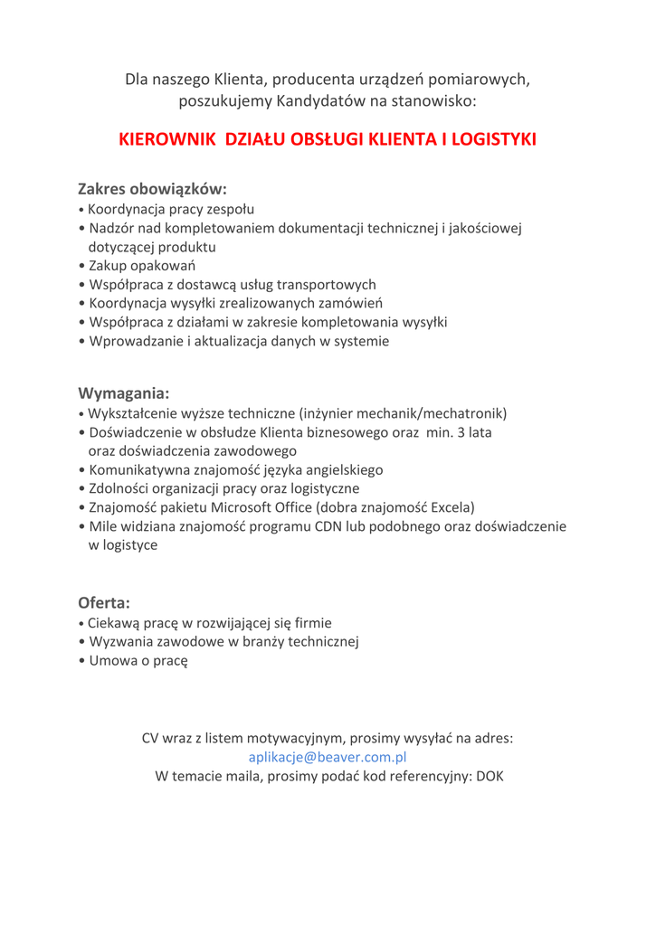 Dla naszego Klienta, producenta urządzeń pomiarowych, poszukujemy Kandydatów na stanowisko: KIEROWNIK DZIAŁU OBSŁUGI KLIENTA I LOGISTYKI Zakres obowiązków: • Koordynacja pracy zespołu • Nadzór nad kompletowaniem dokumentacji technicznej i jakościowej dotyczącej produktu • Zakup opakowań • Współpraca z dostawcą usług transportowych • Koordynacja wysyłki zrealizowanych zamówień • Współpraca z działami w zakresie kompletowania wysyłki • Wprowadzanie i aktualizacja danych w systemie Wymagania: • Wykształcenie wyższe techniczne (inżynier mechanik/mechatronik) • Doświadczenie w obsłudze Klienta biznesowego oraz min. 3 lata oraz doświadczenia zawodowego • Komunikatywna znajomość języka angielskiego • Zdolności organizacji pracy oraz logistyczne • Znajomość pakietu Microsoft Office (dobra znajomość Excela) • Mile widziana znajomość programu CDN lub podobnego oraz doświadczenie w logistyce Oferta: • Ciekawą pracę w rozwijającej się firmie • Wyzwania zawodowe w branży technicznej • Umowa o pracę CV wraz z listem motywacyjnym, prosimy wysyłać na adres: [email protected] W temacie maila, prosimy podać kod referencyjny: DOK
