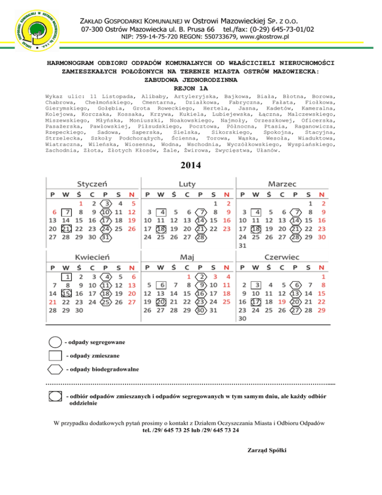 ZAKŁAD GOSPODARKI KOMUNALNEJ w Ostrowi Mazowieckiej SP. Z O.O. 07-300 Ostrów Mazowiecka ul. B. Prusa 66 tel./fax: (0-29) 645-73-01/02 NIP: 759-14-75-720 REGON: 550733679, www.gkostrow.pl HARMONOGRAM ODBIORU ODPADÓW KOMUNALNYCH OD WŁAŚCICIELI NIERUCHOMOŚCI ZAMIESZKAŁYCH POŁOŻONYCH NA TERENIE MIASTA OSTRÓW MAZOWIECKA: ZABUDOWA JEDNORODZINNA REJON 1A Wykaz ulic: 11 Listopada, Alibaby, Artyleryjska, Bajkowa, Biała, Błotna, Borowa, Chabrowa, Chełmońskiego, Cmentarna, Działkowa, Fabryczna, Fałata, Fiołkowa, Gierymskiego, Gołębia, Grota Roweckiego, Hertela, Jasna, Kadetów, Kameralna, Kolejowa, Korczaka, Kossaka, Krzywa, Kukiela, Lubiejewska, Łączna, Malczewskiego, Miszewskiego, Młyńska, Moniuszki, Noakowskiego, Najmoły, Orzeszkowej, Oficerska, Pasażerska, Pawłowskiej, Piłsudskiego, Pocztowa, Północna, Ptasia, Raganowicza, Rzepeckiego, Sadowa, Saperska, Sielska, Sikorskiego, Spokojna, Stacyjna, Strzelecka, Szkoły Podchorążych, Ścienna, Torowa, Wąska, Wesoła, Wiaduktowa, Wiatraczna, Wileńska, Wiosenna, Wodna, Wschodnia, Wyczółkowskiego, Wyspiańskiego, Zachodnia, Złota, Złotych Kłosów, Żale, Żwirowa, Zwycięstwa, Ułanów. 2014 - odpady segregowane - odpady zmieszane - odpady biodegradowalne ……………………………………………………………………………………………………………………..... - odbiór odpadów zmieszanych i odpadów segregowanych w tym samym dniu, ale każdy odbiór oddzielnie W przypadku dodatkowych pytań prosimy o kontakt z Działem Oczyszczania Miasta i Odbioru Odpadów tel. /29/ 645 73 25 lub /29/ 645 73 24 Zarząd Spółki ZAKŁAD GOSPODARKI KOMUNALNEJ w Ostrowi Mazowieckiej SP. Z O.O. 07-300 Ostrów Mazowiecka ul. B. Prusa 66 tel./fax: (0-29) 645-73-01/02 NIP: 759-14-75-720 REGON: 550733679, www.gkostrow.pl HARMONOGRAM ODBIORU ODPADÓW KOMUNALNYCH OD WŁAŚCICIELI NIERUCHOMOŚCI ZAMIESZKAŁYCH POŁOŻONYCH NA TERENIE MIASTA OSTRÓW MAZOWIECKA: ZABUDOWA JEDNORODZINNA REJON 2A Wykaz ulic: 1000 Lecia, 3-go Maja, Armii Krajowej, Bałdygi, Bielska, Bohaterów Pecynki, Bojowników, Bursztynowa, Cyprysowa, Dubois, Harusewicza, Jodłowa, Kasztanowa, Kilińskiego, Kmicica, Kolarska, Kolasińskiego, Konopnickiej, Konwaliowa, Kościuszki, Kraszewskiego, Kwiatów Polskich, Lazurowa, Lipowa, Małkińska, Modra, Modrzewiowa, Niska, Nowa, Piękna, Plac Wolności, Plater Emilii, Poziomkowa, Radwańskiego, Reymonta, Rubinkowskiego, Rytla, Sienkiewicza, Słowackiego, Sobotki, Sportowa, Sudoła, Surowskiego, Szkolna, Szpitalna, Śnieżna, Taczanowskiego, Techników, Tęczowa, Warchalskiego, Widnichowska, Wieczorka, Wójtowska, Wspólna, Zakrzewskiego, Zapolskiej, Zawiszy, Zdrojowa, Żeromskiego 2014 - odpady segregowane - odpady zmieszane - odpady biodegradowalne ……………………………………………………………………………………………………………………..... - odbiór odpadów zmieszanych i odpadów segregowanych w tym samym dniu, ale każdy odbiór oddzielnie W przypadku dodatkowych pytań prosimy o kontakt z Działem Oczyszczania Miasta i Odbioru Odpadów tel. /29/ 645 73 25 lub /29/ 645 73 24 Zarząd Spółki ZAKŁAD GOSPODARKI KOMUNALNEJ w Ostrowi Mazowieckiej SP. Z O.O. 07-300 Ostrów Mazowiecka ul. B. Prusa 66 tel./fax: (0-29) 645-73-01/02 NIP: 759-14-75-720 REGON: 550733679, www.gkostrow.pl HARMONOGRAM ODBIORU ODPADÓW KOMUNALNYCH OD WŁAŚCICIELI NIERUCHOMOŚCI ZAMIESZKAŁYCH POŁOŻONYCH NA TERENIE MIASTA OSTRÓW MAZOWIECKA: ZABUDOWA JEDNORODZINNA REJON 1B Wykaz ulic: 18 PAL, Asnyka, Bagińska, Bażantowa, Bąkówka, Bema, Błękitna, Borowikowa, Cicha, Dąbrowskiej, Dobra, Dzika, Gęsia, Gosiewskiego, Grzybowa, Harcerska, Inwalidów, Jagiellońska, Klonowa, Kolberga, Królowej Bony, Krucza, Kubusia Puchatka, Legionowa, Łamana, Malinowskiego, Matejki, Mickiewicza, Miła, Mieszka, Mikołajczyka, Miodowa, Nocznickiego, Ogrodowa, Okrężna, Okrzei, Owocowa, Parcelacyjna, Pasterska, Pileckiego, Plac. Ks. A. Mazowieckiej, Podleśna, Pogodna, Popiełuszki, Prusa, Przyjaźni, Pusta, Rataja, Radosna, Reja, Robotnicza, Rodziewiczówny, Różana, Różańska, Ruszczyca, Rycerska, Serwisowa, Skłodowskiej, Słoneczna, Spacerowa, Stolarskiego, Sucharskiego, Sztarka, Świderskich, Tamkowa, Wiśniowa, Witosa, Wojska Polskiego, Waleczna, Widna, Wróblewskiego, Wronia, Wyszyńskiego, Wyzwolenia, Żurawia. 2014 - odpady segregowane - odpady zmieszane - odpady biodegradowalne ………………………………………………………………………………………………………………………. - odbiór odpadów zmieszanych i odpadów segregowanych w tym samym dniu, ale każdy odbiór oddzielnie W przypadku dodatkowych pytań prosimy o kontakt z Działem Oczyszczania Miasta i Odbioru Odpadów tel. /29/ 645 73 25 lub /29/ 645 73 24 Zarząd Spółki ZAKŁAD GOSPODARKI KOMUNALNEJ w Ostrowi Mazowieckiej SP. Z O.O. 07-300 Ostrów Mazowiecka ul. B. Prusa 66 tel./fax: (0-29) 645-73-01/02 NIP: 759-14-75-720 REGON: 550733679, www.gkostrow.pl HARMONOGRAM ODBIORU ODPADÓW KOMUNALNYCH OD WŁAŚCICIELI NIERUCHOMOŚCI ZAMIESZKAŁYCH POŁOŻONYCH NA TERENIE MIASTA OSTRÓW MAZOWIECKA: ZABUDOWA JEDNORODZINNA REJON 2B Wykaz ulic: 63 Rok, Akacjowa, Baczyńskiego, Batorego, Billewiczówny, Borowskiego, Brokowska, Broniewskiego, Brzozowa, Brzózki, Bukowa, Chopina, Dębowa, Długosza, Dolna, Fryczego, Gajcego, Gajowa, Gałczyńskiego, Głowackiego, Gródźki, Hajduczka, Iłłakowiczówny, Iwaszkiewicza, Jagodowa, Jaśminowa, Kacza, Kalinowa, Kamienna, Ketlinga, Kiemliczów, Kochanowskiego, Kopernika, Kosynierów, Kowalskiego Rocha, Krótka, Kruczkowskiego, Książęca, Kwiatowa, Langiewicza, Lechonia, Leśmiana, Leśna, Łąkowa, Makuszyńskiego, Malinowa, Mazowiecka, Mieczkowskiego, Morcinka, Mystkowskiego, Na Polance, Nałkowskiej, Olszynowa, Parkowa, Partyzantów, Piaskowa, Piłata, Plac Waryńskiego, Podstoczysko, Poprzeczna, Prosta, Przeskok, Przybosia, Sapiechy, Skargi Piotra, 