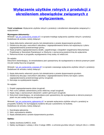 Wyłączenie użytków rolnych z produkcji z określeniem obowiązków związanych z wyłączeniem. Treść urzędowa: Wyłączenie użytków rolnych z produkcji z określeniem obowiązków związanych z wyłączeniem. Wymagane dokumenty: Wniosek ( gn_wn_wylaczenie_trwale.rtf ) w sprawie trwałego wyłączenia użytków rolnych z produkcji. Dodatkowo do wniosku należy dołączyć: 1. Kopię dokumentu własności gruntu lub oświadczenia o prawie dysponowania gruntem. 2. Ostateczną decyzję o warunkach zabudowy i zagospodarowania terenu lub wypis/wyrys z planu zagospodarowania przestrzennego gminy. 3. Kopię projektu zagospodarowania działki, uzgodnionego z Zespołem Uzgadniania Dokumentacji Projektowej w Starostwie Powiatowym w Olsztynie z zaznaczoną powierzchnią do wyłączenia. 4. Pełnomocnictwo w przypadku występowania innej osoby niż właściciel. Do wglądu: Dokument stwierdzający, że wnioskodawca jest upoważniony do występowania w obrocie prawnym jeżeli nie jest osobą fizyczną (oryginał). Wniosek ( gn_wn_wylaczenie_czasowe.rtf ) w sprawie czasowego wyłączenia użytków rolnych z produkcji. Dodatkowo do wniosku należy dołączyć: 1. Kopię dokumentu własności gruntu lub oświadczenia o prawie dysponowania gruntem. 2. Ostateczną decyzję o warunkach zabudowy i zagospodarowania terenu lub wypis z planu zagospodarowania przestrzennego gminy (oryginał). 3. Koncesja na wydobywanie kopalin. Do wglądu: 1. 2. 3. 4. Projekt zagospodarowania złoża (oryginał). Plan ruchu zakładu zatwierdzony przez właściwy urząd (oryginał). Kopię mapy z zaznaczonym obszarem i polem górniczym (oryginał). Dokument stwierdzający, że wnioskodawca jest upoważniony do występowania w obrocie prawnym jeżeli nie jest osobą fizyczną (oryginał). Wniosek ( gn_wn_wylaczenie_zgloszenie.rtf ) w sprawie wyłączenia użytków rolnych z produkcji w przypadku budowy nie wymagającej wydania decyzji o pozwoleniu na budowę. Dodatkowo do wniosku należy dołączyć: 1. Kserokopię zgłoszenia. 2. Szkic usytuowania obiektu. 3. Kopię oświadczenia o prawie dysponowania gruntem. Opłaty: 1. Opłata skarbowa – brak. 2. Opłaty wynikające z ustawy z dnia 3 lutego 1995r. o ochronie gruntów rolnych i leśnych (Dz.U. z 2004r. Nr 121, poz. 1266 z późn. zm.). Termin odpowiedzi: 2 tygodnie Tryb odwoławczy: Od wydanej decyzji przysługuje odwołanie do Samorządowego Kolegium Odwoławczego w Olsztynie za pośrednictwem Starosty Olsztyńskiego w terminie 14 dni od daty otrzymania decyzji. Odwołanie można złożyć w Biurze Obsługi Interesanta Starostwa Powiatowego w Olsztynie, Plac Bema 5 lub przesłać za pośrednictwem poczty. Podstawa prawna: ● ● Ustawa z dnia 3 lutego 1995r. o ochronie gruntów rolnych i leśnych (Dz.U. z 2004r. Nr 121, poz. 1266 z późn. zm.). Ustawa z dnia 14 czerwca 1960r. Kodeks postępowania administracyjnego (j.t. Dz.U. z 2000r. Nr 98 poz. 1071 z późn. zm.). Wykonanie zadania: Jednostka odpowiedzialna Referat Uwłaszczeń, Odszkodowań i Ochrony Gruntów Rolnych Pracownicy odpowiedzialni ● ● ● Sylwia Bastek – Referat Uwłaszczeń, Odszkodowań i Ochrony Gruntów Rolnych Olsztyn, Plac Bema 5 pokój 107 telefon: 523 28 87 godziny pracy: 7-15 Violetta Ostaszewska- Referat Uwłaszczeń, Odszkodowań i Ochrony Gruntów Rolnych Olsztyn, Plac Bema 5 pokój 107 telefon: 523 28 87 godziny pracy: 7 – 15 Magdalena Bąk – Referat Uwłaszczeń, Odszkodowań i Ochrony Gruntów Rolnych Olsztyn, Plac Bema 5 pokój 108 telefon: 521 05 29 godziny pracy: długotrwała nieobecność Drukuj