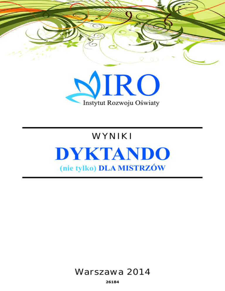 WYNIKI DYKTANDO (nie tylko) DLA MISTRZÓW Warszawa 2014 26184 Warszawa, 30.01.2015 r. Szanowni Szkolni Koordynatorzy DYKTANDA (nie tylko) DLA MISTRZÓW, Dziêkujemy za pomoc w organizacji ogólnopolskiego DYKTANDA (nie tylko) DLA MISTRZÓW. Na podstawie kart odpowiedzi uczestników dyktanda przygotowaliœmy szczegó³owe opracowanie wyników ka¿dego ucznia. Zestawienie zawiera informacje o iloœci zdobytych punktów i zajêtym miejscu. Dla uczniów, którzy uzyskali najlepsze wyniki w swojej kategorii, zosta³y przyznane nagrody: ? 1 miejsce - dyplom grawerowany i ksi¹¿ka, ? miejsca od 2 do 5 - dyplom laureata i ksi¹¿ka, ? miejsca od 6 do 15 - dyplom wyró¿nienia. Ponadto ka¿dy uczeñ, niezale¿nie od uzyskanego wyniku, otrzyma³ dyplom uznania potwierdzaj¹cy jego udzia³ w ogólnopolskim dyktandzie. Ka¿dy koordynator dyktanda otrzymuje zaœwiadczenie o przeprowadzeniu ogólnopolskiego, ponadprogramowego dyktanda w szkole. Organizator przewidzia³ równie¿ nagrodê dla szkó³, które zg³osi³y powy¿ej 120 uczestników. Szko³y te zostan¹ nagrodzone dyplomem grawerowanym. Wszystkim uczestnikom serdecznie gratulujemy osi¹gniêtych wyników i zapraszamy do kolejnych edycji olimpiad organizowanych przez Instytut Rozwoju Oœwiaty. Z powa¿aniem, 26/B przañska Naddnie Warszawa 3-01 04-205 22 517-1 -00, fax. u.pl 3 -1 7 1 5 tel. 22 w.iro.ed http://ww Zasady punktacji 1. Wype³nione przez uczestników karty odpowiedzi stanowi³y podstawê do oceny. 2. Ka¿dy test zosta³ podzielony na dwie czêœci. 3. Czêœæ I - Dyktando - w 30 wyrazach tekstu (20 dla poziomu 1) nale¿a³o wybraæ jedn¹ z dwóch zaproponowanych liter. 4. Za wybranie w³aœciwej litery uczeñ otrzyma³ (+1) punkt, za wybranie niew³aœciwej (-1) punkt. 5. Czêœæ II - Zasady i æwiczenia ortograficzne - 10 pytañ testowych z 4 odpowiedziami, z których co najmniej jedna by³a prawid³owa. 6. Ocenie podlega³a ka¿da odpowiedŸ w danym pytaniu. 7. Za poprawnie udzielon¹ odpowiedŸ uczestnik otrzyma³ (+1) punkt, a za b³êdnie udzielon¹ (-1) punkt. 8. W zwi¹zku z powy¿szym uczeñ za jedno pytanie móg³ maksymalnie uzyskaæ (+4) punkty, a minimalnie (-4) punkty. 9. Aby unikn¹æ ostatecznej ujemnej punktacji ka¿dy z uczestników dyktanda przystêpuj¹c do testu otrzyma³ awansem 70 punktów. 9. Punkty uzyskane przez uczestnika w Czêœci I i w Czêœci II zosta³y zsumowane. 10. Ka¿dy uczestnik dyktanda, niezale¿nie od uzyskanego wyniku, otrzyma³ dyplom uznania. 11. Najlepsi uczestnicy uhonorowani zostali dyplomami grawerowanymi, dyplomami laureata i wyró¿nienia oraz nagrodami ksi¹¿kowymi. 12. Przy przyznawaniu miejsc honorowane by³y miejsca ex aequo. 13. B³êdnie wype³niona karta odpowiedzi nie mo¿e stanowiæ podstawy do reklamacji. Organizator oœwiadcza jednak, ¿e dokona³ wszelkich starañ aby odczytaæ nieprawid³owo wype³nione karty odpowiedzi. Wyniki - Ranking ,PLĊ Nazwisko Suma punktów Miejsce Opis Dyktando - Poziom 2 Wiktoria Karcz 126 15 '\SORPZ\UyĪQLHQLD 0DáJRU]DWD Aleksandrzak 126 15 '\SORPZ\UyĪQLHQLD Kinga Mateja 124 17 Dyplom uznania Julia '\ĞNRZVND 115 26 Dyplom uznania Julia Szymczak 114 27 Dyplom uznania Olga Lipska 111 30 Dyplom uznania Julia Stachecka 110 31 Dyplom uznania Martyna '\ĞNRZVND 105 36 Dyplom uznania Ogólne Statystyki Test Maksimum Minimum ĝUHGQLD Liczba uczestników 6]NRáDSRGVWDZRZDL*LPQD]MXP Dyktando - Poziom 1 130 74 111 1155 Dyktando - Poziom 2 140 83 112 1799 Dyktando - Poziom 3 140 90 114 537 Liczba uczestników w podziale na województwa Klucz odpowiedzi do testów konkursowych - Dyktando (nie tylko) dla Mistrzów 2014 1 2 3 4 5 6 7 8 9 10 Poz.1 b a b b a a b b b b b Poz.2 a b b b a b b b a a Poz.3 a b a b b a b a b a 13 14 15 16 17 18 b a b b a a b a a - b a a a a b b b a b b a b b a b b a b a 11 12 19 20 23 24 25 26 27 28 29 30 - - - - - - - - a b a b a b b b a b b a b a b b 21 22 31 32 33 34 35 36 37 38 39 40 - abc bcd bd cd ac c bd c c d b a bc ab d b bd b a bc ad b c ad ad cd abcd ab c abcd cd abd abcdabcd