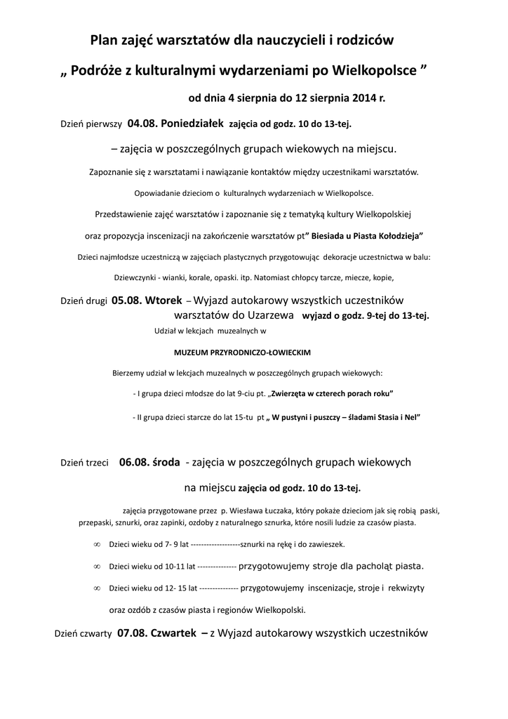 Plan zajęć warsztatów dla nauczycieli i rodziców „ Podróże z kulturalnymi wydarzeniami po Wielkopolsce ” od dnia 4 sierpnia do 12 sierpnia 2014 r. Dzień pierwszy 04.08. Poniedziałek zajęcia od godz. 10 do 13-tej. – zajęcia w poszczególnych grupach wiekowych na miejscu. Zapoznanie się z warsztatami i nawiązanie kontaktów między uczestnikami warsztatów. Opowiadanie dzieciom o kulturalnych wydarzeniach w Wielkopolsce. Przedstawienie zajęć warsztatów i zapoznanie się z tematyką kultury Wielkopolskiej oraz propozycja inscenizacji na zakończenie warsztatów pt” Biesiada u Piasta Kołodzieja” Dzieci najmłodsze uczestniczą w zajęciach plastycznych przygotowując dekoracje uczestnictwa w balu: Dziewczynki - wianki, korale, opaski. itp. Natomiast chłopcy tarcze, miecze, kopie, Dzień drugi 05.08. Wtorek – Wyjazd autokarowy wszystkich uczestników warsztatów do Uzarzewa wyjazd o godz. 9-tej do 13-tej. Udział w lekcjach muzealnych w MUZEUM PRZYRODNICZO-ŁOWIECKIM Bierzemy udział w lekcjach muzealnych w poszczególnych grupach wiekowych: - I grupa dzieci młodsze do lat 9-ciu pt. „Zwierzęta w czterech porach roku” - II grupa dzieci starcze do lat 15-tu pt „ W pustyni i puszczy – śladami Stasia i Nel” Dzień trzeci 06.08. środa - zajęcia w poszczególnych grupach wiekowych na miejscu zajęcia od godz. 10 do 13-tej. zajęcia przygotowane przez p. Wiesława Łuczaka, który pokaże dzieciom jak się robią paski, przepaski, sznurki, oraz zapinki, ozdoby z naturalnego sznurka, które nosili ludzie za czasów piasta. • Dzieci wieku od 7- 9 lat -------------------sznurki na rękę i do zawieszek. • Dzieci wieku od 10-11 lat --------------- przygotowujemy stroje dla pacholąt piasta. • Dzieci wieku od 12- 15 lat --------------- przygotowujemy inscenizacje, stroje i rekwizyty oraz ozdób z czasów piasta i regionów Wielkopolski. Dzień czwarty 07.08. Czwartek – z Wyjazd autokarowy wszystkich uczestników warsztatów do Giecza wyjazd o godz. 9-tej do 13-tej. Udział w lekcji muzealnej w REZERWACIE ARCHEOLOGICZNYM – GRÓD PIASTOWSKI W GIECZU Wszystkie grupy wiekowe dzieci biorą udział w zajęciach pt „ Jak Powstała Polska” Dzień piąty 08.08. Piątek - - zajęcia w poszczególnych grupach wiekowych na miejscu, zajęcia od godz. 10 do 13-tej. wszystkie grupy robią stroje, które będą wykorzystane przez uczestników balu na zakończenie warsztatów. • Dzieci wieku od 7- 9 lat -------------------wianeczki. bukieciki, ozdoby, korale itp. • Dzieci wieku od 10-11 lat --------------- wykańczamy stroje dla pacholąt piasta. • Dzieci wieku od 12- 15 lat --------------- próba do inscenizacji, stroje oraz przygotowane dekoracje sceny. Dzień szósty 09.08. Sobota - Wyjazd wszystkich uczestników warsztatów do Przybrodzina kolejką wąskotorową wyjazd o godz. 10-tej do 18-tej. Dzieci mają zbiórkę na dworcu Gnieźnieńskiej Kolejki Wąskotorowej o godz. 945 odjazd kolejki o godz. 10-tej. Wszystkie grupy wyjeżdżają pociągiem wąskotorowym z Gniezna do Przybrodzina. W czasie jazdy prowadzone są gry i zabawy z udziałem opiekunów poszczególnych grup. Materiały, zabawki, skakanki, piłki lub inne przedmioty zabaw dzieci przynoszą własne i pilnują ich. Ma miejscu zorganizowany jest grill z kiełbaską z chlebem oraz napoje i słodycze. Dzień siódmy 12.08. Wtorek bal z okazji zakończenia warsztatów od godz. 10 do 13-tej. Dzieci zapraszają rodziców, dziadków lub swoich opiekunów na wspólną zabawę. Dzieci przedstawią inscenizację pt ” pt” Biesiada u Piasta Kołodzieja” Na biesiadę do Piasta Kołodzieja przybywają goście z Wielkopolski, aby uczestniczyć w postrzyżynach syna piasta ZIEMOWITA. Bardzo mile widziane stroje średniowiecza nie tylko dla dzieci, lecz wszystkich uczestników biesiady. Rodziców prosimy o ciasto, słodycze na stół biesiadny dla wszystkich uczestników, którymi będą częstować dworki z grodu Piasta Kołodzieja. Sporządziła /-/ Bogumiła Orzechowska zatwierdziła /-/ Małgorzata Cichomska Szczepaniak