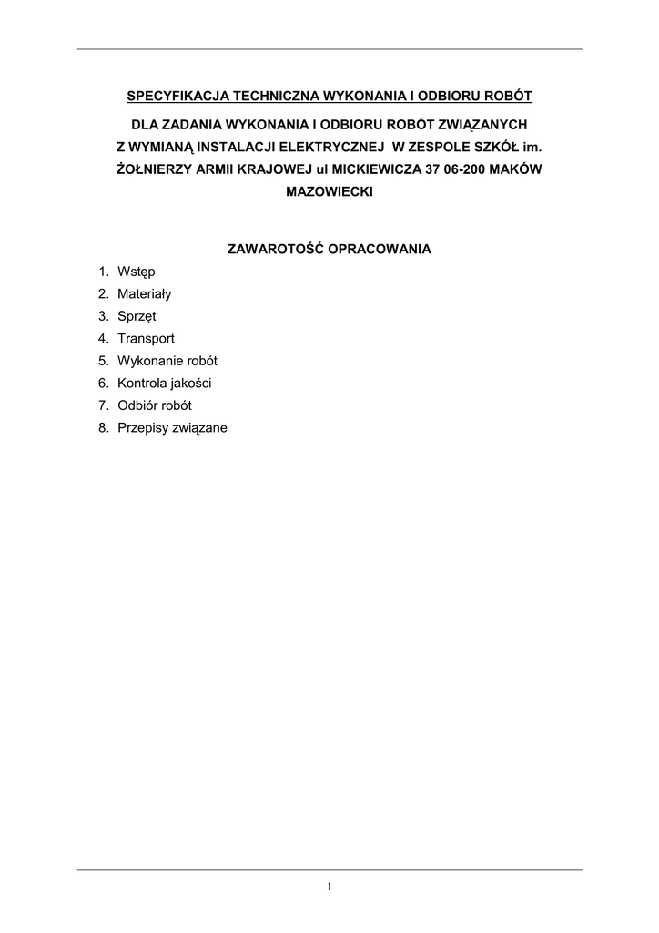 SPECYFIKACJA TECHNICZNA WYKONANIA I ODBIORU ROBÓT DLA ZADANIA WYKONANIA I ODBIORU ROBÓT ZWIĄZANYCH Z WYMIANĄ INSTALACJI ELEKTRYCZNEJ W ZESPOLE SZKÓŁ im. śOŁNIERZY ARMII KRAJOWEJ ul MICKIEWICZA 37 06-200 MAKÓW MAZOWIECKI ZAWAROTOŚĆ OPRACOWANIA 1. Wstęp 2. Materiały 3. Sprzęt 4. Transport 5. Wykonanie robót 6. Kontrola jakości 7. Odbiór robót 8. Przepisy związane 1 1. WSTĘP 1.1. Przedmiot Specyfikacji Technicznej Przedmiotem niniejszej części Specyfikacji Technicznej są wymagania dotyczące wykonania i odbioru Robót związanych z wymianą instalacji elektrycznych wewnętrznych. UWAGA: Inne materiały i urządzenia o parametrach odpowiadających tym, które zostały wymienione w Specyfikacji Technicznej, Przedmiarach Robót lub Dokumentacji Projektowej mogą zostać wykorzystane przy prowadzeniu przedsięwzięcia tylko po uzgodnieniu z Jednostką Projektową. 1.2. Zakres stosowania Specyfikacji Technicznej Specyfikacja Techniczna jest stosowana jako Dokument Przetargowy i Kontraktowy przy zleceniu i realizacji Robót wymienionych w punkcie 1.1. 1.3. Zakres Robót objętych Specyfikacją Techniczną Ustalenia zawarte w niniejszej Specyfikacji Technicznej dotyczą wykonania Robót wymienionych w punkcie 1.1 związanych z wymianą instalacji elektrycznych wewnętrznych. CPV:45315100-9 Instalacja elektryczna CPV:45312311-0 Instalacja oświetleniowa CPV:95310000-3 Próby montaŜowe 1.4. Określenia podstawowe Określenia podane w niniejszej Specyfikacji Technicznej są zgodne z właściwymi obowiązującymi przepisami, z Ogólną Specyfikacją Techniczną (OST) i właściwymi zharmonizowanymi Polskimi lub Europejskimi Normami, w szczególności: aparatura rozdzielcza i sterownicza – ogólna nazwa aparatów elektrycznych, a takŜe zespół tych aparatów ze związanym wyposaŜeniem, wewnętrznymi połączeniami, osprzętem, obudowami i konstrukcjami wsporczymi – słuŜących do łączenia, sterowania, pomiaru, zabezpieczeń i regulacji pracy obwodów elektrycznych; bezpieczniki topikowe-zabezpieczają przed przetęŜeniami, przede wszystkim przed skutkami zwarć. Na działanie, parametry i jakość bezpiecznika wpływają wszystkie jego części składowe, ale decydujący wpływ mają: topik, gasiwo, i korpus wkładki. główna szyna (zacisk) uziemiająca GSU szyna (zacisk) przeznaczona do przyłączenia do uziomu przewodów ochronnych, w tym przewodów połączeń wyrównawczych oraz przewodów uziemień roboczych, jeśli one występują. 2 instalacja elektryczna – zespół odpowiednio połączonych przewodów i kabli wraz ze sprzętem i osprzętem elektroinstalacyjnym, a takŜe urządzeniami oraz aparatami – przeznaczony do przesyłu, rozdziału, zabezpieczenia i zasilania odbiorników energii elektrycznej;. miejscowa szyna wyrównawcza MSW szyna (zacisk) przeznaczona do przyłączenia przewodów połączeń wyrównawczych. obciąŜalność prądowa długotrwała (przewodu) maksymalna wartość prądu, który moŜe płynąć długotrwale w określonych warunkach bez przekroczenia dopuszczalnej temperatury przewodu. obudowa; osłona element zapewniający ochronę przed niektórymi wpływami otoczenia i przed dotykiem bezpośrednim z dowolnej strony. obwód instalacji elektrycznej – zespół elementów instalacji elektrycznej wspólnie zasilanych i chronionych przed przetęŜeniami wspólnym zabezpieczeniem. obwód odbiorczy ( obwód końcowy) -jest to obwód, do którego przyłączone są bezpośrednio odbiorniki energii elektrycznej lub gniazda wtyczkowe. Głównymi elementami obwodu instalacji elektrycznej są przewody (tory prądowe) umoŜliwiające przesyłanie energii elektrycznej, łączniki umoŜliwiające załączanie i wyłączanie oraz zabezpieczenia chroniące elementy obwodu przed skutkami zakłóceń. obwód rozdzielczy - jest to obwód zasilający tablice rozdzielcze. W obiektach budowlanych rolę obwodów rozdzielczych pełnią wewnętrzne linie zasilające (WLZ). ochrona przed dotykiem bezpośrednim (podstawowa) – zespół środków technicznych, chroniących przed zetknięciem się człowieka lub zwierzęcia z częściami czynnymi oraz przed pojawieniem się napięcia na częściach nie znajdujących pod napięciem w warunkach normalnej pracy instalacji ochrona przed dotykiem pośrednim (dodatkowa) – zespół środków technicznych, chroniących przed, wynikłymi z uszkodzenia ochrony przeciwporaŜeniowej podstawowej, skutkami zetknięcia człowieka lub zwierzęcia z częściami przewodzącymi i/lub częściami obcymi. ochrona przeciwporaŜeniowa uzupełniająca ochrona polegająca na zastosowaniu dodatkowych urządzeń wyłączających np. róŜnicowoprądowych. oprawa oświetleniowa – urządzenie słuŜące do rozdziału, filtracji i przekształcania strumienia świetlnego wysyłanego przez źródło światła, zawierające wszystkie niezbędne detale do przymocowania i połączenia z instalacją elektryczną. oprzewodowanie przewód, przewody lub przewody szynowe i elementy zapewniające ich zamocowanie i ochronę przed uszkodzeniami mechanicznymi. oświetlenie awaryjne – oświetlenie elektryczne samoczynnie włączające się w przypadku wystąpienia przerwy w zasilaniu podstawowym, mające na celu zapewnienie dostatecznej widoczności w pomieszczeniach (oświetlenie bezpieczeństwa) oraz umoŜliwienie ewentualnej ewakuacji ludzi z budynku (oświetlenie ewakuacyjne). Oświetlenie awaryjne jest zasilane z awaryjnych niezaleŜnych źródeł zasilania poprzez niezaleŜne obwody oświetleniowe lub część obwodów oświetlenia podstawowego; połączenie wyrównawcze – elektryczne połączenie części przewodzących dostępnych i/lub części przewodzących obcych, wykonane w celu wyrównania potencjałów (ekwipotencjalizacji). 3 przewody - wyroby składające się z jednego lub kilku skręconych drutów albo jednej większej liczby Ŝył izolowanych bez powłoki, lub w zaleŜności od warunków, w których mają być zastosowane - z