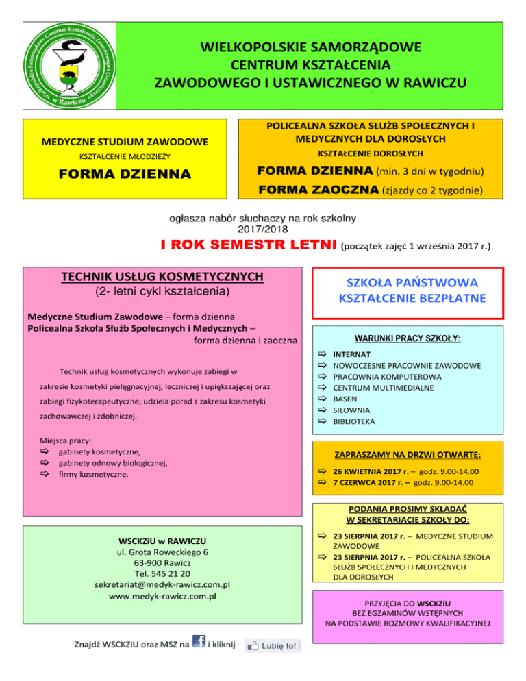 WIELKOPOLSKIE SAMORZĄDOWE CENTRUM KSZTAŁCENIA ZAWODOWEGO I USTAWICZNEGO W RAWICZU MEDYCZNE STUDIUM ZAWODOWE POLICEALNA SZKOŁA SŁUŻB SPOŁECZNYCH I MEDYCZNYCH DLA DOROSŁYCH KSZTAŁCENIE MŁODZIEŻY KSZTAŁCENIE DOROSŁYCH FORMA DZIENNA FORMA DZIENNA (min. 3 dni w tygodniu) FORMA ZAOCZNA (zjazdy co 2 tygodnie) ogłasza nabór słuchaczy na rok szkolny 2017/2018 I ROK SEMESTR LETNI (początek zajęć 1 września 2017 r.) TECHNIK USŁUG KOSMETYCZNYCH (2- letni cykl kształcenia) Medyczne Studium Zawodowe – forma dzienna Policealna Szkoła Służb Społecznych i Medycznych – forma dzienna i zaoczna Technik usług kosmetycznych wykonuje zabiegi w zakresie kosmetyki pielęgnacyjnej, leczniczej i upiększającej oraz zabiegi fizykoterapeutyczne; udziela porad z zakresu kosmetyki zachowawczej i zdobniczej. Miejsca pracy: gabinety kosmetyczne, gabinety odnowy biologicznej, firmy kosmetyczne. SZKOŁA PAŃSTWOWA KSZTAŁCENIE BEZPŁATNE WARUNKI PRACY SZKOŁY: INTERNAT NOWOCZESNE PRACOWNIE ZAWODOWE PRACOWNIA KOMPUTEROWA CENTRUM MULTIMEDIALNE BASEN SIŁOWNIA BIBLIOTEKA ZAPRASZAMY NA DRZWI OTWARTE: 26 KWIETNIA 2017 r. – godz. 9.00-14.00 7 CZERWCA 2017 r. – godz. 9.00-14.00 PODANIA PROSIMY SKŁADAĆ W SEKRETARIACIE SZKOŁY DO: WSCKZiU w RAWICZU ul. Grota Roweckiego 6 63-900 Rawicz Tel. 545 21 20 [email protected] www.medyk-rawicz.com.pl Znajdź WSCKZiU oraz MSZ na i kliknij 23 SIERPNIA 2017 r. – MEDYCZNE STUDIUM ZAWODOWE 23 SIERPNIA 2017 r. – POLICEALNA SZKOŁA SŁUŻB SPOŁECZNYCH I MEDYCZNYCH DLA DOROSŁYCH PRZYJĘCIA DO WSCKZiU BEZ EGZAMINÓW WSTĘPNYCH NA PODSTAWIE ROZMOWY KWALIFIKACYJNEJ