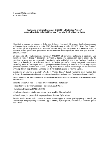 II Liceum Ogólnokształcące w Nowym Sączu Realizacja projektu flagowego UNESCO – „Baltic Sea Project” przez młodzież z koła Ligi Ochrony Przyrody II LO w Nowym Sączu Młodzież zrzeszona w szkolnym kole Ligi Ochrony Przyrody II Liceum Ogólnokształcącego w Nowym Sączu realizowała w roku 2015/2016 flagowy projekt UNESCO „Baltic Sea Project”. W ramach projektu prowadzono badania jakości wody (w połączeniu z projektem „Rzeki”), badania jakości powietrza, połączone z obserwacjami fenologicznymi oraz ekologią ptaków – projekt „Bocian”. W projekcie BSP wykorzystano materiały UNESCO jak również materiały z projektu „Air Pollution Project Europe” (program norweski). Łącznie w działaniach brało udział ok. 30 uczniów, pracujących w zespołach. Uczniowie m.in. zakładali stacje do badania kwaśnych deszczy w korelacji z określeniem ilości i rodzajów porostów; przygotowywali teoretyczne materiały na temat kwaśnych deszczy, przeprowadzali wywiady w instytucjach samorządowych, przede wszystkim, w Urzędzie Miasta i Gminy Nowy Sącz na temat monitoringu środowiska oraz w Małopolskim Inspektoracie Ochrony Środowiska (delegatura w Nowym Sączu). Uczniowie w oparciu o pakiety „Woda w Twojej Rzece” badali wybrane cieki wodne (na wybranych odcinkach ich biegu), również w kontekście kulturowym (historia, rolnictwo, itp.). Przeprowadzili też inwentaryzację gniazd bociana białego (we współpracy ze stowarzyszeniem Pro-Natura). Ponadto uczniowie klas I i II pisali prace semestralne na tematy: – Idea Rozwoju Zrównoważonego – założenia AGENDY 21; – Założenia Programu NATURA 2000; – Rodzaje, charakterystyka, zagrożenia i ochrona bioróżnorodności; – Charakterystyka przyrodniczo-geograficzna Beskidu Sądeckiego. Projekt realizowany był z zastosowaniem innowacyjnych metod pedagogicznych takich jak obserwacje, eksperymenty naukowe, gry i zabawy dydaktyczne, seminaria, akademie, prace semestralne.