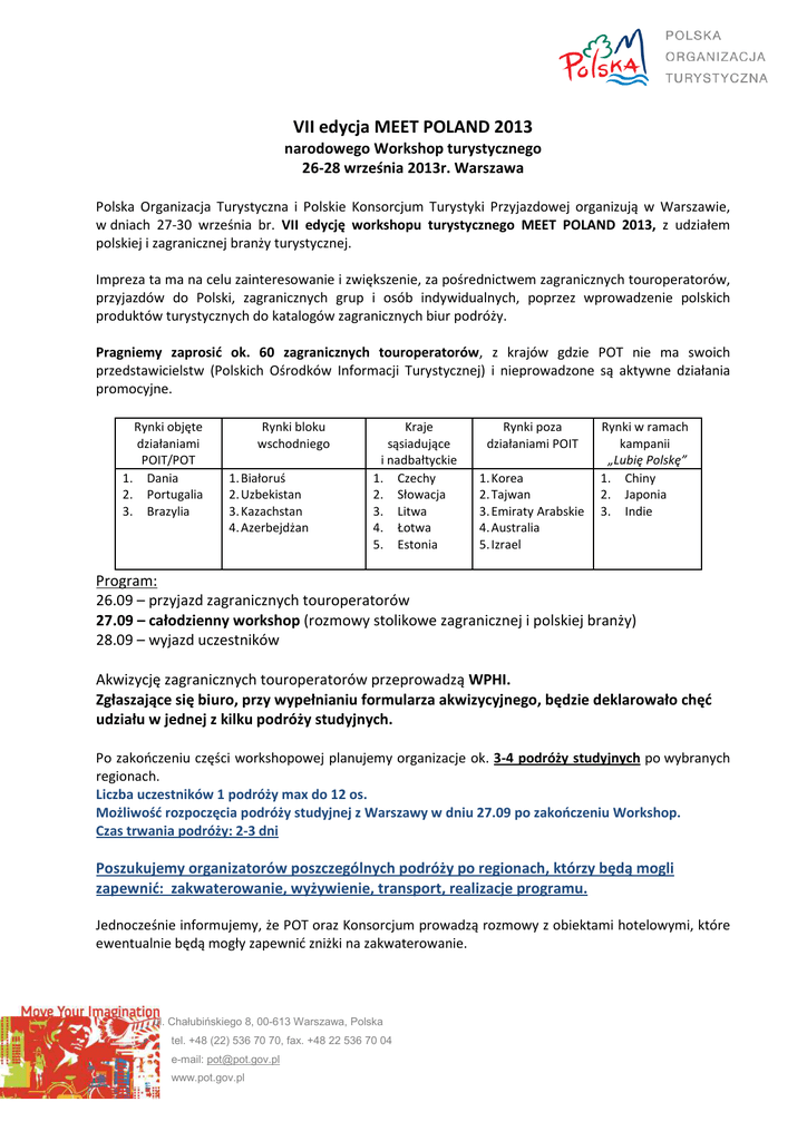VII edycja MEET POLAND 2013 narodowego Workshop turystycznego 26-28 września 2013r. Warszawa Polska Organizacja Turystyczna i Polskie Konsorcjum Turystyki Przyjazdowej organizują w Warszawie, w dniach 27-30 września br. VII edycję workshopu turystycznego MEET POLAND 2013, z udziałem polskiej i zagranicznej branży turystycznej. Impreza ta ma na celu zainteresowanie i zwiększenie, za pośrednictwem zagranicznych touroperatorów, przyjazdów do Polski, zagranicznych grup i osób indywidualnych, poprzez wprowadzenie polskich produktów turystycznych do katalogów zagranicznych biur podróży. Pragniemy zaprosić ok. 60 zagranicznych touroperatorów, z krajów gdzie POT nie ma swoich przedstawicielstw (Polskich Ośrodków Informacji Turystycznej) i nieprowadzone są aktywne działania promocyjne. Rynki objęte działaniami POIT/POT 1. Dania 2. Portugalia 3. Brazylia Rynki bloku wschodniego 1. Białoruś 2. Uzbekistan 3. Kazachstan 4. Azerbejdżan Kraje sąsiadujące i nadbałtyckie 1. Czechy 2. Słowacja 3. Litwa 4. Łotwa 5. Estonia Rynki poza działaniami POIT 1. Korea 2. Tajwan 3. Emiraty Arabskie 4. Australia 5. Izrael Rynki w ramach kampanii „Lubię Polskę” 1. Chiny 2. Japonia 3. Indie Program: 26.09 – przyjazd zagranicznych touroperatorów 27.09 – całodzienny workshop (rozmowy stolikowe zagranicznej i polskiej branży) 28.09 – wyjazd uczestników Akwizycję zagranicznych touroperatorów przeprowadzą WPHI. Zgłaszające się biuro, przy wypełnianiu formularza akwizycyjnego, będzie deklarowało chęć udziału w jednej z kilku podróży studyjnych. Po zakończeniu części workshopowej planujemy organizacje ok. 3-4 podróży studyjnych po wybranych regionach. Liczba uczestników 1 podróży max do 12 os. Możliwość rozpoczęcia podróży studyjnej z Warszawy w dniu 27.09 po zakończeniu Workshop. Czas trwania podróży: 2-3 dni Poszukujemy organizatorów poszczególnych podróży po regionach, którzy będą mogli zapewnić: zakwaterowanie, wyżywienie, transport, realizacje programu. Jednocześnie informujemy, że POT oraz Konsorcjum prowadzą rozmowy z obiektami hotelowymi, które ewentualnie będą mogły zapewnić zniżki na zakwaterowanie. ul. Chałubińskiego 8, 00-613 Warszawa, Polska tel. +48 (22) 536 70 70, fax. +48 22 536 70 04 e-mail: [email protected] www.pot.gov.pl W czasie realizacji podróży sugerujemy możliwość organizacji prezentacji regionu/miast oraz zaproszenie lokalnej branży turystycznej do udziału np. w kolacji. Tego typu kolacja daje możliwość bezpośredniego kontaktu oraz wymiany wizytówek. Wdzięczni będziemy za pomoc. KONTAKT: Biuro DOT