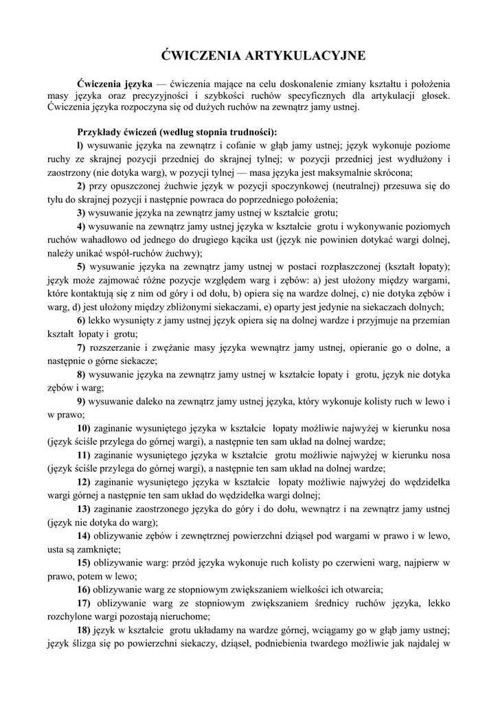 ĆWICZENIA ARTYKULACYJNE Ćwiczenia języka — ćwiczenia mające na celu doskonalenie zmiany kształtu i położenia masy języka oraz precyzyjności i szybkości ruchów specyficznych dla artykulacji głosek. Ćwiczenia języka rozpoczyna się od dużych ruchów na zewnątrz jamy ustnej. Przykłady ćwiczeń (według stopnia trudności): l) wysuwanie języka na zewnątrz i cofanie w głąb jamy ustnej; język wykonuje poziome ruchy ze skrajnej pozycji przedniej do skrajnej tylnej; w pozycji przedniej jest wydłużony i zaostrzony (nie dotyka warg), w pozycji tylnej — masa języka jest maksymalnie skrócona; 2) przy opuszczonej żuchwie język w pozycji spoczynkowej (neutralnej) przesuwa się do tyłu do skrajnej pozycji i następnie powraca do poprzedniego położenia; 3) wysuwanie języka na zewnątrz jamy ustnej w kształcie grotu; 4) wysuwanie na zewnątrz jamy ustnej języka w kształcie grotu i wykonywanie poziomych ruchów wahadłowo od jednego do drugiego kącika ust (język nie powinien dotykać wargi dolnej, należy unikać współ-ruchów żuchwy); 5) wysuwanie języka na zewnątrz jamy ustnej w postaci rozpłaszczonej (kształt łopaty); język może zajmować różne pozycje względem warg i zębów: a) jest ułożony między wargami, które kontaktują się z nim od góry i od dołu, b) opiera się na wardze dolnej, c) nie dotyka zębów i warg, d) jest ułożony między zbliżonymi siekaczami, e) oparty jest jedynie na siekaczach dolnych; 6) lekko wysunięty z jamy ustnej język opiera się na dolnej wardze i przyjmuje na przemian kształt łopaty i grotu; 7) rozszerzanie i zwężanie masy języka wewnątrz jamy ustnej, opieranie go o dolne, a następnie o górne siekacze; 8) wysuwanie języka na zewnątrz jamy ustnej w kształcie łopaty i grotu, język nie dotyka zębów i warg; 9) wysuwanie daleko na zewnątrz jamy ustnej języka, który wykonuje kolisty ruch w lewo i w prawo; 10) zaginanie wysuniętego języka w kształcie łopaty możliwie najwyżej w kierunku nosa (język ściśle przylega do górnej wargi), a następnie ten sam układ na dolnej wardze; 11) zaginanie wysuniętego języka w kształcie grotu możliwie najwyżej w kierunku nosa (język ściśle przylega do górnej wargi), a następnie ten sam układ na dolnej wardze; 12) zaginanie wysuniętego języka w kształcie łopaty możliwie najwyżej do wędzidełka wargi górnej a następnie ten sam układ do wędzidełka wargi dolnej; 13) zaginanie zaostrzonego języka do góry i do dołu, wewnątrz i na zewnątrz jamy ustnej (język nie dotyka do warg); 14) oblizywanie zębów i zewnętrznej powierzchni dziąseł pod wargami w prawo i w lewo, usta są zamknięte; 15) oblizywanie warg: przód języka wykonuje ruch kolisty po czerwieni warg, najpierw w prawo, potem w lewo; 16) oblizywanie warg ze stopniowym zwiększaniem wielkości ich otwarcia; 17) oblizywanie warg ze stopniowym zwiększaniem średnicy ruchów języka, lekko rozchylone wargi pozostają nieruchome; 18) język w kształcie grotu układamy na wardze górnej, wciągamy go w głąb jamy ustnej; język ślizga się po powierzchni siekaczy, dziąseł, podniebienia twardego możliwie jak najdalej w kierunku jamy gardłowej, a następnie w ten sam sposób powraca do pozycji wyjściowej; 19) język w kształcie łopaty układamy na wardze górnej, wciągamy go w głąb jamy ustnej; język ślizga się po powierzchni siekaczy, dziąseł, podniebienia twardego możliwie jak najdalej w kierunku jamy gardłowej, a następnie w ten sam sposób powraca do pozycji wyjściowej; 20) przy opuszczonej żuchwie ruch języka na przemian do górnych i dolnych dziąseł; 21) przy otwartej jamie ustnej przód języka dotyka na przemian ostatnich zębów trzonowych po obu stronach żuchwy i szczęki (unikać współruchów żuchwy). 22) Dotykanie zaostrzonym przodem języka różnych punktów w jamie ustnej: poszczególnych górnych i dolnych zębów, podniebienia twardego i miękkiego; 23) ułożenie języka w kształcie rulonika; 24) język ułożony w kształcie rulonika, dmuchamy w ten sposób, że powietrze przepływa tylko przez rulonik; 25) przy nieruchomym języku w kształcie rulonika rozciągamy wargi na boki; 26) (ćwiczenie przygotowujące do artykulacji i s, z) język ułożony w kształcie rulonika wewnątrz jamy ustnej tuż za zębami; po zbliżeniu siekaczy i spłaszczeniu warg dmuchać powietrze przez rulonik 27) kilkakrotnie zagwizdać; 28) ułożenie języka w kształcie łyżeczki; 29) (ćwiczenie przygotowujące do artykulacji sz, ż), przy układzie języka w kształcie łyżeczki wewnątrz jamy ustnej zbliżamy siekacze, zaokrąglamy wargi i dmuchamy na język; jeśli boki języka zostaną dociągnięte do górnych zębów otrzymamy prawidłowe brzmienie głosek szumiących; 30) (ćwiczenie przygotowujące do artykulacji głosek k, g) unoszenie i opuszczanie tyłu języka; przód języka opiera się o dolne zęby lub dziąsła, tył języka wykonuje rytmiczne ruchy, unosząc się i opadając na dno jamy ustnej; 31) przyciskanie górnej powierzchni przodu języka do podniebienia twardego tuż za dziąsłami; Boki języka zakrywają zęby górne; przy tym układzie należy opuszczać i unosić żuchwę; 32) przyciskanie górnej powierzchni przodu języka do podniebienia twardego tuż za dziąsłami; boki języka zakrywają. zęby górne; przy lekko opuszczonej szczęce, nagłe oderwanie języka od podniebienia z charakterystycznym szmerem (mlaskanie); 33) przyciskanie górnej powierzchni przodu języka do podniebienia twardego tuż za dziąsłami; boki języka zakrywają zęby górne; przy tym układzie spłaszczanie i zaokrąglanie warg przy podniesionej i opuszczonej szczęce; 34) język ułożony płasko przylega do bocznych zębów i dziąseł szczęki górnej, luźny przód języka wykonuje ruch do zębów górnych i dolnych, następnie do górnych i dolnych dziąseł; 35) (ćwiczenie przygotowujące do artykulacji głoski r) język ułożo