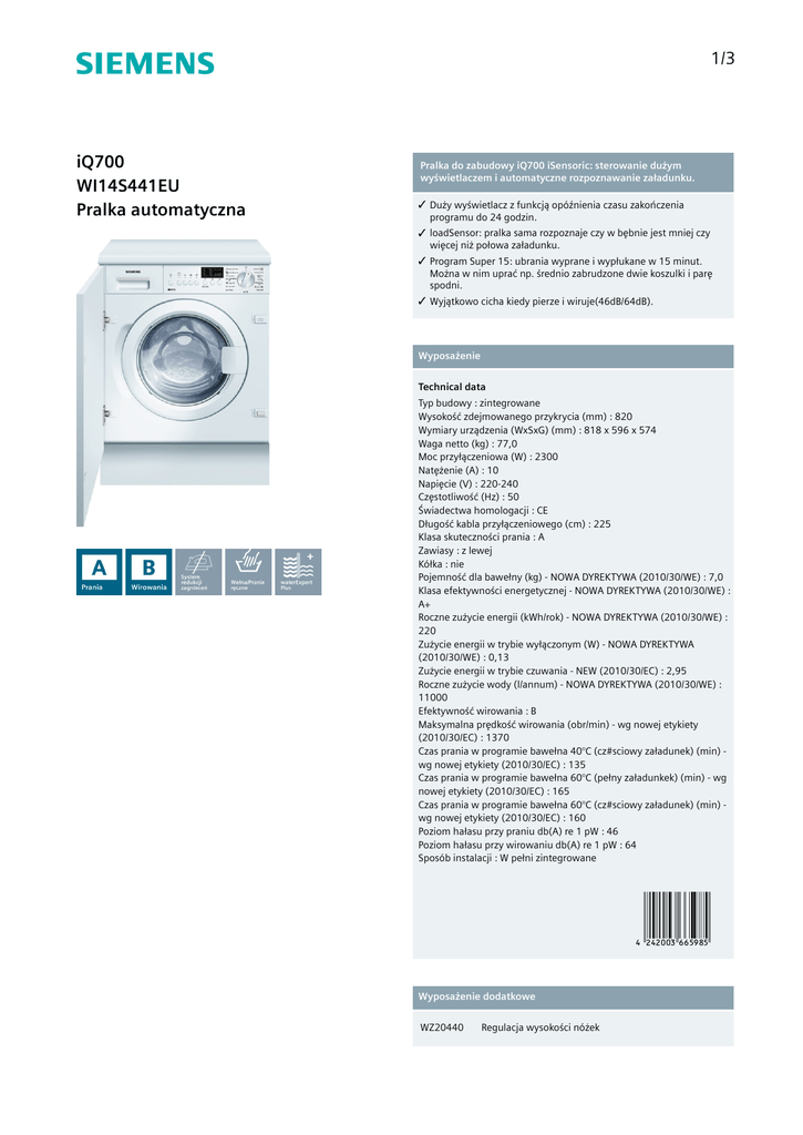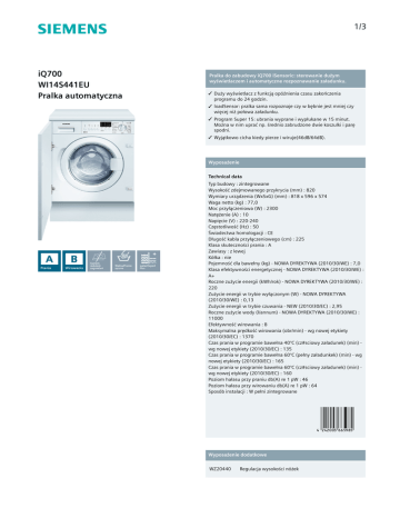 1/3 iQ700 WI14S441EU Pralka automatyczna Pralka do zabudowy iQ700 iSensoric: sterowanie dużym wyświetlaczem i automatyczne rozpoznawanie załadunku. ✓ Duży wyświetlacz z funkcją opóźnienia czasu zakończenia programu do 24 godzin. ✓ loadSensor: pralka sama rozpoznaje czy w bębnie jest mniej czy więcej niż połowa załadunku. ✓ Program Super 15: ubrania wyprane i wypłukane w 15 minut. Można w nim uprać np. średnio zabrudzone dwie koszulki i parę spodni. ✓ Wyjątkowo cicha kiedy pierze i wiruje(46dB/64dB). Wyposażenie Technical data Typ budowy : zintegrowane Wysokość zdejmowanego przykrycia (mm) : 820 Wymiary urządzenia (WxSxG) (mm) : 818 x 596 x 574 Waga netto (kg) : 77,0 Moc przyłączeniowa (W) : 2300 Natężenie (A) : 10 Napięcie (V) : 220-240 Częstotliwość (Hz) : 50 Świadectwa homologacji : CE Długość kabla przyłączeniowego (cm) : 225 Klasa skuteczności prania : A Zawiasy : z lewej Kółka : nie Pojemność dla bawełny (kg) - NOWA DYREKTYWA (2010/30/WE) : 7,0 Klasa efektywności energetycznej - NOWA DYREKTYWA (2010/30/WE) : A+ Roczne zużycie energii (kWh/rok) - NOWA DYREKTYWA (2010/30/WE) : 220 Zużycie energii w trybie wyłączonym (W) - NOWA DYREKTYWA (2010/30/WE) : 0,13 Zużycie energii w trybie czuwania - NEW (2010/30/EC) : 2,95 Roczne zużycie wody (l/annum) - NOWA DYREKTYWA (2010/30/WE) : 11000 Efektywność wirowania : B Maksymalna prędkość wirowania (obr/min) - wg nowej etykiety (2010/30/EC) : 1370 Czas prania w programie bawełna 40°C (cz#sciowy załadunek) (min) wg nowej etykiety (2010/30/EC) : 135 Czas prania w programie bawełna 60°C (pełny załadunkek) (min) - wg nowej etykiety (2010/30/EC) : 165 Czas prania w programie bawełna 60°C (cz#sciowy załadunek) (min) wg nowej etykiety (2010/30/EC) : 160 Poziom hałasu przy praniu db(A) re 1 pW : 46 Poziom hałasu przy wirowaniu db(A) re 1 pW : 64 Sposób instalacji : W pełni zintegrowane '!2E20AD-g fjif! Wyposażenie dodatkowe WZ20440 Regulacja wysokości nóżek 2/3 iQ700 WI14S441EU Pralka automatyczna Wyposażenie Wydajność i zużycie ● Udogodnienie do dozowania żeli do prania ● Załadunek: 7 kg ● Sygnał akustyczny informujący o zakończeniu programu ● Efektywność energetyczna: A+ ● ● ● ● ● Zużycie energii 220 kWh/rok przy 220 cyklach standardowych 60°C i 40°C w programie Bawełna, przy pełnym i częściowym załadunku, z uwzględnieniem funkcji stand-by. Rzeczywiste zużycie zależy od sposobu korzystania z urządzenia. Zużycie energii w programie bawełna 60 °C 0.95 kWh przy pełnym załadunku i 1.01 kWh przy częściowym załadunku w programie bawełna 40 °C 0.86 kWh przy częściowym załadunku Zużycie energii off-mode / left-on mode: 0.13 W / 2.95 W Zużycie wody 11000 l na rok przy 220 standardowych cyklach prania w programie bawełna 60°C i 40°C przy pełnym i częściowym załadunku. ● Efektywność wirowania: B ● Max. prędkość wirowania: 1400 obrotów/min. ● ● Programy Bawełna/kolory 40° Eco + Eco i Bawełna/kolory 60° Eco + Eco , przy których bada się przeciętne zużycie energii to standardowe ustawienia, które zaleca się do średnio-zabrudzonego prania jako najbardziej efektywne i energooszczędne w rozumieniu efektów prania i zużycia prądu i wody. Czas trwania programów standardowych w badaniu zużycia energii to 165 min dla progamu bawełna 60 °C (przy pełnym i połowie załadunku) oraz programu bawełna 40 °C (przy pełnym i połowie załadunku). ● Poziom hałasu pranie dB (A) re 1 pW: 46 ● Poziom hałasu wirowanie dB (A) re 1 pW: 64 ● W pełni zintegrowane Programy i funkcje ● Programy specjalne: Anty-alergia, Koszule Business, Super15, Outdoor, powerWash 60, Mix, Wełna, Delikatne/Jedwab Opcje ● Przyciski: Start, Pranie wstępne, Mniej zagnieceń, Dodatkowe płukanie, Temperatura, Redukcja obrotów wirowania, Opóźnienie czasu startu Komfort i bezpieczeństwo ● ● ● aquaStop Duży display z informacją o przebiegu programu, temperaturze, obrotach wirowania, czasie do końca prania oraz zaprogramowaniu opóźnienia startu do 24 h W pełni elektroniczne sterowanie za pomocą jednego pokrętła dla wszystkich programów ● waterExpert: automatyczne rozpoznawanie załadunku ● Sensor kontroli ilości piany ● Sensor wyważenia prania ● Maty redukujące hałas ● Dodatkowe wyciszenie ● System wyważania urządzenia Średnica drzwi pralki: 30 cm; kolor ramy okna: Białe; kąt otwarcia drzwi: 130° ● Obustronny montaż frontu meblowego ● Metalowy hak przy drzwiach Informacje techniczne ● Regulowana wysokość podstawy: 15 cm ● Regulowana głębokość podstawy: 6.5 cm ● Wymiary (W x SZ x G): 81.8 x 60 x 57 cm 3/3 iQ700 WI14S441EU Pralka automatyczna Rysunki wymiarowe