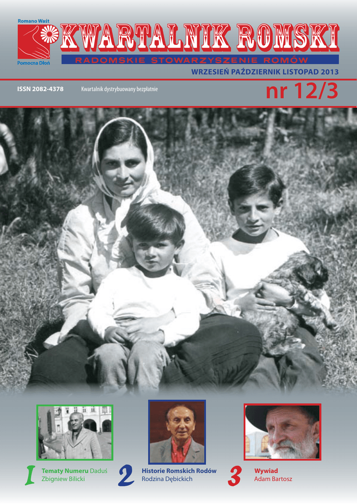 Romano Waśt Pomocna Dłoń WRZESIEŃ PAŹDZIERNIK LISTOPAD 2013 ISSN 2082-4378 Kwartalnik dystrybuowany bezpłatnie Tematy Numeru Daduś Zbigniew Bilicki Historie Romskich Rodów Rodzina Dębickich nr 12/3 Wywiad Adam Bartosz OD REDAKCJI / SPIS TREŚCI / STOPKA AKTUALNOŚCI W numerze Od redakcji Redakcja kwartalnika z niepokojem obserwuje ostatnie doniesienia mediów o brutalnych atakach, których ofiarami jest społeczność romska. Andrychów, Łódź, Wrocław o tych miejscach mówi się najczęściej. Wśród niektórych internautów szerzy się nagonka na Romów w postaci upokarzających filmików i komentarzy. W wielu sytuacjach próba przeciwdziałania takim treściom doprowadza do jeszcze ostrzejszych reakcji. Staramy się dowiedzieć gdzie leży przyczyna takich zachowań i często używanej „mowy nienawiści”, czy winny jest kryzys i to, że żyje się gorzej? Czy budzi on w ludziach coraz większą frustracje? Czy powody są całkiem inne? Z tą refleksją pozostawiamy naszych czytelników, zapraszając do lektury dwunastego numeru kwartalnika. Tematy Numeru Daduś – Zbigniew Bilicki roku, w warszawskiej Narodowej Galerii Sztuki Historie Romskich Rodów Rodzina Dębickich Własność i wydawca: Radomskie Stowarzyszenie Romów ul. Twarda 13, 26-600 Radom www.romowieradom.pl www.romanowast.pl Zespół redakcyjny: Redaktor naczelny: Agnieszka M. Caban Redaktor działu publicystycznego: dr Justyna Garczyńska Redaktor działu poradniczo-informacyjnego: Magdalena Nowak Współpraca:Jan Adamowski, Adam Bartosz, Agnieszka J. Kowarska, Grzegorz Kondrasiuk, Jacek Milewski, Stanisław Stankiewicz, Marcin Wosik Publikowane w Kwartalniku Romskim artykuły są recenzowane Recenzent numeru 12/3 2013: prof. dr hab. Jan Adamowski Projekt i skład: Mariusz Malczewski Druk: PRINTY POLAND Tadeusz Porzyczka, ul. M.C. Skłodowskiej 5, 26-600 Radom. Na okładce: Rodzina romska z Radomia, lata 60. XX wiek Nakład: 500 egz. „Zachęta” dostępna jest wystawa „Domy srebrne jak namioty”. To dosyć rzadkie i nietypowe Wieczór poezji polsko – romskiej w Łaźni W dniu 19 września w Radomiu w „Łaźni” przy ulicy Żeromskiego w Radomiu odbył się wieczór poezji polsko-romskiej. Spotkanie za- wydarzenie ma przede wszystkim przybliżyć sztukę romską, ale i wyprowadzić romską tematykę z marginesów do głównego dyskursu społecznego, politycznego, ekonomicznego Wywiad Adam Bartosz i estetycznego. Dzięki temu problemy, które dotyczą Romów zostaną zauważone. Wystawa jest zbiorem sztychów, fotografii i obrazów (powstałych od XIX do XX wieku). Tematyka jest różnorodna, w pracach starszych artystów widoczny jest stereotypowy obraz Cyganów, Redaktoro naczelno Stopka redakcyjna Domy srebrne jak namioty Przez dwa miesiące, od 15.10-15.12.2013 Jame redakcja kwartalnikoskry dykhas so pes kereł, śunas so doligiren ke jamare kana medii. Śunas kaj sy ataki pe romendyr. Andrychów, Łódźia, Wrocław, dre dała fory najbutedyr sy chyria. Internauty skharen pes pe romendyr, keren chyria filmiki i chyria ćhynen. Jamaro rakiryben nałen peske ke dźij. Zadas peske pućiben, karyg dźał da nienawiść. Kon sy bango?... Czy da bida sawy jaweł pe manuśiendyr, nani buća, brakinen łowe i gadźie, odmaren pe skry frustracja?... Roden bakres sawo sy odphendło. A może, powody sy wawyrćhane? Mekhas tumen dałesa so naćhyndźam dre dawa numero kwartalnikoskro i den apre. Agnieszka Mirosława Caban Aktualności natomiast współcześni artyści wprowadzają Spis treści w dyskurs swoich prac, m.in. integrację, komentarz do zagłady Romów, nomadyzm jako Aktualności . . . . . . . . . . . . . . . . . . . . . . . . . . . . . . . . . 3 alternatywny sposób na życie. Oprócz prac Wydarzenia . . . . . . . . . . . . . . . . . . . . . . . . . . . . . . . . . 9 znanych artystów są również prace anonimo- Tematy numeru . . . . . . . . . . . . . . . . . . . . . . . . . . . . 13 we. Wystawa została zrealizowana przy wspar- Historie Romskich Rodów . . . . . . . . . . . . . . . . . . . 15 Wywiad . . . . . . . . . . . . . . . . . . . . . . . . . . . . . . . . . . . . 22 Recenzje . . . . . . . . . . . . . . . . . . . . . . . . . . . . . . . . . . . 24 Romskie profesje . . . . . . . . . . . . . . . . . . . . . . . . . . . 26 ciu Mondriaan Fund i Ambasady Królestwa Niderlandów w Warszawie. Partnerem programu edukacyjnego jest British Council i Dialog Pheniben. Sponsorami wernisażu są DeLonghi, Kenwood, Freixenet. Patronat medialny Romanipen . . . . . . . . . . . . . . . . . . . . . . . . . . . . . . . . 30 sprawują: Polskie Radio, The Warsaw Voice, Młodzież romska pisze . . . . . . . . . . . . . . . . . . . . . 31 Stolica, Artinfo.pl Zdjęcie udostępnione przez grupę poetycką “Eliksir” inicjowała grupa poetycka „Eliksir”, do której należą Anna Łęcka i Andrzej Mędrzycki. Spotkanie cieszyło się dużym zainteresowaniem i zgromadziło sporą publiczność. Wiersze autorstwa grupy Eliksir recytowane były w języku romskim przez Marzenę Kwiatkowską oraz jej córkę Lawinię. Dodatkowo została stworzona oprawa filmowa o tematyce romskiej, która doskonale komponowała się z utworami. Prowa- Praktyczne porady . . . . . . . . . . . . . . . . . . . . . . . . . 32 Z życia wzięte . . . . . . . . . . . . . . . . . . . . . . . . . . . . . . 34 Paramisi romane . . . . . . . . . . . . . . . . . . . . . . . . . . . 36 Cygański humor . . . . . . . . . . . . . . . . . . . . . . . . . . . . 39 Galeria . . . . . . . . . . . . . . . . . . . . . . . . . . . . . . . . . . . . 40 Romano Waśt KAPITAŁ LUDZKI Zdjęcie udostępnione przez grupę poetycką “Eliksir” NARODOWA STRATEGIA SPÓJNOŚCI Pomocna Dłoń Czasopismo współfinansowane ze środków Unii Europejsk iej w ramach Europejsk iego Funduszu Społecznego 2 KWARTALNIK ROMSKI / NR 12/3 2013 KWARTALNIK ROMSKI / NR 12/3 2013 3 AKTUALNOŚCI AKTUALNOŚCI dzący wieczór na sam koniec przeczytali wiersze najsłynniejszej