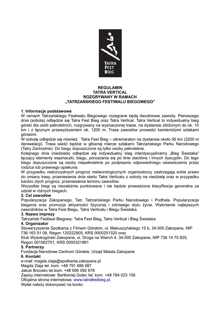 REGULAMIN TATRA VERTICAL ROZGRYWANY W RAMACH „TATRZAŃSKIEGO FESTIWALU BIEGOWEGO” 1. Informacje podstawowe W ramach Tatrzańskiego Festiwalu Biegowego rozegrane będą dwudniowe zawody. Pierwszego dnia (sobota) odbędzie się Tatra Fest Bieg oraz Tatra Vertical. Tatra Vertical to indywidualny bieg górski dla osób pełnoletnich, rozgrywany na wyznaczonej trasie, na dystansie zbliżonym do ok. 10 km i z łącznym przewyższeniem ok. 1200 m. Trasa zawodów prowadzi kamienistymi szlakami górskimi. W sobotę odbędzie się również. Tatra Fest Bieg – ultramaraton na dystansie około 56 km (3200 m deniwelacji). Trasa wieść będzie w głównej mierze szlakami Tatrzańskiego Parku Narodowego (Tatry Zachodnie). Do biegu dopuszczone są tylko osoby pełnoletnie. Kolejnego dnia (niedziela) odbędzie się indywidualny bieg interdyscyplinarny „Bieg Świstaka” łączący elementy wspinaczki, biegu, poruszania się po linie slackline i innych dyscyplin. Do tego biegu dopuszczone są osoby niepełnoletnie po podpisaniu odpowiedniego oświadczenia przez rodzica lub prawnego opiekuna. W przypadku niekorzystnych prognoz meteorologicznych organizatorzy zastrzegają sobie prawo do zmiany trasy, przeniesienia dnia startu Tatra Verticalu z soboty na niedzielę oraz w przypadku bardzo złych prognoz, przeniesienia terminu zawodów. Wszystkie biegi są niezależnie punktowane i nie będzie prowadzona klasyfikacja generalna za udział w różnych biegach. 2. Cel zawodów Popularyzacja Zakopanego, Tatr, Tatrzańskiego Parku Narodowego i Podhala. Popularyzacja biegania oraz promocja aktywności fizycznej i zdrowego stylu życia. Wyłonienie najlepszych zawodników w Tatra Fest Biegu, Tatra Verticalu i Biegu Świstaka 3. Nazwa imprezy Tatrzański Festiwal Biegowy: Tatra Fest Bieg, Tatra Vertical i Bieg Świstaka 4. Organizator Stowarzyszenie Spotkania z Filmem Górskim, ul. Makuszyńskiego 15 b, 34-500 Zakopane, NIP 736 163 51 08, Regon 120222905, KRS 0000251320 oraz Klub Wysokogórski Zakopane, ul. Droga na Wierch 4, 34-500 Zakopane, NIP 736 14 70 825, Regon 001062701, KRS 0000321961 5. Partnerzy Fundacja Narodowe Centrum Górskie, Urząd Miasta Zakopane 6. Kontakt e-mail: [email protected] Magda Ziaja tel. kom. +48 791 686 987 Jakub Brzosko tel.kom. +48 695 092 678 Zapisy internetowe: Bartłomiej Golec tel. kom. +48 784 023 156 Oficjalna strona internetowa: www.tatrafestbieg.pl, Wpłat należy dokonywać na konto: Fundacja Narodowe Centrum Górskie Zawoja 833, 34-222 Zawoja Alior Bank, Nr rachunku 94 2490 0005 0000 4520 7269 5656 W tytule przelewu: imię i nazwisko, TatraVertical 2016 7. Termin i program imprezy 12-14.08.2016 PIĄTEK 12.08.2016 godz. 17.00-20.00 rejestracja zawodników, wydawanie pakietów startowych i numerów (Plac Niepodległości) godz. 20.00 odprawa zawodników Tatra Fest Biegu (Plac Niepodległości/Zakopane) SOBOTA 13.08.2016 godz. 7:00-8:30 rejestracja zawodników, wydawanie pakietów startowych i numerów (Plac Niepodległości) godz. 8:45 wyjazd zawodników busem do Dol. Chochołowskiej z Placu Niepodległości. godz. 09:30 zbiórka, Polana Huciska godz. 09.30 - 09.45 weryfikacja obowiązkowego sprzętu godz. 10:00 start, Polana Huciska godz. 13.00 limit na szczycie Wołowca godz. 14:30 wyjazd z parkingu przy Dol. Chochołowskiej do Zakopanego godz. 14.00 - 17.00 wydawanie ciepłych posiłków na mecie, Plac Niepodległości/Zakopane godz. 17.00 uroczystość wręczenia nagród, Plac Niepodległości/Zakopane godz. 12.00 - 15.00 zawody dla dzieci, warsztaty, strefa fizjo na Placu Niepodległości/Zakopane NIEDZIELA, 14.08.2016 godz. 9.00 - 10.00 zapisy na Bieg Świstaka i wydawanie numerów startowych na Polanie Biały Potok/u wylotu doliny Lejowej godz. 10.30 start spod wyciągu na Polanie Biały Potok/u wylotu doliny Lejowej godz. 13.00 uroczyste wręczenie nagród godz. 11.00 - 15.00 zawody dla dzieci, warsztaty, strefa rekreacji 8. Warunki uczestnictwa 1. Uczestnikiem Tatra Verticalu może zostać osoba (zgodnie z pkt. 1. regulaminu), która prześle na adres Organizatora wypełnioną kartę zgłoszeniową opublikowaną na stronie internetowej: www.tatrafestbieg.pl. Wypełniając kartę zgłoszeniową (w formie elektronicznej lub pisemnej) uczestnik akceptuje warunki Organizatora. Dodatkowo podczas odbioru pakietu startowego uczestnik zobowiązany jest do podpisania oświadczenia o akceptacji regulaminu i o posiadaniu aktualnego ubezpieczenia NNW na terenie Polski i Słowacji. 2. Organizatorzy (czyli wszystkie osoby biorące udział w organizacji Tatra Verticalu) nie ponoszą odpowiedzialności względem uczestników za szkody osobowe, rzeczowe i majątkowe, które wystąpią przed, w trakcie lub po zawodach. Uczestnicy startują na własną odpowiedzialność i ponoszą pełną odpowiedzialność cywilną i prawną za wszystkie szkody przez siebie wyrządzone, w tym w wyniku nabytych kontuzji na trasie zawodów. Przez akceptację deklaracji zawartej na karcie zgłoszeniowej uczestnicy zrzekają się prawa dochodzenia prawnego lub zwrotu wpisowego od Organizatora lub jego zleceniobiorców w razie wypadku lub szkody związanej z zawodami. 3. Większość trasy zawodów prowadzi w górskim, trudno dostępnym terenie, w którym udzielenie pomocy specjalistycznych służb ratowniczych może wiązać się z długim oczekiwaniem. W sytuacji wypadku każdy z uczestników biegu jest zobowiązany do wezwania pomocy oraz udzielenia pomocy doraźnej poszkodowanemu biegaczowi. 4. Uczestnik wyraża zgodę na realizację zdjęć, nagrań filmowych oraz wywiadów z jego udziałem, a także na wykorzystanie oficjalnych wyników (zawierających dane osobowe) przez prasę, radio i telewizję. 5. Swoim zgłoszeniem i akceptacją warunków uczestnictwa zawodnik zapewnia, że zapoznał się ze wszystkimi warunkami regulaminu zawodów i wypełnił formularz zgłoszeniowy. 6. Uczestnik wyraża zgodę na przetwarzanie swoich danych osobowych do celów przeprowadzenia zawodów Tatra Vertical 