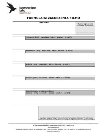 FORMULARZ ZGŁOSZENIA FILMU tytuł filmu: Numer zgłoszenia (wypełnia organizator) ............................... reżyseria (imię - nazwisko - adres - telefon - e-mail): scenariusz (imię - nazwisko - adres - telefon - e-mail): zdjęcia (imię - nazwisko - adres - telefon - e-mail): montaż (imię - nazwisko - adres - telefon - e-mail): dokładne dane producenta filmu (nazwa - imię - nazwisko - adres - telefon - e-mail): ................................................................................................ czytelny podpis osoby upoważnionej do zgłoszenia filmu (producent) 6. Ogólnopolskie Spotkania Filmowe KAMERALNE LATO - Radom 2013 biuro organizacyjne: Stowarzyszenie FILMFORUM • ul. Ratuszowa 11-bud. 5, lok. 418, 03-450 Warszawa • tel.: + 48 392 03 22 • e-mail:[email protected] www.kameralnelato.pl główna rola żeńska (imię - nazwisko - adres - telefon - e-mail): główna rola męska (imię - nazwisko - adres - telefon - e-mail): czas projekcji filmu: format: rok produkcji: (rok w którym ukończono produkcję filmu) PAL NTSC kategoria: fabuła dokument animacja/teledysk inny kopia filmu przeznaczona do emisji konkursowej zapisana jest na nośniku: DVD plik ProRes Blu-Ray format obrazu: 4:3 16:9 rozdzielczość: SD HD W przypadku niezakwalifikowania filmu do Konkursu Głównego, wyrażam zgodę na prezentację filmu w Konkursie Filmów Odrzutowych HYDE PARK, odbywającym się w ramach 6. Ogólnopolskich Spotkań Filmowych KAMERALNE LATO: tak nie ................................................................................................ czytelny podpis osoby upoważnionej do zgłoszenia filmu (producent) 6. Ogólnopolskie Spotkania Filmowe KAMERALNE LATO - Radom 2013 biuro organizacyjne: Stowarzyszenie FILMFORUM • ul. Ratuszowa 11-bud. 5, lok. 418, 03-450 Warszawa • tel.: + 48 392 03 22 • e-mail:[email protected] www.kameralnelato.pl krótkie streszczenie filmu: dokładne dane osoby (prawnej lub fizycznej) zgłaszającej film: nazwa osoby prawnej: imię: nazwisko: telefon: adres e-mail: ulica: kod pocztowy: numer domu numer lokalu miasto: adres strony internetowej (filmu / producenta / reżysera): ................................................................................................ czytelny podpis osoby upoważnionej do zgłoszenia filmu (producent) 6. Ogólnopolskie Spotkania Filmowe KAMERALNE LATO - Radom 2013 biuro organizacyjne: Stowarzyszenie FILMFORUM • ul. Ratuszowa 11-bud. 5, lok. 418, 03-450 Warszawa • tel.: + 48 392 03 22 • e-mail:[email protected] www.kameralnelato.pl proszę o zaklasyfikowanie filmu do następującej kategorii wiekowej: bez ograniczeń dozwolony od lat 15 dozwolony od lat 18 załączam następujące materiały dodatkowe: fotosy z filmu zdjęcie reżysera inne ............................................................. Oświadczam, że zapoznałem się z regulaminem 6. Ogólnopolskich Spotkań Filmowych KAMERALNE LATO. Zgłaszany film jest oryginalnym wytworem mojej twórczości lub twórców, których mam prawo reprezentować. Wyrażam zgodę na przetwarzanie i publikację moich danych osobowych w celach związanych z organizacją 6. Ogólnopolskich Spotkań Filmowych KAMERALNE LATO oraz publiczną emisję zgłoszonego filmu podczas projekcji festiwalowych i pokazów promujących 6. Ogólnopolskie Spotkania Filmowe KAMERALNE LATO. Zgłaszam film do konkursu i akceptuję regulamin 6. Ogólnopolskich Spotkań Filmowych KAMERALNE LATO. Do zgłoszenia załączam płytę DVD ze zgłoszonym filmem. data: .................................... ................................................................................................ czytelny podpis osoby upoważnionej do zgłoszenia filmu (producent) W przypadku osób niepełnoletnich formularz wypełniają prawni opiekunowie! Wypełniony formularz wraz z kopią filmu w formacie DVD należy przesłać lub dostarczyć osobiście, w nieprzekraczalnym terminie do dnia 13 maja 2013 r., na adres: Stowarzyszenie "FILMFORUM" ul. Ratuszowa 11 - bud. 5, lok. 418 03-450 Warszawa z dopiskiem "KAMERALNE LATO 2013" Uwaga! Formularz w wersji elektronicznej należy wysłać na adres e-mail: [email protected] W przypadku zakwalifikowania filmu do konkursu, kopię emisyjną filmu należy dostarczyć organizatorom najpóźniej 10 czerwca 2013 roku. W przypadku otrzymania nagrody finansowej warunkiem jej wypłacenia jest przekazanie organizatorom numeru PESEL, numeru rachunku bankowego i nazwy banku Laureata do dnia 5 lipca 2013 r. Szczegółowe informacje: www.kameralnelato.pl 6. Ogólnopolskie Spotkania Filmowe KAMERALNE LATO - Radom 2013 biuro organizacyjne: Stowarzyszenie FILMFORUM • ul. Ratuszowa 11-bud. 5, lok. 418, 03-450 Warszawa • tel.: + 48 392 03 22 • e-mail:[email protected] www.kameralnelato.pl