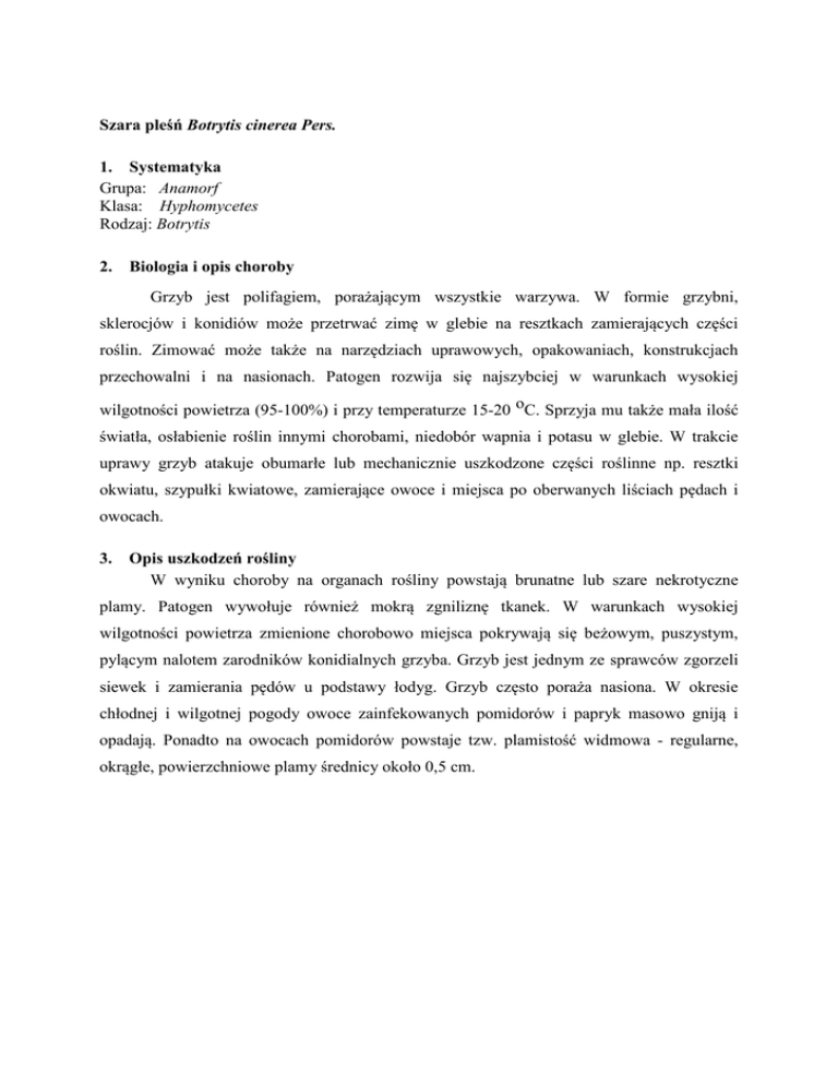 Szara pleśń Botrytis cinerea Pers. 1. Systematyka Grupa: Anamorf Klasa: Hyphomycetes Rodzaj: Botrytis 2. Biologia i opis choroby Grzyb jest polifagiem, porażającym wszystkie warzywa. W formie grzybni, sklerocjów i konidiów może przetrwać zimę w glebie na resztkach zamierających części roślin. Zimować może także na narzędziach uprawowych, opakowaniach, konstrukcjach przechowalni i na nasionach. Patogen rozwija się najszybciej w warunkach wysokiej wilgotności powietrza (95-100%) i przy temperaturze 15-20 oC. Sprzyja mu także mała ilość światła, osłabienie roślin innymi chorobami, niedobór wapnia i potasu w glebie. W trakcie uprawy grzyb atakuje obumarłe lub mechanicznie uszkodzone części roślinne np. resztki okwiatu, szypułki kwiatowe, zamierające owoce i miejsca po oberwanych liściach pędach i owocach. 3. Opis uszkodzeń rośliny W wyniku choroby na organach rośliny powstają brunatne lub szare nekrotyczne plamy. Patogen wywołuje również mokrą zgniliznę tkanek. W warunkach wysokiej wilgotności powietrza zmienione chorobowo miejsca pokrywają się beżowym, puszystym, pylącym nalotem zarodników konidialnych grzyba. Grzyb jest jednym ze sprawców zgorzeli siewek i zamierania pędów u podstawy łodyg. Grzyb często poraża nasiona. W okresie chłodnej i wilgotnej pogody owoce zainfekowanych pomidorów i papryk masowo gniją i opadają. Ponadto na owocach pomidorów powstaje tzw. plamistość widmowa - regularne, okrągłe, powierzchniowe plamy średnicy około 0,5 cm. Szara pleśń – objawy na liściu Szara pleśń – objawy na owocach pomidora Szara pleśń – objawy na łodydze 4. Metodyka wykonania obserwacji Pierwsze objawy choroby mogą wystąpić już w fazie produkcji rozsady (skala BBCH 2/22) w postaci rozległych nekrotycznych plam u podstawy łodygi. Największe nasilenie szarej pleśni na pędach, liściach i owocach może występować w okresie tworzenia pierwszych zawiązków owoców (skala BBCH 7/71). Obserwacje nasilenia choroby przeprowadzać od początku zawiązywania owoców. Ocenę porażenia liści, pędów i owoców wykonać w 4-5 miejscach plantacji na próbie 50 roślin w skali 6-stopniowej: 0 – brak objawów choroby 1 – porażenie 1% (pierwsze objawy chorobowe na roślinie) 2 – porażenie od 2% do 6% 3 – porażenie od 7% do 20% 4 – porażenie od 21% do 50% 5 – porażenie powyżej 50% 5. Próg zagrożenia i terminy zabiegów Nasilenie choroby zależy od warunków atmosferycznych w danym roku i na danej plantacji. Choroba atakuje najczęściej pomidory i paprykę w uprawach pod osłonami. W czasie suchej i upalnej pogody w polu nie dochodzi do infekcji. Zwalczanie szarej pleśni jest utrudnione ze względu na dużą zmienność biologiczną grzyba - powstawanie nowych ras odpornych na działanie fungicydów. W celu obniżenia wilgotności powietrza należy dokładnie wietrzyć szklarnie i tunele foliowe. Powierzchnie roślin utrzymywać w stanie suchym, szczególnie w nocy, gdy temperatura spada poniżej 15 0C. Po obrywaniu liści, pędów bocznych lub owoców należy profilaktycznie 2-3 razy w odstępach co 7-10 dni rośliny opryskiwać fungicydami. 6. Ocena szkodliwości Szkodliwość choroby jest najwyższa w okresie kwitnienia (skala BBCH 6/61-69) i owocowania (skala BBCH 7/71-8/89) w okresach chłodnej i wilgotnej pogody. Owoce zainfekowanych pomidorów i papryk masowo gniją i opadają. Przy niewłaściwej ochronie straty w plonach dochodzą do 70-80%. Na owocach mogą powstawać także plamistości tzw. plamistość widmowa - regularne, okrągłe, powierzchniowe plamy średnicy około 0,5 cm, takie owoce nie nadają się do konsumpcji i przetwarzania.