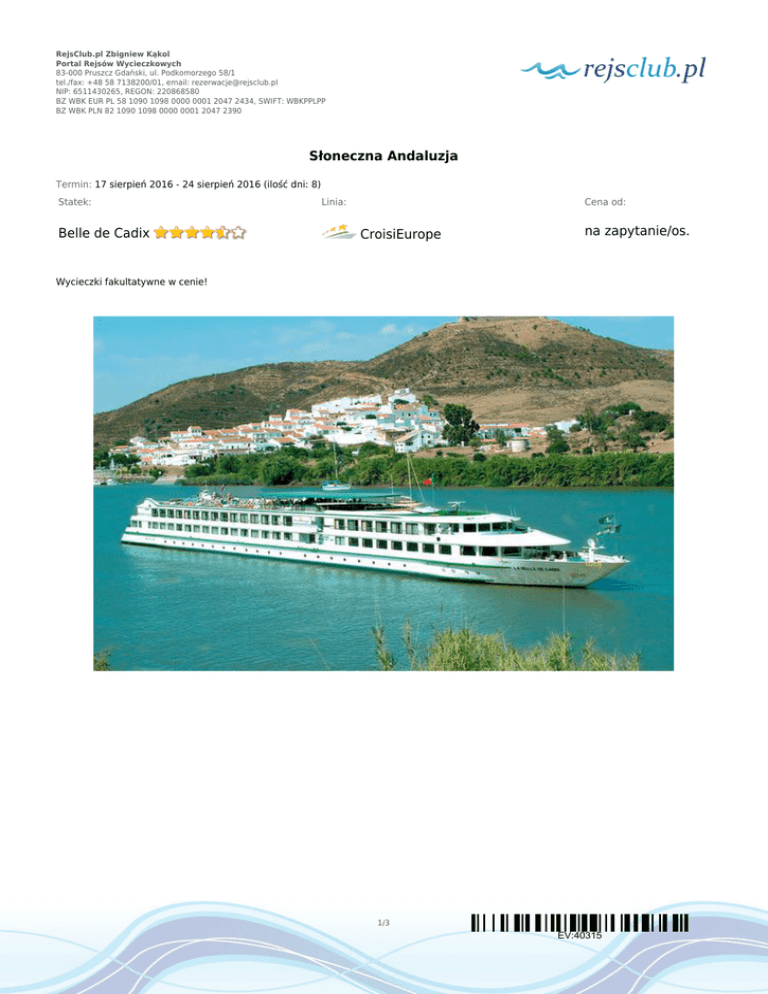 RejsClub.pl Zbigniew Kąkol Portal Rejsów Wycieczkowych 83-000 Pruszcz Gdański, ul. Podkomorzego 58/1 tel./fax: +48 58 7138200/01, email: [email protected] NIP: 6511430265, REGON: 220868580 BZ WBK EUR PL 58 1090 1098 0000 0001 2047 2434, SWIFT: WBKPPLPP BZ WBK PLN 82 1090 1098 0000 0001 2047 2390 Słoneczna Andaluzja Termin: 17 sierpień 2016 - 24 sierpień 2016 (ilość dni: 8) Statek: Belle de Cadix Linia: Cena od: CroisiEurope na zapytanie/os. Wycieczki fakultatywne w cenie! 1/3 EV:40315 RejsClub.pl Zbigniew Kąkol Portal Rejsów Wycieczkowych 83-000 Pruszcz Gdański, ul. Podkomorzego 58/1 tel./fax: +48 58 7138200/01, email: [email protected] NIP: 6511430265, REGON: 220868580 BZ WBK EUR PL 58 1090 1098 0000 0001 2047 2434, SWIFT: WBKPPLPP BZ WBK PLN 82 1090 1098 0000 0001 2047 2390 TRASA REJSU dzień 1 Data Port Wpłynięcie Wypłynięcie środa 17.08.2016 Sewilla, Andaluzja --:-- 17:00 Legenda Hiszpania Zaokrętowanie od godziny 17:00. Po koktajlu powitalnym kolacja. Wolny wieczór. Na noc cumujemy w Sewilli. dzień 2 czwartek 18.08.2016 Sewilla, Andaluzja --:-- --:-- Hiszpania Po śniadaniu wycieczka piesza po mieście z przewodnikiem. Sewilla nazywana jest „miastem światła” i uchodzi za stolicę flamenco. Na pokład wrócimy około godziny 13:00 i następnie wyruszymy w kierunku Kadyksu. Będziemy płynąć wzdłuż nieskażonej przyrody, gdzie pola bawełny i ryżu sąsiadują z bogatą fauną i florą. Miniemy Park Donana, który przez UNESCO uznawany jest za naturalny rezerwat biosfery oraz Sanlucar de Barrameda, czyli miejsce z którego w swoje wyprawy wyruszał Krzysztof Kolumb dzień 2 czwartek 18.08.2016 --:-- Kadyks --:-- Hiszpania Do Kadyksu dopłyniemy wieczorem. Po kolacji w towarzystwie hostessy wybierzemy się na nocne zwiedzanie - „Cadiz by night”. To zbudowane na skale i otoczone ze wszystkich stron przez morze ufortyfikowane miasto połączone jest z lądem jedynie wąskim pasem piasku. dzień 3 piątek 19.08.2016 Kadyks --:-- --:-- Hiszpania Ranek po śniadaniu przeznaczony jest na piesze zwiedzanie Kadyksu z przewodnikiem. Miasto to zaskakuje kulturowym i historycznym bogactwem, a także urzeka pięknymi krajobrazami, które czynią je tak wyjątkowym miejscem. Po lunchu wypłynięcie w kierunku El Puerto de Santa Maria. dzień 3 piątek 19.08.2016 El Puerto de Santa Maria --:-- --:-- Hiszpania Do El Puerto de Santa Maria dotrzemy około 15:00. Wycieczka do Jerez – stolicy wina i koni oraz kolebki muzyki flamenco. Podczas wycieczki obejrzymy słynny zamek Alcazar oraz katedrę. Następnie odwiedzimy „ganaderię” czuli miejsce hodowli byków, dzięki czemu dowiemy się więcej na temat tego żywego symbolu hiszpańskiej kultury. Po powrocie na statek kolacja w hiszpańskim stylu oraz wieczór rozrywki. Na noc cumujemy w El Puerto de Santa Maria. dzień 4 sobota 20.08.2016 El Puerto de Santa Maria --:-- --:-- Hiszpania Po śniadaniu wyjazd do piwnicy z winami, gdzie odkryjemy sekrety Manzanilli i będziemy mieć degustację. Powrót na statek na lunch i wypłynięcie w kierunku Sewilli, gdzie dotrzemy wieczorem. dzień 5 niedziela 21.08.2016 Sewilla, Andaluzja --:-- --:-- Hiszpania Po śniadaniu wyjazd autokarem na wycieczkę z przewodnikiem do Granady. Ta słynąca z przyjaznej atmosfery miejscowość otoczona jest imponującymi górami Sierra Nevada. Zbudowana została na 3 wzgórzach: Albaicin, Sacromonte oraz Alhambra. Znajduję się tutaj sporo zabytków z czasów mauretańskich, szczególnie w Alhambrze, gdzie znajduje się również słynny pałac z baśni „Tysiąca i jednej nocy” oraz letnia rezydencja królów – Generalife. Lunch w restauracji w Granadzie i czas wolny na zwiedzanie na własną rękę. Następnie powrót autokarem na statek. dzień 6 poniedziałek 22.08.2016 Sewilla, Andaluzja --:-- --:-- Hiszpania Po śniadaniu wyjazd autokarem na wycieczkę do rezerwatu przyrody z przewodnikiem leśnym. Jest to całkowicie dziewiczy obszar, dzięki czemu udało się zachować jego specyficzny charakter. Będzie możliwość podziwiania niesamowicie różnorodnych gatunków ptaków, mew i kaczek (w lipcu i sierpniu rezerwat jest zamknięty i zamiast tego odbywa się wycieczka do Carmony, gdzie produkuje się oliwę z oliwek). Po powrocie na statek wolne popołudnie w Sewilli. Położenie tego miasta pomiędzy Afryka i Europą jest jego niewątpliwym atutem, w tym miejscu bowiem spotykają się kultury: muzułmańska, katolicka oraz żydowska. Ta mieszanka sprawia, że Sewilla jest prawdziwym klejnotem Andaluzji. Po kolacji flamenco show na pokładzie. 2/3 EV:40315 RejsClub.pl Zbigniew Kąkol Portal Rejsów Wycieczkowych 83-000 Pruszcz Gdański, ul. Podkomorzego 58/1 tel./fax: +48 58 7138200/01, email: [email protected] NIP: 6511430265, REGON: 220868580 BZ WBK EUR PL 58 1090 1098 0000 0001 2047 2434, SWIFT: WBKPPLPP BZ WBK PLN 82 1090 1098 0000 0001 2047 2390 dzień 7 Data Port Wpłynięcie Wypłynięcie wtorek 23.08.2016 Sewilla, Andaluzja --:-- --:-- Legenda Hiszpania Po śniadaniu wyjazd autokarem na wycieczkę z przewodnikiem do Kordoby – miasta kalifów. Odwiedzimy Mezquitę czyli przebudowany na katedrę meczet, który tworzy prawdziwy „las kolumn” (jest ich 856). Jest to jeden z najznamienitszych zabytków kultury islamskiej. Zwiedzimy również Juderię czyli dzielnicę żydowską z charakterystycznymi pasami kwiatów oraz domami z patio. Na lunch skosztujemy miejscowe tapas. Następnie będzie czas wolny na indywidualne zwiedzanie i powrócimy do Sewilli. Po uroczystej kolacji na statku odbędzie się dancing. dzień 8 środa 24.08.2016 Sewilla, Andaluzja 09:00 --:-- Hiszpania Wyokrętowanie o godzinie 9:00. CENNIK Cena katalogowa Kabina zewnętrzna z oknem od €1 439.00 3 osoba dorosła w kabinie zniżka 30% dziecko od 2 do 14 lat jako 3 i 4 osoba w kabinie zniżka 30% Opłaty portowe Cena promocyjna w cenie Uwaga! Ceny za osobę w kabinie dwuosobowej. Cena zawiera: 8-dniowy (7 noclegów) rejs po Gwadalkiwr; zakwatero