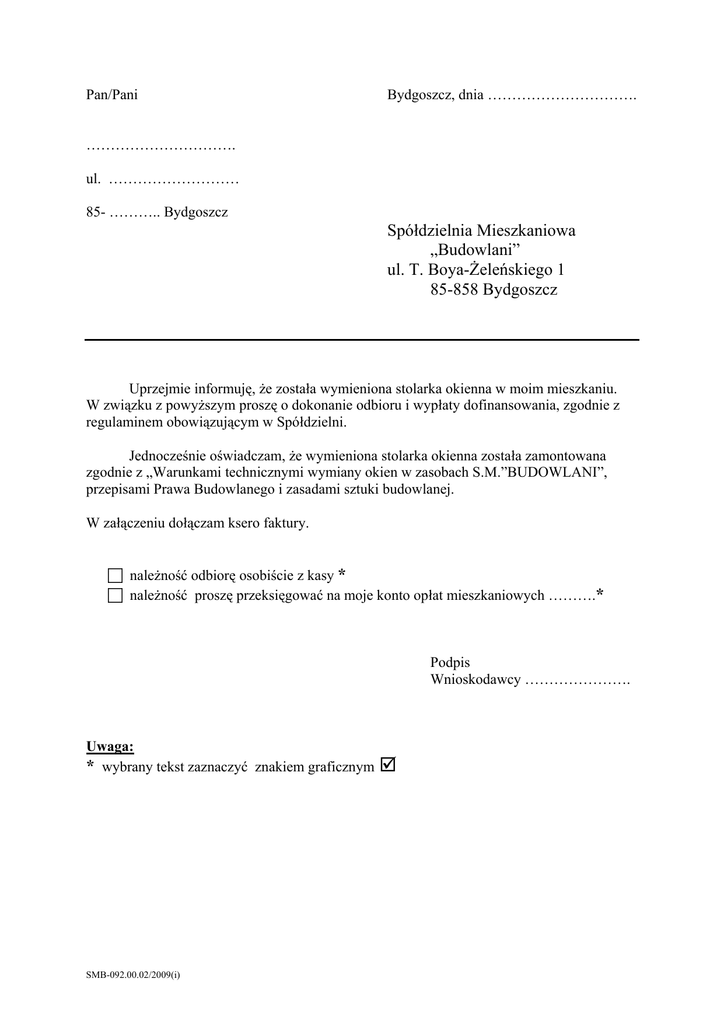 Pan/Pani Bydgoszcz, dnia …………………………. …………………………. ul. ……………………… 85- ……….. Bydgoszcz Spółdzielnia Mieszkaniowa „Budowlani” ul. T. Boya-Żeleńskiego 1 85-858 Bydgoszcz Uprzejmie informuję, że została wymieniona stolarka okienna w moim mieszkaniu. W związku z powyższym proszę o dokonanie odbioru i wypłaty dofinansowania, zgodnie z regulaminem obowiązującym w Spółdzielni. Jednocześnie oświadczam, że wymieniona stolarka okienna została zamontowana zgodnie z „Warunkami technicznymi wymiany okien w zasobach S.M.”BUDOWLANI”, przepisami Prawa Budowlanego i zasadami sztuki budowlanej. W załączeniu dołączam ksero faktury. F należność odbiorę osobiście z kasy * F należność proszę przeksięgować na moje konto opłat mieszkaniowych ……….* Podpis Wnioskodawcy …………………. Uwaga: * wybrany tekst zaznaczyć znakiem graficznym SMB-092.00.02/2009(i) ;