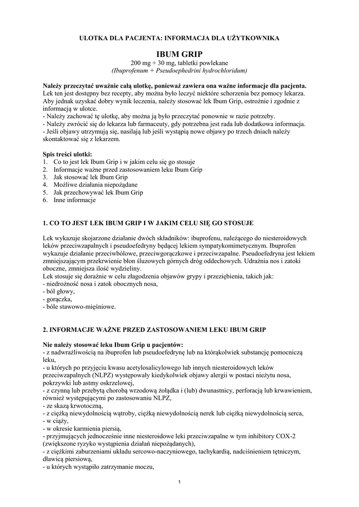 ULOTKA DLA PACJENTA: INFORMACJA DLA UŻYTKOWNIKA IBUM GRIP 200 mg + 30 mg, tabletki powlekane (Ibuprofenum + Pseudoephedrini hydrochloridum) Należy przeczytać uważnie całą ulotkę, ponieważ zawiera ona ważne informacje dla pacjenta. Lek ten jest dostępny bez recepty, aby można było leczyć niektóre schorzenia bez pomocy lekarza. Aby jednak uzyskać dobry wynik leczenia, należy stosować lek Ibum Grip, ostrożnie i zgodnie z informacją w ulotce. - Należy zachować tę ulotkę, aby można ją było przeczytać ponownie w razie potrzeby. - Należy zwrócić się do lekarza lub farmaceuty, gdy potrzebna jest rada lub dodatkowa informacja. - Jeśli objawy utrzymują się, nasilają lub jeśli wystąpią nowe objawy po trzech dniach należy skontaktować się z lekarzem. Spis treści ulotki: 1. Co to jest lek Ibum Grip i w jakim celu się go stosuje 2. Informacje ważne przed zastosowaniem leku Ibum Grip 3. Jak stosować lek Ibum Grip 4. Możliwe działania niepożądane 5. Jak przechowywać lek Ibum Grip 6. Inne informacje 1. CO TO JEST LEK IBUM GRIP I W JAKIM CELU SIĘ GO STOSUJE Lek wykazuje skojarzone działanie dwóch składników: ibuprofenu, należącego do niesteroidowych leków przeciwzapalnych i pseudoefedryny będącej lekiem sympatykomimetycznym. Ibuprofen wykazuje działanie przeciwbólowe, przeciwgorączkowe i przeciwzapalne. Pseudoefedryna jest lekiem zmniejszającym przekrwienie błon śluzowych górnych dróg oddechowych. Udrażnia nos i zatoki oboczne, zmniejsza ilość wydzieliny. Lek stosuje się doraźnie w celu złagodzenia objawów grypy i przeziębienia, takich jak: - niedrożność nosa i zatok obocznych nosa, - ból głowy, - gorączka, - bóle stawowo-mięśniowe. 2. INFORMACJE WAŻNE PRZED ZASTOSOWANIEM LEKU IBUM GRIP Nie należy stosować leku Ibum Grip u pacjentów: - z nadwrażliwością na ibuprofen lub pseudoefedrynę lub na którąkolwiek substancję pomocniczą leku, - u których po przyjęciu kwasu acetylosalicylowego lub innych niesteroidowych leków przeciwzapalnych (NLPZ) występowały kiedykolwiek objawy alergii w postaci nieżytu nosa, pokrzywki lub astmy oskrzelowej, - z czynną lub przebytą chorobą wrzodową żołądka i (lub) dwunastnicy, perforacją lub krwawieniem, również występującymi po zastosowaniu NLPZ, - ze skazą krwotoczną, - z ciężką niewydolnością wątroby, ciężką niewydolnością nerek lub ciężką niewydolnością serca, - w ciąży, - w okresie karmienia piersią, - przyjmujących jednocześnie inne niesteroidowe leki przeciwzapalne w tym inhibitory COX-2 (zwiększone ryzyko wystąpienia działań niepożądanych), - z ciężkimi zaburzeniami układu sercowo-naczyniowego, tachykardią, nadciśnieniem tętniczym, dławicą piersiową, - u których wystąpiło zatrzymanie moczu, 1 - z nadczynnością tarczycy, - z jaskrą z wąskim kątem, - z przebytym krwotocznym udarem mózgu lub występowaniem czynników ryzyka, które mogą zwiększać ryzyko krwotocznego udaru mózgu, na przykład w wyniku przyjmowania leków zwężających naczynia krwionośne lub innych leków zmniejszających przekrwienie, stosowanych doustnie lub donosowo. Zachować szczególną ostrożność stosując lek Ibum Grip u pacjentów - u których występuje toczeń rumieniowaty układowy oraz mieszana choroba tkanki łącznej – ze względu na zwiększone ryzyko rozwoju jałowego zapalenia opon mózgowych, - u których występują choroby przewodu pokarmowego (wrzodziejące zapalenie jelita grubego, choroba Leśniowskiego i Crohna) – ze względu na możliwość zaostrzenia choroby, - u których występuje zaburzenie czynności nerek – ze względu na ryzyko dalszego pogorszenia czynności nerek, - u których występują zaburzenia czynności wątroby, - z zaburzeniami rytmu serca, z nadciśnieniem tętniczym, zawałem mięśnia sercowego lub niewydolnością serca w wywiadzie, - u których występuje czynna lub stwierdzona w przeszłości astma oskrzelowa oraz choroby alergiczne – ze względu na możliwość wystąpienia skurczu oskrzeli, - w podeszłym wieku – ze względu na ryzyko zwiększenia działań niepożądanych, - przyjmujących leki wymienione w części ulotki „Stosowanie innych leków”, - z cukrzycą, - z łagodnym rozrostem gruczołu krokowego, - z jaskrą, - ze zwężeniem odźwiernika, - z niedrożnością szyi pęcherza moczowego. Przyjmowanie leku w najmniejszej skutecznej dawce przez najkrótszy okres konieczny do łagodzenia objawów zmniejsza ryzyko wystąpienia działań niepożądanych. U pacjentów w podeszłym wieku ryzyko wystąpienia działań niepożądanych na skutek stosowania leku jest większe niż u pacjentów młodszych. Częstość występowania oraz nasilenie działań niepożądanych można zmniejszyć stosując najniższą dawkę terapeutyczną przez możliwie najkrótszy okres. Istnieje ryzyko wystąpienia krwotoku z przewodu pokarmowego, owrzodzenia lub perforacji, które mogą mieć skutek śmiertelny i które niekoniecznie muszą być poprzedzone objawami ostrzegawczymi lub mogą wystąpić u pacjentów, u których takie objawy ostrzegawcze występowały. W przypadku wystąpienia krwawienia lub owrzodzenia przewodu pokarmowego należy przerwać stosowanie ibuprofenu. Należy poinformować pacjentów z chorobami przewodu pokarmowego w wywiadzie, szczególnie pacjentów w podeszłym wieku, o konieczności zgłaszania lekarzowi wszelkich nietypowych objawów dotyczących przewodu pokarmowego (szczególnie krwawienia), zwłaszcza w początkowym okresie leczenia. Należy zachować ostrożność stosując lek u pacjentów przyjmujących jednocześnie inne leki, które mogą zwiększyć ryzyko wystąpienia zaburzeń żołądka i jelit lub krwawienia, takie jak kortykosteroidy lub leki przeciwzakrzepowe, takie jak warfaryna (acenokumarol) lub leki antyagregacyjne, takie jak kwas acetylosalicylowy. Jednoczesne, długotrwałe stosowanie leków przeciwbólowych może prowadzić do uszkodzenia n