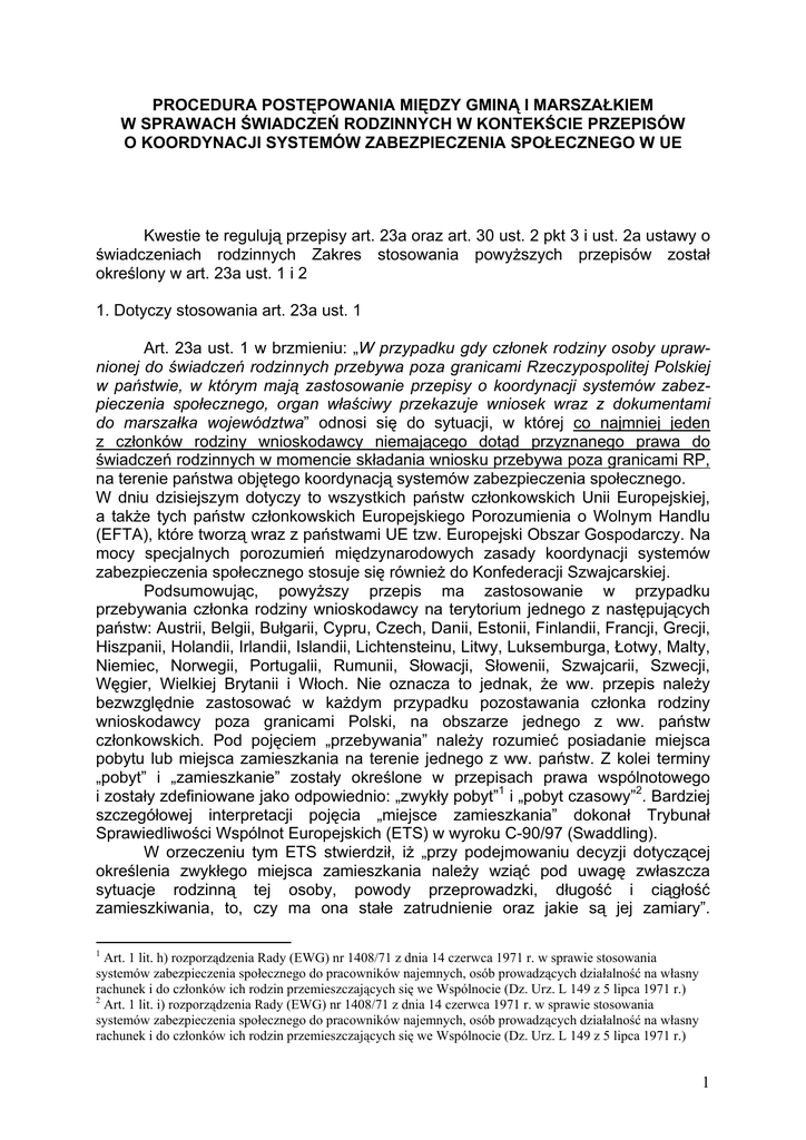 PROCEDURA POSTĘPOWANIA MIĘDZY GMINĄ I MARSZAŁKIEM W SPRAWACH ŚWIADCZEŃ RODZINNYCH W KONTEKŚCIE PRZEPISÓW O KOORDYNACJI SYSTEMÓW ZABEZPIECZENIA SPOŁECZNEGO W UE Kwestie te regulują przepisy art. 23a oraz art. 30 ust. 2 pkt 3 i ust. 2a ustawy o świadczeniach rodzinnych Zakres stosowania powyższych przepisów został określony w art. 23a ust. 1 i 2 1. Dotyczy stosowania art. 23a ust. 1 Art. 23a ust. 1 w brzmieniu: „W przypadku gdy członek rodziny osoby uprawnionej do świadczeń rodzinnych przebywa poza granicami Rzeczypospolitej Polskiej w państwie, w którym mają zastosowanie przepisy o koordynacji systemów zabezpieczenia społecznego, organ właściwy przekazuje wniosek wraz z dokumentami do marszałka województwa” odnosi się do sytuacji, w której co najmniej jeden z członków rodziny wnioskodawcy niemającego dotąd przyznanego prawa do świadczeń rodzinnych w momencie składania wniosku przebywa poza granicami RP, na terenie państwa objętego koordynacją systemów zabezpieczenia społecznego. W dniu dzisiejszym dotyczy to wszystkich państw członkowskich Unii Europejskiej, a także tych państw członkowskich Europejskiego Porozumienia o Wolnym Handlu (EFTA), które tworzą wraz z państwami UE tzw. Europejski Obszar Gospodarczy. Na mocy specjalnych porozumień międzynarodowych zasady koordynacji systemów zabezpieczenia społecznego stosuje się również do Konfederacji Szwajcarskiej. Podsumowując, powyższy przepis ma zastosowanie w przypadku przebywania członka rodziny wnioskodawcy na terytorium jednego z następujących państw: Austrii, Belgii, Bułgarii, Cypru, Czech, Danii, Estonii, Finlandii, Francji, Grecji, Hiszpanii, Holandii, Irlandii, Islandii, Lichtensteinu, Litwy, Luksemburga, Łotwy, Malty, Niemiec, Norwegii, Portugalii, Rumunii, Słowacji, Słowenii, Szwajcarii, Szwecji, Węgier, Wielkiej Brytanii i Włoch. Nie oznacza to jednak, że ww. przepis należy bezwzględnie zastosować w każdym przypadku pozostawania członka rodziny wnioskodawcy poza granicami Polski, na obszarze jednego z ww. państw członkowskich. Pod pojęciem „przebywania” należy rozumieć posiadanie miejsca pobytu lub miejsca zamieszkania na terenie jednego z ww. państw. Z kolei terminy „pobyt” i „zamieszkanie” zostały określone w przepisach prawa wspólnotowego i zostały zdefiniowane jako odpowiednio: „zwykły pobyt”1 i „pobyt czasowy”2. Bardziej szczegółowej interpretacji pojęcia „miejsce zamieszkania” dokonał Trybunał Sprawiedliwości Wspólnot Europejskich (ETS) w wyroku C-90/97 (Swaddling). W orzeczeniu tym ETS stwierdził, iż „przy podejmowaniu decyzji dotyczącej określenia zwykłego miejsca zamieszkania należy wziąć pod uwagę zwłaszcza sytuacje rodzinną tej osoby, powody przeprowadzki, długość i ciągłość zamieszkiwania, to, czy ma ona stałe zatrudnienie oraz jakie są jej zamiary”. 1 Art. 1 lit. h) rozporządzenia Rady (EWG) nr 1408/71 z dnia 14 czerwca 1971 r. w sprawie stosowania systemów zabezpieczenia społecznego do pracowników najemnych, osób prowadzących działalność na własny rachunek i do członków ich rodzin przemieszczających się we Wspólnocie (Dz. Urz. L 149 z 5 lipca 1971 r.) 2 Art. 1 lit. i) rozporządzenia Rady (EWG) nr 1408/71 z dnia 14 czerwca 1971 r. w sprawie stosowania systemów zabezpieczenia społecznego do pracowników najemnych, osób prowadzących działalność na własny rachunek i do członków ich rodzin przemieszczających się we Wspólnocie (Dz. Urz. L 149 z 5 lipca 1971 r.) 1 W podobnym duchu Trybunał wypowiedział się w orzeczeniu C-76/76 (di Paolo), w którym stwierdził, że pod pojęciem „państwa członkowskiego, w którym pracownik zamieszkuje” należy rozumieć „państwo, w którym pracownik (…) zwykle mieszka i gdzie koncentrują się jego interesy życiowe”. Na gruncie polskiego ustawodawstwa pojęcie miejsca zamieszkania zdefiniował Kodeks Cywilny. W art. 25 KC za „miejsce zamieszkania” osoby fizycznej uznano miejscowość, w której osoba ta przebywa z zamiarem stałego pobytu. Orzecznictwo Naczelnego Sądu Administracyjnego i Sądu Najwyższego (wyrok NSA z 14 maja 2001 r., sygn. akt V SA 1496/00; wyrok SN z 25 listopada 1975 r., sygn. akt III CRN 53/75) dodając przesłanki koncentracji spraw życiowych danej osoby w konkretnym miejscu, a także założenie tam ośrodka interesów osobistych i majątkowych. ETS nie dokonał jednak w swoim orzecznictwie interpretacji pojęcia „miejsce pobytu”. W takim wypadku, z uwagi na fakt, iż w myśl rozporządzenia 1408/71 za „pobyt” uważa się pobyt czasowy, należy odwołać się do definicji pobytu czasowego w polskim ustawodawstwie. Najbardziej odpowiednim polskim aktem prawnym określającym pojęcie „pobytu czasowego” wydaje się być ustawa z dnia 10 kwietnia 1974 r. o ewidencji ludności i dowodach osobistych (t.j.: Dz. U. z 2006 r., nr 139, poz. 993 z późn. zm.). Zgodnie z brzmieniem art. 7 ust. 1 ww. ustawy „pobytem czasowym jest przebywanie bez zamiaru zmiany miejsca pobytu stałego w innej miejscowości pod oznaczonym adresem lub w tej samej miejscowości, lecz pod innym adresem”. Z kolei art. 10 tej samej ustawy stanowi, iż za pobyt czasowy uważa się każdy pobyt w określonym miejscu przez okres dłuższy niż trzy doby. Zgodnie z brzmieniem literalnym ww. przepisu należy zatem uznać, że nie jest pobytem czasowym przebywanie w określonym miejscu przez okres krótszy niż 72 godziny. Reasumując, za „przebywanie” należałoby uznać każdy pobyt członka rodziny wnioskodawcy pod określonym adresem na terenie jednego z ww. wymienionych państw pod warunkiem, iż trwa on dłużej niż 72 godziny. Jednakże, ze względu na cel ww. regulacji należy stwierdzić, iż zgodnie z przepisami prawa wspólnotowego przepisy o koordynacji systemów zabezpieczenia społecznego stosują się w szczególności do osób przemieszczających się w związku z podjęciem z