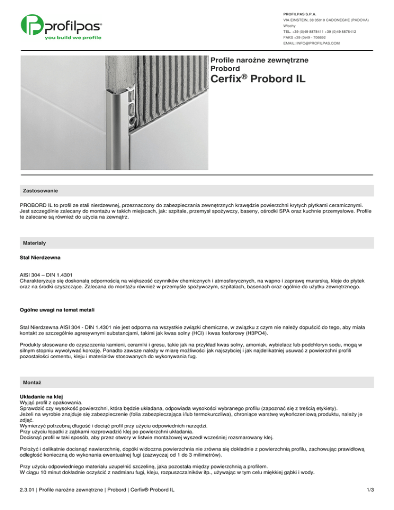 PROFILPAS S.P.A. VIA EINSTEIN, 38 35010 CADONEGHE (PADOVA) Włochy TEL. +39 (0)49 8878411 +39 (0)49 8878412 FAKS +39 (0)49 - 706692 EMAIL: [email protected] Profile narożne zewnętrzne Probord Cerfix® Probord IL Zastosowanie PROBORD IL to profil ze stali nierdzewnej, przeznaczony do zabezpieczania zewnętrznych krawędzie powierzchni krytych płytkami ceramicznymi. Jest szczególnie zalecany do montażu w takich miejscach, jak: szpitale, przemysł spożywczy, baseny, ośrodki SPA oraz kuchnie przemysłowe. Profile te zalecane są również do użycia na zewnątrz. Materiały Stal Nierdzewna AISI 304 – DIN 1.4301 Charakteryzuje się doskonałą odpornością na większość czynników chemicznych i atmosferycznych, na wapno i zaprawę murarską, kleje do płytek oraz na środki czyszczące. Zalecana do montażu również w przemyśle spożywczym, szpitalach, basenach oraz ogólnie do użytku zewnętrznego. Ogólne uwagi na temat metali Stal Nierdzewna AISI 304 - DIN 1.4301 nie jest odporna na wszystkie związki chemiczne, w związku z czym nie należy dopuścić do tego, aby miała kontakt ze szczególnie agresywnymi substancjami, takimi jak kwas solny (HCl) i kwas fosforowy (H3PO4). Produkty stosowane do czyszczenia kamieni, ceramiki i gresu, takie jak na przykład kwas solny, amoniak, wybielacz lub podchloryn sodu, mogą w silnym stopniu wywoływać korozję. Ponadto zawsze należy w miarę możliwości jak najszybciej i jak najdelikatniej usuwać z powierzchni profili pozostałości cementu, kleju i materiałów stosowanych do wykonywania fug. Montaż Układanie na klej Wyjąć profil z opakowania. Sprawdzić czy wysokość powierzchni, która będzie układana, odpowiada wysokości wybranego profilu (zapoznać się z treścią etykiety). Jeżeli na wyrobie znajduje się zabezpieczenie (folia zabezpieczająca i/lub termokurczliwa), chroniące warstwę wykończeniową produktu, należy je zdjąć. Wymierzyć potrzebną długość i dociąć profil przy użyciu odpowiednich narzędzi. Przy użyciu łopatki z ząbkami rozprowadzić klej po powierzchni układania. Docisnąć profil w taki sposób, aby przez otwory w listwie montażowej wyszedł wcześniej rozsmarowany klej. Położyć i delikatnie docisnąć nawierzchnię, dopóki widoczna powierzchnia nie zrówna się dokładnie z powierzchnią profilu, zachowując prawidłową odległość konieczną do wykonania ewentualnej fugi (zazwyczaj od 1 do 3 milimetrów). Przy użyciu odpowiedniego materiału uzupełnić szczelinę, jaka pozostała między powierzchnią a profilem. W ciągu 10 minut dokładnie oczyścić z nadmiaru fugi, kleju, rozpuszczalników itp., używając w tym celu miękkiej gąbki i wody. 2.3.01 | Profile narożne zewnętrzne | Probord | Cerfix® Probord IL 1/3 Konserwacja i pielęgnacja Stal nierdzewna Powierzchnie ze stali nierdzewnej mogą być polerowane przy użyciu specjalnych produktów, dostępnych na rynku. Stal nierdzewna jest prosta w czyszczeniu i wyjątkowo higieniczna; jej gładka powierzchnia, pozbawiona porów, w wysokim stopniu utrudnia przyleganie i gromadzenie się bakterii i/lub innych mikroorganizmów. Wystarczy przestrzegać kilku prostych zasad, aby utrzymać powierzchnie ze stali w idealnym stanie: przemycie ciepłą wodą z mydłem, obfite spłukanie i osuszenie przy użyciu miękkiej ściereczki. W przypadku powierzchni narażonych na działanie czynników atmosferycznych lub czynników agresywnych, zalecamy okresowe czyszczenie profilu ze stali nierdzewnej, w celu zapobieżenia zmianom powierzchniowym oraz powstawaniu korozji. Powierzchnie z wykończeniem szczotkowanym należy zawsze czyścić zgodnie z kierunkiem szczotkowania, nie w poprzek. W przypadku zarysowań należy użyć specjalnego środka czyszczącego/nabłyszczającego do stali nierdzewnej oraz delikatnej ściereczki. W żadnym przypadku nie wolno używać do czyszczenia: • środków czyszczących zawierających kwas chlorowodorowy (solny, dostępny na rynku), kwas fluorowodorowy lub wybielacz; nie należy dopuszczać do bezpośredniego kontaktu powierzchni ze środkami czyszczącymi zawierającymi chlorki, chyba, że taki kontakt będzie krótkotrwały, a po nim nastąpi obfite spłukiwanie; • środków ściernych w proszku, które mogłyby uszkodzić warstwę wykończeniową profilu. Nie należy dopuszczać do tego, aby profile ze stali nierdzewnej pozostawały w zbyt długim kontakcie z przedmiotami lub narzędziami wykonanymi ze stali zwyczajnej (np. szczotki lub wełna stalowa stosowane zazwyczaj do usuwania pozostałości zaprawy murarskiej i innych podobnych produktów), z których mogłyby się przenosić cząsteczki żelaza (zanieczyszczenia), powodując powstawanie rdzawych plam na powierzchni. Nie należy pozostawiać przez zbyt długi czas wilgotnych ściereczek lub gąbek w kontakcie z powierzchnią stali nierdzewnej, ponieważ mogłoby to spowodować formowanie się nieestetycznych plam po wodzie. POSTĘPOWANIE W PRZYPADKU POŻARU Do gaszenia pożaru należy stosować produkty chemiczne, suchy piasek lub stałe substancje gaszące. UWAGI Postępować ostrożnie z profilami, stosując odpowiednie rękawice zabezpieczające przed zranieniem i/lub pocięciem rąk. Pomimo tego, że niniejsze wskazówki i zalecenia są oparte na naszym doświadczeniu, mają one charakter wyłącznie informacyjny i powinny być potwierdzone przez wyczerpujące zastosowania praktyczne. Profilpas uchyla się od odpowiedzialności za powstanie ewentualnych szkód osobowych i materialnych wynikających z nieodpowiedniego użycia produktu. Użytkownik powinien określić, czy produkt jest lub nie jest odpowiedni do użycia i jest on całkowicie odpowiedzialny za nieprawidłowe ułożenie nawierzchni. 2.3.01 | Profile narożne zewnętrzne | Probord | Cerfix® Probord IL 2/3 IL Profil Artykuł IL/80 IL/100 IL/125 wysokość H [mm] 8 10 12.5 szerokość L [mm] 25 25 25 270 270 długość [cm] 270 Stal nierdzewna AISI 304 - DIN 1.4301 bły