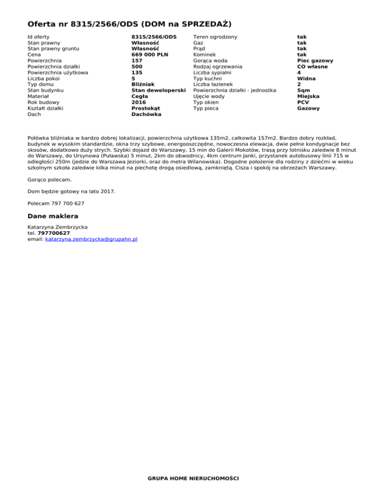 Oferta nr 8315/2566/ODS (DOM na SPRZEDAŻ)