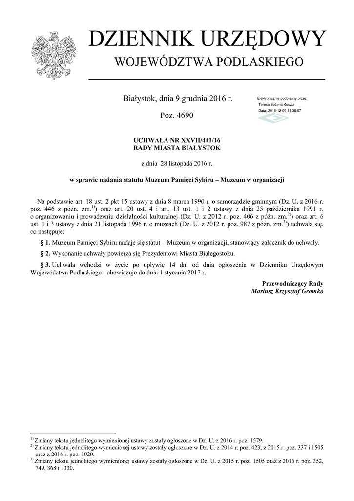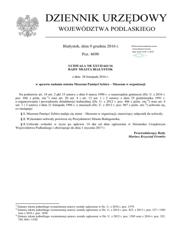 DZIENNIK URZĘDOWY WOJEWÓDZTWA PODLASKIEGO Białystok, dnia 9 grudnia 2016 r. Elektronicznie podpisany przez: Teresa Bożena Koczta Poz. 4690 Data: 2016-12-09 11:35:07 UCHWAŁA NR XXVII/441/16 RADY MIASTA BIAŁYSTOK z dnia 28 listopada 2016 r. w sprawie nadania statutu Muzeum Pamięci Sybiru – Muzeum w organizacji Na podstawie art. 18 ust. 2 pkt 15 ustawy z dnia 8 marca 1990 r. o samorządzie gminnym (Dz. U. z 2016 r. poz. 446 z późn. zm.1)) oraz art. 20 ust. 4 i art. 13 ust. 1 i 2 ustawy z dnia 25 października 1991 r. o organizowaniu i prowadzeniu działalności kulturalnej (Dz. U. z 2012 r. poz. 406 z późn. zm. 2)) oraz art. 6 ust. 1 i 3 ustawy z dnia 21 listopada 1996 r. o muzeach (Dz. U. z 2012 r. poz. 987 z późn. zm. 3)) uchwala się, co następuje: § 1. Muzeum Pamięci Sybiru nadaje się statut – Muzeum w organizacji, stanowiący załącznik do uchwały. § 2. Wykonanie uchwały powierza się Prezydentowi Miasta Białegostoku. § 3. Uchwała wchodzi w życie po upływie 14 dni od dnia ogłoszenia w Dzienniku Urzędowym Województwa Podlaskiego i obowiązuje do dnia 1 stycznia 2017 r. Przewodniczący Rady Mariusz Krzysztof Gromko 1) Zmiany tekstu jednolitego wymienionej ustawy zostały ogłoszone w Dz. U. z 2016 r. poz. 1579. Zmiany tekstu jednolitego wymienionej ustawy zostały ogłoszone w Dz. U. z 2014 r. poz. 423, z 2015 r. poz. 337 i 1505 oraz z 2016 r. poz. 1020. 3) Zmiany tekstu jednolitego wymienionej ustawy zostały ogłoszone w Dz. U. z 2015 r. poz. 1505 oraz z 2016 r. poz. 352, 749, 868 i 1330. 2) Dziennik Urzędowy Województwa Podlaskiego –2– Poz. 4690 Załącznik do uchwały nr XXVII/441/16 Rady Miasta Białystok z dnia 28 listopada 2016 r. Statut Muzeum Pamięci Sybiru – Muzeum w organizacji Rozdział 1 POSTANOWIENIA OGÓLNE § 1. Muzeum Pamięci Sybiru, zwane dalej „Muzeum”, działa w szczególności na podstawie ustawy z dnia 21 listopada 1996 r. o muzeach (Dz. U. z 2012 r. poz. 987 z późn. zm. 1)) i ustawy z dnia 25 października 1991 r. o organizowaniu i prowadzeniu działalności kulturalnej (Dz. U. z 2012 r. poz. 406 z późn. zm.2)), zwanej dalej „ustawą” oraz postanowień niniejszego statutu. § 2. 1. Organizatorem Muzeum jest Miasto Białystok. 2. Muzeum jest samorządową miejską instytucją kultury wpisaną do rejestru instytucji kultury Miasta Białegostoku pod numerem (....) i posiada osobowość prawną. § 3. 1. Siedzibą Muzeum jest miasto Białystok. 2. Terenem działania Muzeum jest miasto Białystok, obszar Rzeczypospolitej Polskiej oraz zagranica. 3. Muzeum może używać skróconej nazwy w brzmieniu „MPS”. Rozdział 2 ZAKRES DZIAŁANIA, RODZAJ I ZAKRES GROMADZONYCH ZBIORÓW § 4. Do zakresu działania Muzeum należy gromadzenie, ochrona i udostępnianie zbiorów dokumentujących losy obywateli polskich zesłanych i deportowanych na Sybir oraz osadnictwo Polaków w Rosji i ZSRR, a także prowadzenie badań naukowych i upowszechnianie wiedzy związanej z tematyką zesłań, deportacji i losów Polaków na Sybirze oraz na dawnych ziemiach wschodnich Rzeczypospolitej. § 5. 1. Muzeum realizuje zakres określony w § 4 poprzez: 1) gromadzenie, inwentaryzowanie, katalogowanie i naukowe opracowywanie gromadzonych zbiorów i materiałów dokumentacyjnych z zakresu swojej działalności; 2) przechowywanie gromadzonych zbiorów w warunkach zapewniających oraz magazynowanie ich w sposób dostępny do celów naukowych; im bezpieczeństwo 3) zabezpieczanie i konserwację zbiorów; 4) organizowanie wystaw stałych i czasowych; 5) organizowanie i prowadzenie badań naukowych; 6) prowadzenie działalności edukacyjnej, informacyjnej, popularyzatorskiej i kulturalnej; 7) udostępnianie zbiorów do celów naukowych i edukacyjnych; 8) prowadzenie działalności wydawniczej poprzez m. in. publikację wyników prowadzonych badań naukowych, katalogów zbiorów, prac popularnonaukowych z zakresu swojej działalności oraz innych katalogów, folderów do wystaw; 9) zapewnianie właściwych warunków zwiedzania oraz korzystania ze zbiorów i zgromadzonych informacji; 10) prowadzenie archiwum i zbiorów bibliotecznych w zakresie realizowanej działalności; 11) organizowanie konferencji, seminariów i sympozjów z zakresu prowadzonej działalności; 1) Zmiany tekstu jednolitego wymienionej ustawy zostały ogłoszone w Dz. U. z 2015 r. poz. 1505 oraz z 2016 r. poz. 352, 749, 868 i 1330. 2) Zmiany tekstu jednolitego wymienionej ustawy zostały ogłoszone w Dz. U. z 2014 r. poz. 423, z 2015 r. poz. 337 i 1505 oraz z 2016 r. poz. 1020. Dziennik Urzędowy Województwa Podlaskiego –3– Poz. 4690 12) organizowanie uroczystości upamiętniających ważne wydarzenia związane z zakresem prowadzonej działalności; 13) zbieranie świadectw pisanych i mówionych Sybiraków i ich rodzin, mieszkających w Polsce i poza krajem. 2. Muzeum, realizując cele statutowe, współpracuje z instytucjami kultury, instytucjami naukowymi, edukacyjnymi i archiwami w kraju i za granicą oraz organami administracji państwowej i samorządowej, a także organizacjami pozarządowymi, mediami, osobami fizycznymi i prawnymi oraz jednostkami organizacyjnymi nieposiadającymi osobowości prawnej. § 6. 1. Muzeum gromadzi zbiory z zakresu: historii, sztuki, techniki, etnografii i literatury. 2. Muzeum gromadzi następujące rodzaje zbiorów: 1) przedmioty wytworzone i używane przez zesłańców na Sybirze, w obozach pracy, przedmioty codziennego użytku, fotografie, dokumenty i materiały dokumentujące opór wobec systemów totalitarnych oraz obrazujące losy ludności (obywateli polskich) w Rosji, ZSRR oraz na dawnych ziemiach wschodnich Rzeczypospolitej; 2) grafika, malarstwo, rzeźba, rzemiosło artystyczne, materiały ikonograficzne związane z prowadzoną działalnością; 3) materiały archiwalne i dokumenty historyczne związane z tematyką zesłań, w szczególności obejmujących obszar Sybiru oraz wschodnie ziemie Rzeczypospolitej; 4) książki, druki, rę