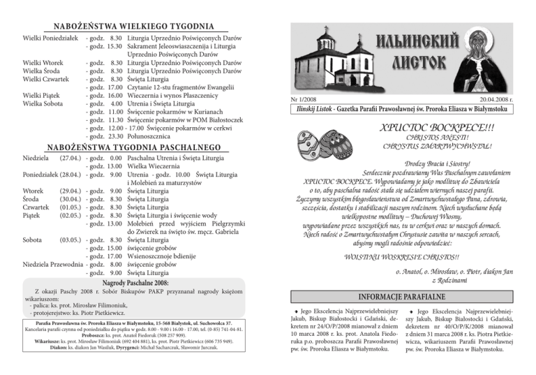 NABOŻEŃSTWA WIELKIEGO TYGODNIA Wielki Poniedziałek Wielki Wtorek Wielka Środa Wielki Czwartek Wielki Piątek Wielka Sobota - godz. 8.30 Liturgia Uprzednio Poświęconych Darów - godz. 15.30 Sakrament Jeleoswiaszczenija i Liturgia Uprzednio Poświęconych Darów - godz. 8.30 Liturgia Uprzednio Poświęconych Darów - godz. 8.30 Liturgia Uprzednio Poświęconych Darów - godz. 8.30 Święta Liturgia - godz. 17.00 Czytanie 12-stu fragmentów Ewangelii - godz. 16.00 Wieczernia i wynos Płaszczenicy - godz. 4.00 Utrenia i Święta Liturgia - godz. 11.00 Święcenie pokarmów w Kurianach - godz. 11.30 Święcenie pokarmów w POM Białostoczek - godz. 12.00 - 17.00 Święcenie pokarmów w cerkwi - godz. 23.30 Połunoszcznica NABOŻEŃSTWA TYGODNIA PASCHALNEGO Niedziela (27.04.) - godz. 0.00 - godz. 13.00 Poniedziałek (28.04.) - godz. 9.00 Wtorek (29.04.) - godz. 9.00 Środa (30.04.) - godz. 8.30 Czwartek (01.05.) - godz. 8.30 Piątek (02.05.) - godz. 8.30 - godz. 13.00 Sobota (03.05.) - godz. 8.30 - godz. 15.00 - godz. 17.00 Niedziela Przewodnia - godz. 8.00 - godz. 9.00 Paschalna Utrenia i Święta Liturgia Wielka Wieczernia Utrenia - godz. 10.00 Święta Liturgia i Molebień za maturzystów Święta Liturgia Święta Liturgia Święta Liturgia Święta Liturgia i święcenie wody Molebień przed wyjściem Pielgrzymki do Zwierek na święto św. męcz. Gabriela Święta Liturgia święcenie grobów Wsienoszcznoje bdienije święcenie grobów Święta Liturgia Nagrody Paschalne 2008: Z okazji Paschy 2008 r. Sobór Biskupów PAKP przyznanał nagrody księżom wikariuszom: - palica: ks. prot. Mirosław Filimoniuk, - protojerejstwo: ks. Piotr Pietkiewicz. Parafia Prawosławna św. Proroka Eliasza w Białymstoku, 15-568 Białystok, ul. Suchowolca 37. Kancelaria parafii czynna od poniedziałku do piątku w godz. 8.00 - 9.00 i 16.00 - 17.00, tel. (0-85) 741-04-81. Proboszcz: ks. prot. Anatol Fiedoruk (508 257 909). Wikariusze: ks. prot. Mirosław Filimoniuk (692 404 881), ks. prot. Piotr Pietkiewicz (606 735 949). Diakon: ks. diakon Jan Wasiluk, Dyrygenci: Michał Sacharczuk, Sławomir Jurczuk. Nr 1/2008 20.04.2008 r. Ilinskij Listok - Gazetka Parafii Prawosławnej św. Proroka Eliasza w Białymstoku XPUCTOC BOCKPECE!!! CHRISTOS ANESTI! CHRYSTUS ZMARTWYCHWSTAŁ! Drodzy Bracia i Siostry! Serdecznie pozdrawiamy Was Paschalnym zawołaniem XPUCTOC BOCKPECE. Wypowiadamy je jako modlitwę do Zbawiciela o to, aby paschalna radość stała się udziałem wiernych naszej parafii. Życzymy wszystkim błogosławieństwa od Zmartwychwstałego Pana, zdrowia, szczęścia, dostatku i stabilizacji naszym rodzinom. Niech wysłuchane będą wielkopostne modlitwy – Duchowej Wiosny, wypowiadane przez wszystkich nas, tu w cerkwi oraz w naszych domach. Niech radość o Zmartwychwstałym Chrystusie zawita w naszych sercach, abyśmy mogli radośnie odpowiedzieć: WOISTINU WOSKRESIE CHRISTOS!! o. Anatol, o. Mirosław, o. Piotr, diakon Jan z Rodzinami INFORMACJE PARAFIALNE • Jego Ekscelencja Najprzewielebniejszy Jakub, Biskup Białostocki i Gdański, dekretem nr 24/O/P/2008 mianował z dniem 10 marca 2008 r. ks. prot. Anatola Fiedoruka p.o. proboszcza Parafii Prawosławnej pw. św. Proroka Eliasza w Białymstoku. • Jego Ekscelencja Najprzewielebniejszy Jakub, Biskup Białostocki i Gdański, dekretem nr 40/O/P/K/2008 mianował z dniem 31 marca 2008 r. ks. Piotra Pietkiewicza, wikariuszem Parafii Prawosławnej pw. św. Proroka Eliasza w Białymstoku. Z głębokim smutkiem pożegnaliśmy naszego proboszcza ks. prot. Mikołaj Borowika, który 04.03.2008 r. w nocy odszedł od nas do Pana w monasterze w Gorodoku koło Równego na Ukrainie. Był znakomitym kaznodzieją, utalentowanym kapłanem, duszpasterzem i gospodarzem. Przemawiał słowami pełnymi wzruszeń i nastrojowości. Pozostawił po sobie dobroć, serdeczność i wrażliwość na drugiego człowieka. Potrafił godnie wykorzystać każdy dar od Boga. Świadomie opierał swoje zdolności na niepowtarzalnych i nieprzemijających wartościach ewangelicznych, którymi kierował się w życiu. Ksiądz Mikołaj urodził się 22 stycznia 1955 r. w Jelonce niedaleko od Kleszczel. Z rodzinnego domu wyniósł umiłowanie do Cerkwi i służby Bożej. Być może dlatego wybrał w życiu drogę do stanu kapłańskiego, był absolwentem Prawosławnego Seminarium Duchownego w Warszawie, Wyższego Prawosławnego Seminarium Duchownego w Jabłecznej i Chrześcijańskiej Akademii Teologicznej w Warszawie. Po zawarciu związku małżeńskiego z Haliną Rajecką w 1979 r. ówczesny metropolita warszawski i całej Polski Bazyli udzielił mu święceń diakońskich. Lata 1979-1981 ks. Mikołaj spędził jako diakon przy katedrze św. Aleksandra Newskiego w Łodzi. Następnie w 1981 r. przeszedł w skład kleru diecezji białostocko-gdańskiej. 25 października 1981 r. ówczesny biskup białostocki i gdański Sawa, udzielił mu święceń kapłańskich i delegował jako wikariusza do Parafii Prawosławnej św. Proroka Eliasza w Białymstoku, w której pracował nieustannie przez 25 lat. Dnia 29 grudnia 1993 r. został proboszczem parafii św. Proroka Eliasza i posługę tę pełnił do ostatniego dnia swojego życia. Okres ten zaowocował wytężoną pracą duszpasterską i troską o rozwój parafii. Doprowadził do realizacji gruntownej modernizacji świątyni i cmentarza parafialnego. Zorganizował remont elewacji zewnętrznej i wymianę pokrycia dachu oraz kopuł cerkwi, renowację zabytkowego ogrodzenia cmentarza, ułożenia nawierzchni alejek i uporządkowania terenu cmentarza. Zadbał o zwiększenie areału cmentarza, do poszerzenia którego przygotowywał się przed swoją śmiercią. Gościnność ojca Mikołaj była znana wszystkim, którzy go odwiedzali. Nikt nie wyszedł od niego nie wysłuchany, czy też bez skromnego poczęstunku. Często sam na tym cierpiał poświęcając czas odpoczynku, ale jak mówił, powtarzając słowa apostoła Pawła: druh druha tiahoty nositie