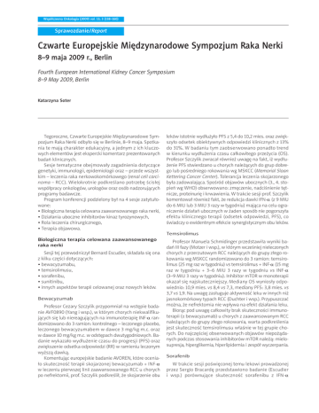 Współczesna Onkologia (2009) vol. 13; 3 (158–160) Sprawozdanie/Report Czwarte Europejskie Międzynarodowe Sympozjum Raka Nerki 8–9 maja 2009 r., Berlin Fourth European International Kidney Cancer Symposium 8–9 May 2009, Berlin Katarzyna Soter Tegoroczne, Czwarte Europejskie Międzynarodowe Sympozjum Raka Nerki odbyło się w Berlinie, 8–9 maja. Spotkania te mają charakter edukacyjny, a jednym z ich kluczowych elementów jest ekspercki komentarz prezentowanych badań klinicznych. Sesje tematyczne obejmowały zagadnienia dotyczące genetyki, immunologii, epidemiologii oraz – przede wszystkim – leczenia raka nerkowokomórkowego (renal cell carcinoma – RCC). Wielokrotnie podkreślano potrzebę ścisłej współpracy onkologów, urologów oraz osób nadzorujących programy badawcze. Program konferencji podzielony był na 4 sesje zatytułowane: • Biologiczna terapia celowana zaawansowanego raka nerki, • Działania uboczne inhibitorów kinaz tyrozynowych, • Rola leczenia chirurgicznego, • Terapia objawowa. leków istotnie wydłużyło PFS z 5,4 do 10,2 mies. oraz zwiększyło odsetek obiektywnych odpowiedzi klinicznych z 13% do 31%. W badaniu tym zaobserwowano ponadto trend w kierunku wydłużenia czasu całkowitego przeżycia (OS). Profesor Szczylik zwracał również uwagę na fakt, iż wydłużenie PFS stwierdzano u chorych należących do grup dobrego lub pośredniego rokowania wg MSKCC (Memorial Sloan Kettering Cancer Center). Tolerancja leczenia skojarzonego była zadowalająca. Spośród objawów ubocznych (3., 4. stopień wg WHO) obserwowano: zmęczenie, nadciśnienie tętnicze, proteinurię i krwawienia. W trakcie sesji prof. Szczylik komentował również fakt, że redukcja dawki IFN-α (z 9 MIU do 6 MIU lub 3 MIU 3 razy w tygodniu) mająca na celu ograniczenie działań ubocznych w żaden sposób nie pogorszyła efektu klinicznego terapii (odsetek odpowiedzi, PFS), co świadczy o ewidentnym efekcie synergistycznym obu leków. Temsirolimus Biologiczna terapia celowana zaawansowanego raka nerki Sesji tej przewodniczył Bernard Escudier, składała się ona z kilku części dotyczących: • bewacyzumabu, • temsirolimusu, • sorafenibu, • sunitinibu, • innych aspektów terapii celowanej oraz nowych leków. Bewacyzumab Profesor Cezary Szczylik przypomniał na wstępie badanie AVF0890 (Yang i wsp.), w którym chorych niekwalifikujących się lub niereagujących na immunoterapię INF-α randomizowano do 3 ramion: kontrolnego – leczonego placebo, leczonego bewacyzumabem w dawce 3 mg/kg m.c. oraz w dawce 10 mg/kg m.c. w odstępach dwutygodniowych. Badanie wykazało wydłużenie czasu do progresji (PFS) oraz zwiększenie odsetka odpowiedzi (RR) w ramieniu leczonym wyższą dawką. Komentując europejskie badanie AVOREN, które oceniało skuteczność terapii skojarzonej bewacyzumab + INF-α w leczeniu pierwszej linii zaawansowanego RCC u chorych po nefrektomii, prof. Szczylik podkreślił, że skojarzenie obu Profesor Manuela Schmidinger przedstawiła wyniki badań III fazy (Motzer i wsp.), w którym wcześniej nieleczonych chorych z przerzutowym RCC należących do grupy złego rokowania wg MSKCC randomizowano do 3 ramion: temsirolimus (25 mg raz w tygodniu) vs temsirolimus + INF-α (15 mg raz w tygodniu + 3–6 MIU 3 razy w tygodniu vs INF-α (3–9 MIU 3 razy w tygodniu). Inhibitor mTOR w monoterapii okazał się najskuteczniejszy. Mediany OS wyniosły odpowiednio: 10,9 mies. vs 8,4 vs 7,3, mediany PFS: 3,8 mies. vs 3,7 vs 1,9. Na uwagę zasługuje aktywność leku w innych niż jasnokomórkowy typach RCC (Duchter i wsp.). Przypuszczać można, że nefrektomia nie wpływa na efekt działania leku. Biorąc pod uwagę całkowity brak skuteczności immunoterapii (± bewacyzumab) u chorych z zaawansowanym RCC należących do grupy złego rokowania, warta podkreślenia jest skuteczność temsirolimusu właśnie w tej grupie chorych. Do najczęściej obserwowanych objawów niepożądanych podczas stosowania inhibitorów mTOR należą: mielosupresja, hiperglikemia, hiperlipidemia i zespół wyczerpania. Sorafenib W trakcie sesji poświęconej temu lekowi prowadzonej przez Sergio Bracardę przedstawiono badanie (Escudier i wsp.) porównujące skuteczność sorafenibu z IFN-α Czwarte Europejskie Międzynarodowe Sympozjum Raka Nerki w pierwszym rzucie leczenia chorych z zaawansowanym RCC. Przedmiotem analizy był PFS, OS oraz RR. Badanie prowadzone było w dwóch etapach: chorzy leczeni INF-α w przypadku progresji choroby otrzymywali sorafenib w dawce standardowej (800 mg/dobę), natomiast u chorych w ramieniu z sorafenibem w dawce 800 mg/dobę w przypadku progresji podwajano dawkę inhibitora kinazy tyrozynowej (1600 mg/dobę). W badaniu tym wykazano, że podobną skuteczność obu badanych leków w zakresie PFS, przy lepszej tolerancji oraz wyższym odsetku odpowiedzi (79 vs 69%) w ramieniu leczonym sorafenibem. Dodatkowo wykazano, że podwojenie dawki leku w momencie progresji umożliwia czasowe uzyskanie stabilizacji choroby (mediana wynosiła 3,6 mies.). W sesji poświęconej sorafenibowi przedstawiono także wyniki badań retrospektywnych i prospektywnych oceniające skuteczność leczenia sekwencyjnego z zastosowaniem sorafenibu vs sunitinib, z procedurą crossover po progresji. W ramieniu z sorafenibem w pierwszej linii leczenia wykazano istotne wydłużenie PFS: o 9,6 mies.(Dudek i wsp.); 7,5 mies. (Choueiri i wsp.) lub 2,8 mies. (Sablin i wsp.) w porównaniu z sunitinibem w pierwszej linii. Podczas dyskusji podkreślano, że niezbędne jest przeprowadzenie dalszych badań prospektywnych porównujących skuteczność zastosowanych leków, ich optymalnego dawkowania i sekwencji. Sunitinib W sesji poświęconej temu lekowi prof. Martin Gore przedstawił wyniki wcześniejszego badania (Motzer i wsp.) porównującego leczenie IFN-α i sunitinibem w pierwszej linii u chorych z uogólnionym RCC. W badaniu tym autorzy wykazali utrzymującą się korzyść z lecz