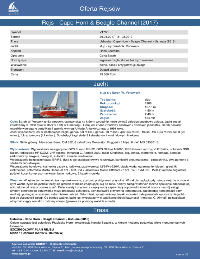 Oferta Rejsów Rejs - Cape Horn & Beagle Channel (2017) Symbol V1708 Termin 20.03.2017 - 31.03.2017 Trasa Ushuaia - Cape Horn - Beagle Channel - Ushuaia (2016) Jacht slup - s/y Sarah W. Vorwwerk Kapitan Henk Boersma Opis ceny Cena Sarah Rodzaj rejsu wyprawa żeglarska na trudnym akwenie Wyżywienie pełne, posiłki przygotowuje załoga Transport Dojazd własny Cena 13 500 PLN Jacht slup s/y Sarah W. Vorwwerk Typ jachtu: slup Rok produkcji: 1988 Długość: 16.15 m Szerokość: 4.50 m Zanurzenie: 2.40 m Żagle: 154 m2 Opis: Sarah W. Vorwerk to 53-stopowy, stalowy slup na którym wygodnie może pływać dziesięcioosobowa załoga. Jacht został zbudowany w 1988 roku w stoczni Feltz w Hamburgu, która jest znana z budowy solidnych i dzielnych jednostek. Sarah posiada wszelkie wymagane certyfikaty i spełnia wymogi Układu Antarktycznego z 1991 roku. Jacht wyposażony jest w następujące żagle: genua (90 m.kw.), genua (70 m.kw.), grot (64 m.kw.), traisel, fok I (54 m.kw), fok II (20 m.kw.), fok sztormowy (11 m.kw.). Do obsługi żagli służy 9 kabestanów i wind fałowych Harkena. Silnik: Silnik główny: Mercedes-Benz, OM 352, 6 cylindrowy Generator: Ruggerini / Allpa, 6 KW, MD 095601 E Wyposażenie: Wyposażenie nawigacyjne: GPS Furuno GP-32, GPS Globos M2000, GPS Garmin ręczny, VHF Sailor, odbiornik SSB Sailor, radiostacja HF ICOM, VHF ręczne, Inmarsat C, Airmail 2000, radar Kingfisher, log, sonda, wiatromierz, kompas, kompas elektroniczny fluxgate, barograf, autopilot, lornetki, noktowizor. Wyposażenie bezpieczeństwa: EPIRB, dwie 6-cio osobowe trwtwy ratunkowe, kamizelki pneumatyczne, pirotechnika, dwa pontony z silnikami zaburtowymi. Wyposażenie hotelowe: kuchenka gazowa, lodówka, przetwornica 12/24V->220V, ciepła woda, ogrzewanie (diesel), grzejniki elektryczne, sztormiaki Musto Ocean (3 szt. (1xM, 2xL), sztormiaki Musto Offshore (7 szt., 1xS, 1xM, 3xL, 2xXL); kalosze żeglarskie, pościel, koce, kompresor nurkowy, butle nurkowe, 2 kajaki morskie. Wnętrze: Wnętrze jachtu zostało tak zaprojektowane, aby było praktyczne i przytulne. W trakcie żeglugi, gdy załoga wejdzie w morski rytm wacht, życie na jachcie toczy się głównie w mesie znajdującej się na rufie. Kabiny załogi w których można spokojnie odpocząć są oddzielone od reszty pomieszczeń. Dwie toalety i prysznic z ciepłą wodą zapewniają odpowiedni komfort i dobry nastrój załogi. System centralnego ogrzewania może pracować całą dobę, aby zapewnić przyjemną temperaturę, zapobiegać kondensacji pary wodnej i pomagać w suszeniu sztormiaków i ubrań. Sztormiaki, sprzęt nurkowy, kajaki morskie i całe pozostałe wyposażenie jachtu jest do dyspozycji załogi. Co bardzo ważne, jacht jest wyposażony w satelitarne środki łączności (Inmarsat C, Airmail) pozwalające utrzymać ciągły kontakt z rodziną w kraju (głównie za pomocą krótkich e-maili). Trasa Ushuaia - Cape Horn - Beagle Channel - Ushuaia (2016) Celem wyprawy jest opłynięcie Przylądka Horn i eksploracja Kanału Beagle'a, w którym możemy podziwiać wiele monumentalnych lodowców. SZCZEGÓŁOWY PLAN REJSU Dzień 1: Ushuaia (54º56'S / 068º06'W) Agencja Żeglarska KUBRYK - Wojciech Czerwiński siedziba: 05 - 830 Stara Wieś, ul. Piękna 21, biuro i adres korespondencyjny: 05 - 830 Stara Wieś, ul. Piękna 21 tel.: 22 810 00 42, fax: 22 201 07 38, email: [email protected] www.kubryk.pl strona 1/3 Oferta Rejsów Obserwujemy piękny widok na Beagle Channel i otaczające go lodowce z lądującego samolotu. Na Sahrę okrętujemy się przy kei Club Nautico. Wybieramy swoją kabinę i koję. Zapoznajemy się z jachtem i jego załogą. Ostatnie duże zakupy, które muszą wystarczyć na dwa tygodnie. Wypływamy na Beagle Channel, mijamy Isla dos Lobos z tysiącami słoni morskich i kormoranów. Dzień 2: Puerto Williams (54º56'S / 067º36'W) Kotwiczymy w Seno Lauro - najlepszym naturalnym porcie tego rejonu. Wrak "Micalvi" jest naszą keją i zarazem zapewnia wszystkie udogodnienia mariny: pub i prysznic. Cumuje tu sporo jachtów zmierzających w stronę Antarktydy lub płynących w głąb chilijskich kanałów. Dzień 3: Puerto Toro (55º05'S / 067º06'W) Zostawiamy za rufą Puerto Williams z jego 1200-toma mieszkańcami. Żeglujemy przez Beagle Channel do Puerto Toro - najbardziej na południe wysuniętej osady ludzkiej. Pięćdziesięciu mieszkańców. Przy butelce whiskey rozprawiamy się z dużą porcją krabów królewskich. Dokładnie analizujemy sytuację meteo i prognozy, aby wybrać najlepszy moment na wypłynięcie w stronę Hornu. Dzień 4: Bahia Scourfield (55º45'S / 067º20'W) Wczesnym rankiem możemy obserwować tutejsze bobry grasujące po wyspach Lennox i Nueva. Na Isla Evout zobaczymy kolonię lęgową albatrosów. Kotwiczymy przy Bahia Scourfield na archipelagu Wollaston. Trekking do pobliskiego jeziora. Dzień 5: Cape Horn (55º50'S / 067º18'W) Symboliczny koniec świata. Sławna skała z którą związane jest wiele historii i katastrof morskich. Odwiedzimy wyspę i posterunek chilijskiej straży granicznej, gdzie możemy podstemplować paszporty. Dzień 6: Opływamy Cape Horn Prawdopodobnie to będzie ciężki dzień! Wzburzone morze, krótka i stroma fala, zmienne lokalne wiatry, mokro i zimno. Ostra żegluga. Kontaktujemy się przez radio ze stacją Cabo de Hornos, która przekazuje nasze dane do Puerto Williams. Zostajemy zarejestrowani, opłynęliśmy Horn. W drodze na zasłużony odpoczynek do Caleta Martial towarzyszą nam albatrosy i petrele. Dzień 7: Caleta Martial (55º40'S / 067º25'W) W końcu mamy troszkę odpoczynku. Możemy pójść na dłuższy trekking wzdłuż wybrzeża do miejsca gdzie żyją Indianie Yamana. Mieszkają w otwartych chatkach-szałasach, z otwartym paleniskiem po środku. Po powrocie z wycieczki kierujemy się ponownie w stronę Puerto Williams. Dzień 8: Puerto Williams (54º56'S / 067º36'W) Uzupełniamy zapasy paliwa, słodkiej wody i - co najbardziej nas cieszy - świe