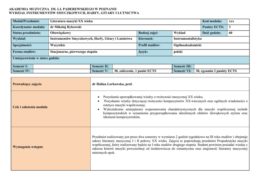Literatura muzyki XX wieku - Akademia Muzyczna im. Ignacego