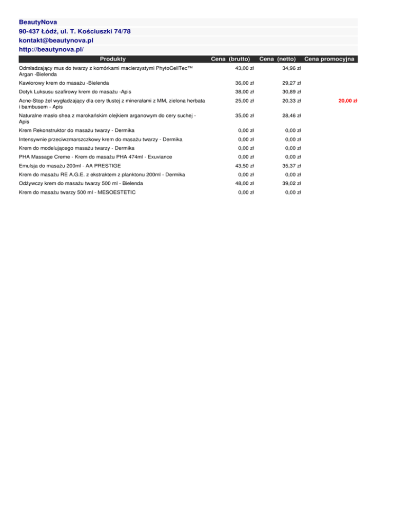 BeautyNova 90-437 Łódź, ul. T. Kościuszki 74/78 [email protected] http://beautynova.pl/ Produkty Cena (brutto) Cena (netto) Odmładzający mus do twarzy z komórkami macierzystymi PhytoCellTec™ Argan -Bielenda 43,00 zł 34,96 zł Kawiorowy krem do masażu -Bielenda 36,00 zł 29,27 zł Dotyk Luksusu szafirowy krem do masażu -Apis 38,00 zł 30,89 zł Acne-Stop żel wygładzający dla cery tłustej z minerałami z MM, zielona herbata i bambusem - Apis 25,00 zł 20,33 zł Naturalne masło shea z marokańskim olejkiem arganowym do cery suchej Apis 35,00 zł 28,46 zł Krem Rekonstruktor do masażu twarzy - Dermika 0,00 zł 0,00 zł Intensywnie przeciwzmarszczkowy krem do masażu twarzy - Dermika 0,00 zł 0,00 zł Krem do modelującego masażu twarzy - Dermika 0,00 zł 0,00 zł PHA Massage Creme - Krem do masażu PHA 474ml - Exuviance 0,00 zł 0,00 zł 43,50 zł 35,37 zł 0,00 zł 0,00 zł 48,00 zł 39,02 zł 0,00 zł 0,00 zł Emulsja do masażu 200ml - AA PRESTIGE Krem do masażu RE A.G.E. z ekstraktem z planktonu 200ml - Dermika Odżywczy krem do masażu twarzy 500 ml - Bielenda Krem do masażu twarzy 500 ml - MESOESTETIC Cena promocyjna 20,00 zł