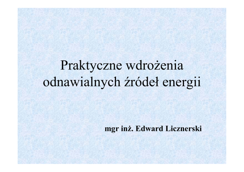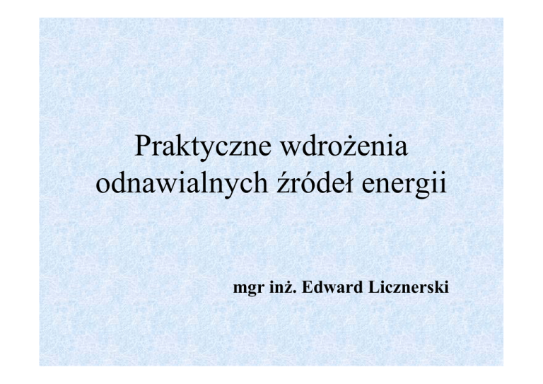 Praktyczne wdrożenia odnawialnych źródeł energii mgr inż. Edward Licznerski Czystość atmosfery Efekt cieplarniany, wzrost temperatury planety spowodowany zwiększoną koncentracją dwutlenku węgla jeden z negatywnych skutków skażenia środowiska naturalnego. Polega na zatrzymywaniu się w atmosferze coraz większych części promieniowania podczerwonego, co prowadzi do ogrzewania się Ziemi. Przypuszcza się, że jest to wynik zmiany zawartości gazów w powietrzu, a szczególnie gwałtownego wzrostu stężenia dwutlenku węgla. Prognozy zakładają, że jeśli tempo spalania paliw kopalnych utrzyma się, to w ciągu 40– 45 lat może nastąpić nasycenie nim atmosfery, co spowodowałoby średni wzrost powierzchniowej temperatury Ziemi o ok. 1,5–4,5°C. Jeśli globalna temperatura wzrośnie powyżej 2OC to: -Setki milionów ludzi będzie cierpieć na skutek malarii, głodu, braku wody i kataklizmów, takich jak powodzie susze i huragany -Na skutek topnienia lodowców podniesie się poziom mórz, przez co zagładzie ulegną kraje nisko położone, takie jak Bangladesz, południowe Chiny czy kraje wyspiarskie, nie wspominając o Belgii, Holandii północnych Niemczech czy południowej Anglii -Zginie wiele gatunków roślin i zwierząt -Ekonomiczne koszta zmian rozłożą się nierówno pomiędzy kraje bogate i biedne, doprowadzając do kryzysów gospodarczych w wielu krajach Afryki, Azji i Ameryki Południowej Spalanie paliw kopalnych w celu produkcji energii zwiększa emisję gazów cieplarnianych, co z kolei jest główną przyczyną globalnego ocieplenia. Zgodnie z opinią Światowej Organizacji Zdrowia, zmiany klimatu powodują śmierć ok. 150 tys. osób rocznie. Kraje wysoko uprzemysłowione, które w największym stopniu są odpowiedzialne za to zjawisko, muszą zmodernizować swój system energetyczny i jak najszybciej zwiększyć udział energii odnawialnych w całkowitej produkcji energii Od ponad wieku zaspokojenie energetycznych potrzeb człowieka uzależnione jest od paliw kopalnych, takich jak ropa, węgiel czy gaz. Obecnie na całym świecie człowiek, a także środowisko naturalne, doświadcza skutków tego uzależnienia. Globalne ocieplenie, spowodowane spalaniem paliw kopalnych jest jednym z najpoważniejszych problemów z jakimi mamy do czynienia. Nasza cywilizacja doprowadziła do zmiany warunków klimatycznych, niezbędnych do istnienia życia na ziemi i skutki są katastrofalne – ekstremalne zjawiska pogodowe, takie jak susze i powodzie, topnienie biegunów, podnoszenie się poziomu mórz czy zniszczenie raf koralowych. Istnieją jeszcze szanse na zwolnienie procesu globalnego ocieplenia i uniknięcie katastrofy klimatycznej, którą przewidują naukowcy. Alternatywne rozwiązania już istnieją. Odnawialne źródła, takie jak energia słoneczna czy wiatrowa, są bezpieczne dla środowiska naturalnego i korzystne ze względów ekonomicznych. Źródło: Swiat Nauki nr 10.2005 GŁÓWNE ELEMENTY WZAJEMNEGO ODDZIAŁYWANIA W DĄŻENIU DO ZRÓWNOWAŻONEGO ROZWOJU MODEL IDEALNEJ RÓWNOWAGI Energie odnawialne – dyspozycyjność energii pierwotnej Źródło: Fraunhofer Institut Umwelt Biomasa płynna Energia wiatru E.słońca-ciepło Geotermia E.słońca-prąd %Udział w PEV Udział energii elektrycznej w zużyciu energii pierwotnej Energia pierwotna [PJ] Energia wody Biomasa stała Biomasa gazowa Wytwarzanie i produkcja biogazu Energetyczne użytkowanie biomasy Biomasy drzewne Biomasy różne Biomasy olejowe Biomasy skrobiowe Zgazowanie Fermentacja beztlenowa Przerób olei roślinnych Fermentacja alkoholowa Gaz z drewna Biogaz Biodiesel Bioalkohol Biomasa Przemiana Materiał palny Przemiana Zastosowanie Spalanie z wytwarzaniem pary lub ORC Spalanie Ciepło Źródło: Fraunhofer Institut Umwelt EC, ogniwo paliwowe, turbina gazowa Zimno Prąd Motor Możliwość przemieszczania PROBLEM ■ Energetyka światowa jest zatrważająco mato wydajna. W elektrowniach i budynkach mieszkalnych marnotrawione są olbrzymie ilości ciepła, samochody rozpraszają większość energii paliwa w otoczeniu, a sprzęt domowy nieefektywnie wykorzystuje energię elektryczną (nierzadko obciążając sieć nawet wtedy, gdy jest wyłączony). ■ Jeśli nic w tej sprawie nie zrobimy, zużycie paliw będzie nada! rosło, wysysając z gospodarki setki miliardów dolarów rocznie, potęgując niekorzystne zmiany klimatyczne i przyczyniając się do zanieczyszczenia środowiska oraz wyczerpywania zasobów naturalnych. ROZWIĄZANIE ■ Poprawa efektywności wykorzystania energii przez końcowego użytkownika to najszybszy i najbardziej intratny sposób jej oszczędzania. Urządzenia o zwiększonej wydajności energetycznej często nie są droższe od niewydajnych. Energooszczędne domy i fabryki mogą okazać się tańsze w budowie. Poprzez zmniejszenie ciężaru samochodów można bez zmiany ich cen dwukrotnie obniżyć zużycie paliwa, nie naruszając wymogów bezpieczeństwa. i Dzięki podwyższeniu efektywności urządzeń energetycznych i wykorzystaniu odnawialnych źródeł energii Stany Zjednoczone są w stanie wyeliminować ropę naftową jako źródło energii przed rokiem 2050. Źródło: Swiat Nauki nr 10.2005 Straty, do jakich dochodzi na kolejnych ogniwach łańcucha energetycznego, uszczuplają energię paliwa dostarczonego do elektrowni - przyjmijmy, że jest to 100 jednostek - o ponad 90%, pozostawiając zaledwie 9.5 jednostki w postaci energii dostępnej dla odbiorcy. Jednak już niewielkie zwiększenie efektywności u odbiorcy może znacznie obniżyć tę piramidę strat. Na przykład zaoszczędzenie jednej jednostki energii dzięki zredukowaniu tarcia wewnątrz rurociągu zmniejsza wymaganą początkową ilość energii o 10 jednostek. Obniżają się koszty własne elektrowni i poziom zanieczyszczenia, a odbiorca może użyć mniejszych, a tym samym tańszych, pomp i silników. Źródło: Swiat Nauki nr 10.2005 Każdy wykład będzie się składał z trzech części 