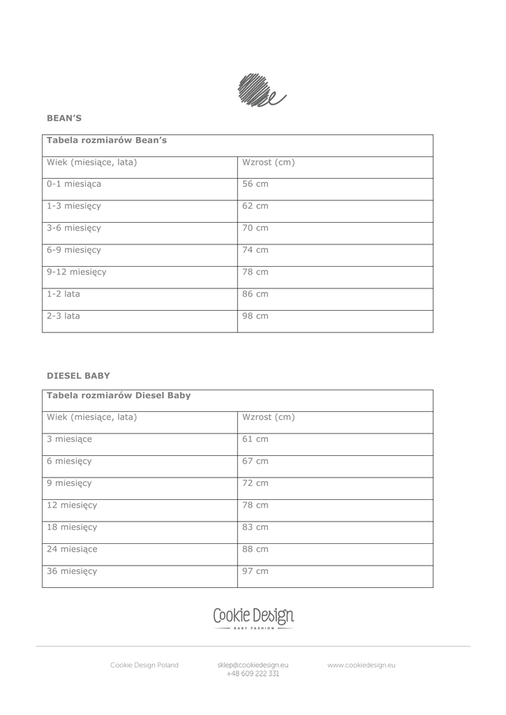 BEAN’S Tabela rozmiarów Bean’s Wiek (miesiące, lata) Wzrost (cm) 0-1 miesiąca 56 cm 1-3 miesięcy 62 cm 3-6 miesięcy 70 cm 6-9 miesięcy 74 cm 9-12 miesięcy 78 cm 1-2 lata 86 cm 2-3 lata 98 cm DIESEL BABY Tabela rozmiarów Diesel Baby Wiek (miesiące, lata) Wzrost (cm) 3 miesiące 61 cm 6 miesięcy 67 cm 9 miesięcy 72 cm 12 miesięcy 78 cm 18 miesięcy 83 cm 24 miesiące 88 cm 36 miesięcy 97 cm IMPS AND ELFS Tabela rozmiarów Imps & Elfs Wiek (miesiące, lata) Wzrost (cm) 0 miesięcy 50 cm 3 miesiące 56 cm 6 miesięcy 62 cm 9 miesięcy 68 cm 12 miesięcy 74 cm 18 miesięcy 80 cm 24 miesiące 86 cm 2 lata 92 cm 3 lata 98 cm OEUF Tabela rozmiarów Oeuf Wiek (miesiące, lata) Wzrost (cm) 3 miesiące 45,5-58,5 cm 6 miesięcy 58,5-66 cm 12 miesięcy 66-73,5 cm 18 miesięcy 73,5-81,5 cm 2 lata 81,5-86,5 cm 3 lata 86,5-94 cm 4 lata 94-101,5 cm 5 lat 101,5-109 cm 6 lat 109-119,5 cm TINY COTTONS – dotyczy kolekcji SS15 Tabela rozmiarów Tinycottons Wiek (miesiące, lata) Wzrost (cm) 3-6 miesięcy 62-68 cm 6-12 miesięcy 70-81 cm 12-18 81-89 cm 2 lata 82-94 cm 4 lata 95-108 cm 6 lat 108-121 cm 8 lat 121-134 cm TINY COTTONS-dotyczy kolekcji SS14 oraz FW14 Tabela rozmiarów Tinycottons Wiek (miesiące, lata) Wzrost (cm) 0-3 miesięcy 58-69 cm 6-12 miesięcy 70-81 cm 2 lata 82-94 cm 4 lata 95-108 cm TOCOTO VINTAGE Tabela rozmiarów Tocoto Vintage Wiek (miesiące, lata) Wzrost (cm) 0 miesięcy 50 cm 1-3 miesięcy 54 cm (52 cm – 56 cm) 3-6 miesięcy 60 cm (58 cm – 64 cm) 6-9 miesięcy 67 cm (67 cm – 70 cm) 9-12 miesięcy 74 cm (72 cm – 76 cm) 12-18 miesięcy 78 cm (78 cm – 82 cm) 18-24 miesięcy 81 cm (81 cm – 86 cm) 24 miesiące 86 cm (86 cm – 92 cm) 3 lata 94 cm (94 cm – 98 cm)