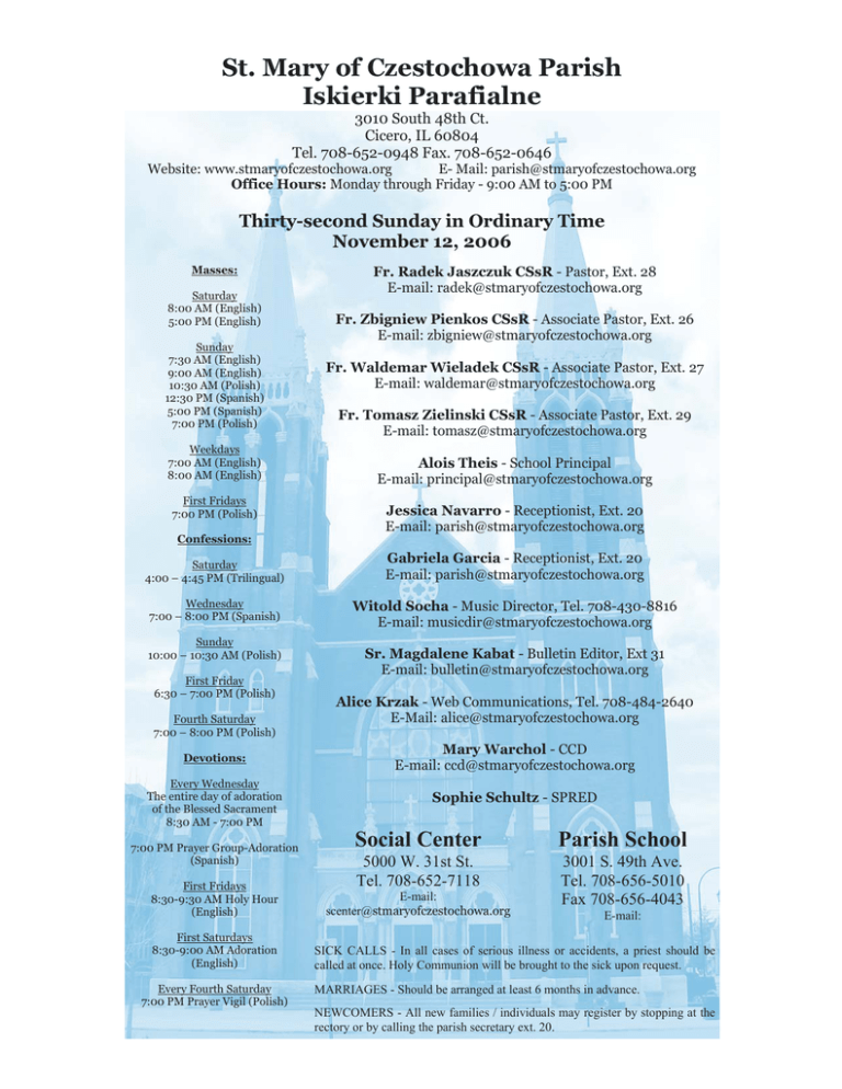 St. Mary of Czestochowa Parish Iskierki Parafialne 3010 South 48th Ct. Cicero, IL 60804 Tel. 708-652-0948 Fax. 708-652-0646 Website: www.stmaryofczestochowa.org E- Mail: [email protected] Office Hours: Monday through Friday - 9:00 AM to 5:00 PM Thirty-second Sunday in Ordinary Time November 12, 2006 Masses: Saturday 8:00 AM (English) 5:00 PM (English) Sunday 7:30 AM (English) 9:00 AM (English) 10:30 AM (Polish) 12:30 PM (Spanish) 5:00 PM (Spanish) 7:00 PM (Polish) Weekdays 7:00 AM (English) 8:00 AM (English) First Fridays 7:00 PM (Polish) Confessions: Fr. Radek Jaszczuk CSsR - Pastor, Ext. 28 E-mail: [email protected] Fr. Zbigniew Pienkos CSsR - Associate Pastor, Ext. 26 E-mail: [email protected] Fr. Waldemar Wieladek CSsR - Associate Pastor, Ext. 27 E-mail: [email protected] Fr. Tomasz Zielinski CSsR - Associate Pastor, Ext. 29 E-mail: [email protected] Alois Theis - School Principal E-mail: [email protected] Jessica Navarro - Receptionist, Ext. 20 E-mail: [email protected] Saturday 4:00 – 4:45 PM (Trilingual) Gabriela Garcia - Receptionist, Ext. 20 E-mail: [email protected] Wednesday 7:00 – 8:00 PM (Spanish) Witold Socha - Music Director, Tel. 708-430-8816 E-mail: [email protected] Sunday 10:00 – 10:30 AM (Polish) First Friday 6:30 – 7:00 PM (Polish) Fourth Saturday 7:00 – 8:00 PM (Polish) Sr. Magdalene Kabat - Bulletin Editor, Ext 31 E-mail: [email protected] Alice Krzak - Web Communications, Tel. 708-484-2640 E-Mail: [email protected] Devotions: Mary Warchol - CCD E-mail: [email protected] Every Wednesday The entire day of adoration of the Blessed Sacrament 8:30 AM - 7:00 PM Sophie Schultz - SPRED 7:00 PM Prayer Group-Adoration (Spanish) First Fridays 8:30-9:30 AM Holy Hour (English) First Saturdays 8:30-9:00 AM Adoration (English) Every Fourth Saturday 7:00 PM Prayer Vigil (Polish) Social Center Parish School 5000 W. 31st St. Tel. 708-652-7118 3001 S. 49th Ave. Tel. 708-656-5010 Fax 708-656-4043 E-mail: [email protected] E-mail: SICK CALLS - In all cases of serious illness or accidents, a priest should be called at once. Holy Communion will be brought to the sick upon request. MARRIAGES - Should be arranged at least 6 months in advance. NEWCOMERS - All new families / individuals may register by stopping at the rectory or by calling the parish secretary ext. 20. Sunday Iskierki Parafialne MASS INTENTIONS November 12, Thirty-second Sunday in Ordinary Time 7:30 Parishioners 9:00 †Ed Kandl (Mr. & Mrs. Jim Blessent) †Wanda Glowacki (L. Gorczynski) †Katherine Ellis (Mary Warchol) 10:30 †Za zmarłych, których imiona zostały zapisane w wypominkach. †Janusz Ślęzak †Andrzej Gil †Janusz Ślęzak 12:30 †Andrea Ramirez (hijos) †Cuca Guerrero (hija Silvia Robles) †Nicolas Robles (Norma Robles) †Maria Del Refugio Robles & Pablo Rodriguez ) (aniversario 15 años, Ana Maria) †Clotilde García (Irma Martínez) 5:00 Por los feligreses 7:00 O zdrowie i bł. Boże dla Kasi i Michała †Jan Szczepaniak (7-a rocz. śm.) November 13, Monday, Francis Xavier Cabrini, virgin 7:00 Helen O’Connor (Mary Warchol) 8:00 †Rose Krolak (family) November 14, Tuesday, Weekday 7:00 †Holy Souls in Book of Remembrance 8:00 †Albina Para (sister) November 15, Wednesday, Albert the Great, doctor 7:00 For the health of Andrzej Figus 8:00 †Rose Davidek (family) November 16, Thursday, Margaret of Scotland (virgin) 7:00 †Holy Souls in Book of Remembrance 8:00 †Chester Kraska (son) November 17, Friday, Elizabeth of Hungary, religious 7:00 For the health of Andrzej Figus 8:00 Chester & Loretta Bolociuch (50th Wedding Anniversary) November 18, Saturday, Dedication of the Basilica of Ss Peter and Paul 8:00 For the Health of Andrzej Figus 3:00 Quinceañera - Elizabeth Gallardo 5:00 †Lilian Warunek (Lynn Metcalf) †John Booth (Marilyn Counihan †Jay Krustula (Marilyn Counihan) †Helen O’Connor (Marilyn Counihan) November 19, Thirty-third Sunday in Ordinary Time 7:30 †Helen Natonski (Marcy & Ben) 9:00 St. Mary’s Choir †Adolph & Joan Biegon (family) 10:30 12:30 5:00 7:00 †Albert Kubistol - anniv.(Roseann & Bernice) †Wanda Glowacki (G. & W. Godun) †Za zmarłych, których imiona zostały zapisane w wypominkach. †John Wojdula (Stella Wojdula & Family) †Janusz Ślęzak †Andrzej Gil †Janusz Ślęzak †Maria Kalicka †Bożena Krztoń †Ryszard Łopaciuch (5 rocz. śm) Presentación de 3 años de Fatima Redon Por los feligreses O zdrowie i bł. Boże dla Jerzego w dnu urodzin Lector Schedule Saturday, November 18, 2006 5PM Joseph Graham, Adam Jasinski Sunday, November 19, 2006 7:30 John Kociolko 9:00 Isabel Jaramillo, Kim Tross 10:30 Waldemar Lipka, Alicja Krzak 12:30 Linda Ramirez, Maria Rodriguez Juana Salas, Marisol Ortiz, 5:00 Virginia Hernandez, Enrique Garcia, Norma Rodriguez 7:00 Aldona Dziekońska Eucharistic Ministers Saturday, November 18, 2006 5PM Larry Napoletano, Joanne Napoletano Sunday, November 19, 2006 7:30 Frank Urban, Ed Hennessy 9:00 Irene Saldana, Vicente Saldana Eleanore Skora, Rita Mejka Georgia Czarnecki, Larry Napoletano 10:30 Priests & Polish ministers 12:30 Mario Segoviano, Christine Zaragoza 5:00 Enrique Garcia, Mariana Garcia 7:00 Priests We Welcome in Baptism… Jakub Jan Haberny Eric Gerardo Harrell Huziel Romero Please remember your parish in your bequest! Eternal Rest…………. Irene Cebrzynski Carol Crouse Anthony Poplawski May God Who called you, take you home! St. Mary of Czestochowa Sunday Collections November 5, 2006 PARISH ANNUAL WIGILIA Mark your calendars...St. Mary’s annual Wigilia Dinner will be held on Sunday, December 3, 2006 at the European Chalet, 5445 S. Harlem Avenue in Chicago, IL. There will be an 11:00am Mass followed by dinner, entertainment and dancing. Adult tickets will sell for $30 per person and tickets for children 3 to 12 yrs. are $15 per child. Tickets are available this weekend, after all Masses. Tickets are also available at the rectory during office hours from 9am to 5pm. Please contact Karen or
