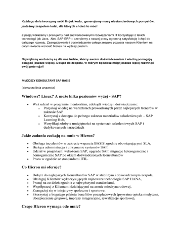 Każdego dnia tworzymy setki linijek kodu, generujemy masę niestandardowych pomysłów, jesteśmy zespołem ludzi, dla których chcieć to móc! Z pasją wdrażamy i pracujemy nad zaawansowanymi rozwiązaniami IT korzystając z takich technologii jak Java, .Net, SAP ERP – czerpiemy z naszej pracy ogromną satysfakcję i chęć do dalszego rozwoju. Zaangażowanie i doświadczenie całego zespołu pozwala naszym Klientom na całym świecie wznosić biznes na wyższy poziom. Największą wartością są dla nas ludzie, którzy swoim doświadczeniem i wiedzą pomagają osiągać jeszcze więcej. Dołącz do zespołu, w którym będziesz mógł jeszcze lepiej rozwinąć swój potencjał! MŁODSZY KONSULTANT SAP BASIS (pierwsza linia wsparcia) Windows? Linux? A może kilka poziomów wyżej - SAP? Weź udział w programie mentorskim, zdobądź wiedzę i doświadczenie: o Pozyskaj wiedzę na warsztatach prowadzanych przez najlepszych trenerów w zakresie SAP o Korzystaj z dostępu do pełnego zakresu materiałów szkoleniowych – SAP Learning Hub, o Weryfikuj zdobyte umiejętności na systemach szkoleniowych SAP i dedykowanych narzędziach Jakie zadania czekają na mnie w Hicron? Obsługa incydentów w zakresie wsparcia BASIS zgodnie obowiązującymi SLA, Bieżąca administracja i utrzymanie systemów SAP, Udział w projektach: wdrożenia SAP, upgrade SAP, migracje heterogeniczne i homogeniczne SAP po okiem doświadczonych Konsultantów Praca w zgodzie ze standardami ITIL. Co Hicron mi oferuje? Dołącz do najlepszych Konsultantów SAP w stabilnym i doświadczonym zespole, Obsługuj Klientów wykorzysujących najnowsze technologie SAP HANA, Pracuj na co dzień zgodnie z najwyższymi standardami, Współpracuj z Klientami działającymi na arenie międzynarodowej, Zaangażuj się w inicjatywy społeczne i sportowe, Skorzystaj z bogatego pakietu benefitów pozapłacowych (prywatna opieka medyczna, ubezpieczenie grupowe, imprezy integracyjne, rywalizacje sportowe), Czego Hicron wymaga ode mnie? Wykształcenie wyższe techniczne; Zdolność do szybkiego przyswajania wiedzy, Umiejętności rozwiązywania problemów, Samodzielności i zaangażowania w realizację powierzonych zadań, Dobrej znajomości języka angielskiego. Mile widziane: Znajomość języka niemieckiego, Doświadczenie w zakresie relacyjnych baz danych Wiedza z zakresu administracji systemami operacyjnymi Jeśli jesteś zainteresowany/a ofertą czekamy na Twoje CV pod adresem mailowy: [email protected] Informujemy, że skontaktujemy się tylko z wybranymi kandydatami. Prosimy o umieszczenie w dokumentach aplikacyjnych następującej klauzuli: Wyrażam zgodę na przetwarzanie moich danych osobowych przez HICRON Sp. z o.o. z siedzibą we Wrocławiu w ramach realizacji procesu rekrutacji (w szczególności wprowadzenie ich do bazy danych firmy) zgodnie z Ustawą z 29.08.1997 o Ochronie Danych Osobowych. Przyjmuję do wiadomości, że przysługuje mi prawo wglądu do moich danych oraz żądania ich poprawienia lub usunięcia.