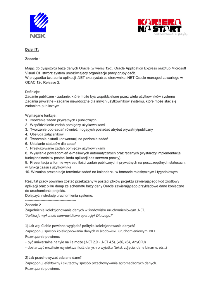 Dział IT: Zadanie 1 Mając do dyspozycji bazę danych Oracle (w wersji 12c), Oracle Application Express oraz/lub Microsoft Visual C#, stwórz system umożliwiający organizację pracy grupy osób. W przypadku tworzenia aplikacji .NET skorzystać ze sterownika .NET Oracle managed zawartego w ODAC 12c Release 2. Definicje: Zadanie publiczne - zadanie, które może być współdzielone przez wielu użytkowników systemu Zadania prywatne - zadanie niewidoczne dla innych użytkowników systemu, które może stać się zadaniem publicznym Wymagane funkcje: 1. Tworzenie zadań prywatnych i publicznych 2. Współdzielenie zadań pomiędzy użytkownikami 3. Tworzenie pod-zadań również mogących posiadać atrybut prywatny/publiczny 4. Obsługa załączników 5. Tworzenie historii konwersacji na poziomie zadań 6. Ustalanie statusów dla zadań 7. Przekazywanie zadań pomiędzy użytkownikami 8. Wysyłanie powiadomień e-mailowych automatycznych oraz ręcznych (wystarczy implementacja funkcjonalności w postaci kodu aplikacji bez serwera poczty) 9. Prezentacja w formie wykresu ilości zadań publicznych i prywatnych na poszczególnych statusach, w funkcji czasu i użytkownika 10. Wizualna prezentacja terminów zadań na kalendarzu w formacie miesięcznym i tygodniowym Rezultat pracy powinien zostać przekazany w postaci plików projektu zawierającego kod źródłowy aplikacji oraz pliku dump ze schematu bazy dany Oracle zawierającego przykładowe dane konieczne do uruchomienia projektu. Dołączyć instrukcję uruchomienia systemu. ------------------------------------------Zadanie 2 Zagadnienie kolekcjonowania danych w środowisku uruchomieniowym .NET. "Aplikacja wykonała nieprawidłową operację? Dlaczego?" 1) Jak wg. Ciebie powinna wyglądać polityka kolekcjonowania danych? Zaproponuj sposób kolekcjonowania danych w środowisku uruchomieniowym .NET Rozwiązanie powinno: - być uniwersalne na tyle na ile może (.NET 2.0 - .NET 4.5), (x86, x64, AnyCPU) - dostarczyć możliwie największą ilość danych o wyjątku (tekst, zdjęcia, dane binarne, etc...) 2) Jak przechowywać zebrane dane? Zaproponuj efektywny i skuteczny sposób przechowywania zgromadzonych danych. Rozwiązanie powinno: - umożliwić szybką diagnozę - być niezawodne (uzyskane dane nie mogą zostać utracone(!)) i redundantne (min.: 2 miejsca zapisu danych) Swoje wybory/decyzje uzasadnij. Wskaż możliwe dalsze kierunki rozwoju i udoskonalenia rozwiązania. Rezultatem powinien być plik projektu z aplikacją symulującą przykładowe wyjątki wraz z modułem kolekcjonującym dane. -----------------------------------------Zadanie 3 Proszę wymienić możliwie najwięcej powszechnie znanych technik walki ze spamem. Proszę opisać zasadę(algorytm) działania każdej z metod, przed jakiego typu atakiem chroni oraz jaką ma skuteczność. Podać przykłady rozwiązań rynkowych lub open-source implementujących poszczególne metody. -----------------------------------------Zadanie 4 Proszę opisać znane techniki przeprowadzania ataku DDoS. Opisać metody skutecznej obrony oraz ich skuteczność i potencjalne słabości. Podać przykłady rozwiązań rynkowych lub open-source implementujących poszczególne metody. --------------------------------------------Zadanie 5 Proszę opisać wady i słabe strony wirtualizacji serwerów oraz metody przeciwdziałania. -------------------------------------------Zadanie 6 Co rozumiesz przez termin big data. Podaj obszary zastosowania --------------------------------------------