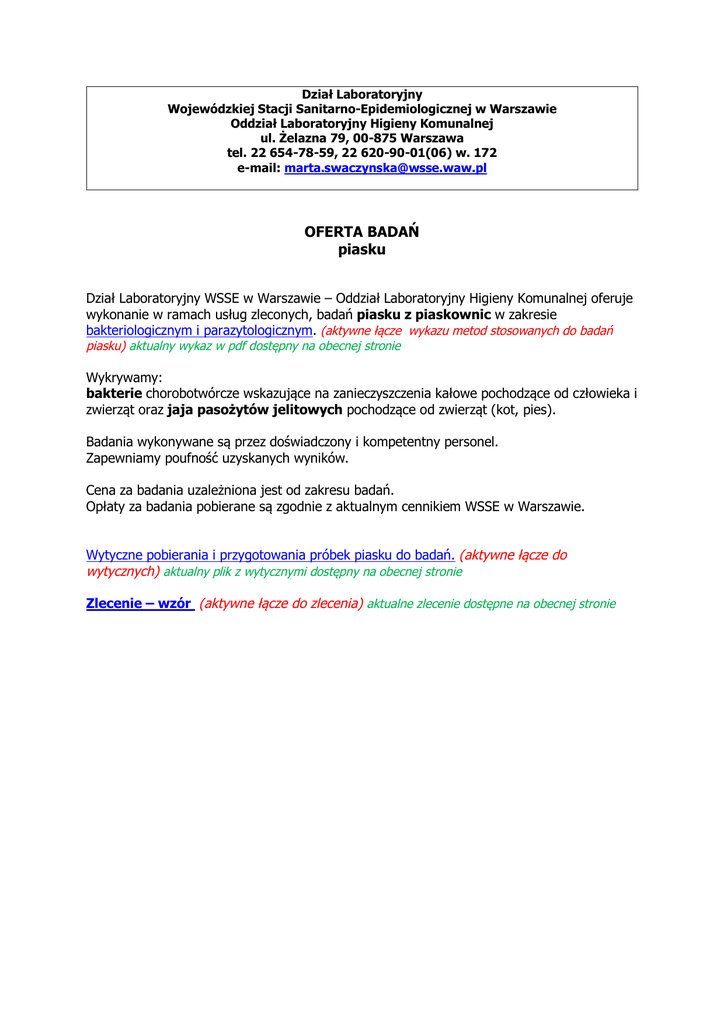 Dział Laboratoryjny Wojewódzkiej Stacji Sanitarno-Epidemiologicznej w Warszawie Oddział Laboratoryjny Higieny Komunalnej ul. Żelazna 79, 00-875 Warszawa tel. 22 654-78-59, 22 620-90-01(06) w. 172 e-mail: [email protected] OFERTA BADAŃ piasku Dział Laboratoryjny WSSE w Warszawie – Oddział Laboratoryjny Higieny Komunalnej oferuje wykonanie w ramach usług zleconych, badań piasku z piaskownic w zakresie bakteriologicznym i parazytologicznym. (aktywne łącze wykazu metod stosowanych do badań piasku) aktualny wykaz w pdf dostępny na obecnej stronie Wykrywamy: bakterie chorobotwórcze wskazujące na zanieczyszczenia kałowe pochodzące od człowieka i zwierząt oraz jaja pasożytów jelitowych pochodzące od zwierząt (kot, pies). Badania wykonywane są przez doświadczony i kompetentny personel. Zapewniamy poufność uzyskanych wyników. Cena za badania uzależniona jest od zakresu badań. Opłaty za badania pobierane są zgodnie z aktualnym cennikiem WSSE w Warszawie. Wytyczne pobierania i przygotowania próbek piasku do badań. (aktywne łącze do wytycznych) aktualny plik z wytycznymi dostępny na obecnej stronie Zlecenie – wzór (aktywne łącze do zlecenia) aktualne zlecenie dostępne na obecnej stronie