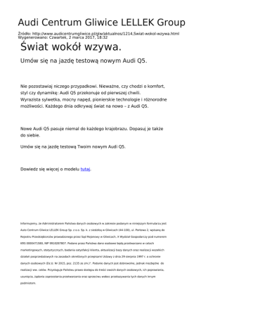 Audi Centrum Gliwice LELLEK Group Źródło: http://www.audicentrumgliwice.pl/glw/aktualnos/1214,Swiat-wokol-wzywa.html Wygenerowano: Czwartek, 2 marca 2017, 18:32 Świat wokół wzywa. Umów się na jazdę testową nowym Audi Q5. Nie pozostawiaj niczego przypadkowi. Nieważne, czy chodzi o komfort, styl czy dynamikę: Audi Q5 przekonuje od pierwszej chwili. Wyrazista sylwetka, mocny napęd, pionierskie technologie i różnorodne możliwości. Każdego dnia odkrywaj świat na nowo – z Audi Q5. Nowe Audi Q5 pasuje niemal do każdego krajobrazu. Dopasuj je także do siebie. Umów się na jazdę testową Twoim nowym Audi Q5. Dowiedz się więcej o modelu tutaj. Informujemy, że Administratorem Państwa danych osobowych w zakresie podanym w niniejszym formularzu jest Auto Centrum Gliwice LELLEK Group Sp. z o.o. Sp. k. z siedzibą w Gliwicach (44-100), ul. Portowa 2, wpisaną do Rejestru Przedsiębiorców prowadzonego przez Sąd Rejonowy w Gliwicach, X Wydział Gospodarczy pod numerem KRS 0000471580, NIP 9910287807. Podane przez Państwa dane osobowe będą przetwarzane w celach marketingowych, statystycznych, badania satysfakcji klienta, aktualizacji bazy danych oraz realizacji wszelkich działań posprzedażowych na zasadach określonych przepisami Ustawy z dnia 29 sierpnia 1997 r. o ochronie danych osobowych (Dz.U. Nr 2015, poz. 2135 ze zm.)". Podanie danych jest dobrowolne, jednak niezbędne do realizacji ww. celów. Przysługuje Państwu prawo dostępu do treści swoich danych osobowych, ich poprawiania, usunięcia, żądania zaprzestania przetwarzania oraz sprzeciwu wobec przekazywania tych danych innym podmiotom. Umów się na jazdę testową Twoim nowym Audi Q5 Umów się na jazdę testową Twoim nowym Audi Q5 Imię i nazwisko pole wymagane * Email Telefon pole wymagane * Zgoda na przetwarzanie danych osobowych pole wymagane Wyrażam zgodę na przetwarzanie moich danych osobowych w powyższych celach przez Auto Centrum Gliwice LELLEK Group Sp. z o.o. Sp. k. oraz ich udostępnienie Volkswagen Group Polska Sp. z o.o. z siedzibą w Poznaniu (61-037), ul. Krańcowa 44 i innym podmiotom świadczącym usługi powiązane z działalnością Administratora, w tym firmom ubezpieczeniowym, leasingowym i świadczącym usługi kredytowe oraz podmiotom powiązanym kapitałowo z Administratorem. Wyrażam zgodę na otrzymywanie informacji handlowych od Volkswagen Group Polska sp. z o.o. i Auto Centrum Gliwice LELLEK Group Sp. z o.o. Sp. k. za pośrednictwem środków komunikacji elektronicznej (kanał e-mail, SMS, MMS) zgodnie z Ustawą dnia 18 lipca 2002 r. o świadczeniu usług drogą elektroniczną (Dz. U. z 2002 r. Nr 144, poz. 1204 z późn. zm.) i poczty tradycyjnej oraz udostępnienie moich danych osobowych innym podmiotom współpracującym dla celów marketingu i komunikacji elektronicznej. * Zabezpieczenie formularza pole wymagane * Wyślij