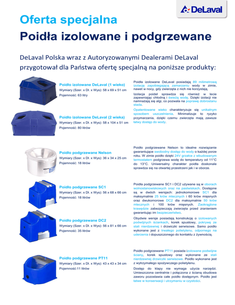 Oferta specjalna Poidła izolowane i podgrzewane DeLaval Polska wraz z Autoryzowanymi Dealerami DeLaval przygotował dla Paostwa ofertę specjalną na poniższe produkty: Poidło izolowane DeLaval (1 wieko) Wymiary (Szer. x Dł. x Wys): 58 x 69 x 51 cm Pojemność: 63 litry Poidło izolowane DeLaval (2 wieka) Wymiary (Szer. x Dł. x Wys): 58 x 104 x 51 cm Poidła izolowane DeLaval posiadają 89 milimetrową izolację zapobiegającą zamarzaniu wody w zimie, nawet w nocy, gdy zwierzęta z nich nie korzystają. Izolacja poideł sprawdza się również w lecie zapewniając chłodną i świeżą wodę. Dzięki izolacji nie namnażają się algi, co pozwala na poprawę dobrostanu stada. Opatentowane wieko charakteryzuje się unikalnym sposobem uszczelnienia. Minimalizuje to ryzyko przymarzania, dzięki czemu zwierzęta mają zawsze łatwy dostęp do wody. Pojemność: 80 litrów Poidło podgrzewane Nelson Wymiary (Szer. x Dł. x Wys): 36 x 34 x 25 cm Pojemność: 18 litrów Poidło podgrzewane SC1 Wymiary (Szer. x Dł. x Wys): 56 x 68 x 66 cm Pojemność: 18 litrów Poidło podgrzewane DC2 Wymiary (Szer. x Dł. x Wys): 56 x 81 x 66 cm Pojemność: 35 litrów Poidło podgrzewane PT11 Wymiary (Szer. x Dł. x Wys): 43 x 43 x 34 cm Pojemność:11 litrów Poidło podgrzewane Nelson to idealne rozwiązanie gwarantujące swobodny dostęp do wody o każdej porze roku. W zimie poidło dzięki 24V grzałce z wbudowanym termostatem podgrzewa wodę do temperatury od 11°C do 13°C. Uniwersalny charakter poidła doskonale sprawdza się na otwartej przestrzeni jak i w oborze. Poidła podgrzewane SC1 i DC2 używane są w oborach wolnostanowiskowych oraz na pastwiskach. Dostępne są w dwóch wersjach: jednokomorowe SC1 dla maksymalnie 25 krów mlecznych i 60 krów mięsnych oraz dwukomorowe DC2 dla maksymalnie 50 krów mlecznych i 100 krów mięsnych. Zaokrąglone krawędzie zabezpieczają zwierzęta przed zranieniem gwarantując im bezpieczeństwo. Obydwie wersje posiadają konstrukcję o izolowanych podwójnych ściankach, korek spustowy, pokrywę ze stali nierdzewnej i drzwiczki serwisowe. Samo poidło wykonane jest z trwałego polietylenu, odpornego na uderzenia i dopuszczonego do kontaktu z żywnością. Poidło podgrzewane PT11 posiada izolowane podwójne ściany, korek spustowy oraz wykonane ze stali nierdzewnej drzwiczki serwisowe. Poidło wykonane jest z wytrzymałego spożywczego polietylenu. Dostęp do klapy nie wymaga użycia narzędzi. Umieszczona centralnie i połączona z ścianą obudowa zaworu pozostawia całe poidło dostępnym. Poidło jest łatwe w konserwacji i utrzymaniu w czystości. Oferta specjalna Poidła izolowane i podgrzewane Poidło WT7 Wymiary (Szer. x Dł. x Wys): 60 x 213 x 61 cm Pojemność:132 litry Poidło WT10 Wymiary (Szer. x Dł. x Wys): 60 x 292 x 61 cm Pojemność:225 litrów Poidło WT12 Wymiary (Szer. x Dł. x Wys): 60 x 366 x 61 cm Pojemność:265 litrów Poidła serii WT są przyjazne dla krów gdyż posiadają zaokrąglone brzegi. Pływak oraz zawór są tak umiejscowione, aby krowa miała łatwy dostęp do wody. Priorytetem w konstrukcji poideł jest łatwość w czyszczeniu i konserwacji – najmniejsze poidło opróżnia się w 20 sekund, największe w 40 sekund. Zaokrąglone brzegi zapobiegają odkładaniu się wszelkiego rodzaju zanieczyszczeń. Wykonane ze stali nierdzewnej właz i otwór serwisowy ułatwiają regularną konserwację. Poidła wykonane są z spożywczego polietylenu, który jest odporny na uderzenia i nadaje się do recyklingu. Podgrzewacz zanurzeniowy może być zamontowany jako opcja co gwarantuje bezproblemowe użytkowanie w zimie. Zapraszamy Paostwa do kontaktu z najbliższym Autoryzowanym Dealerem DeLaval.