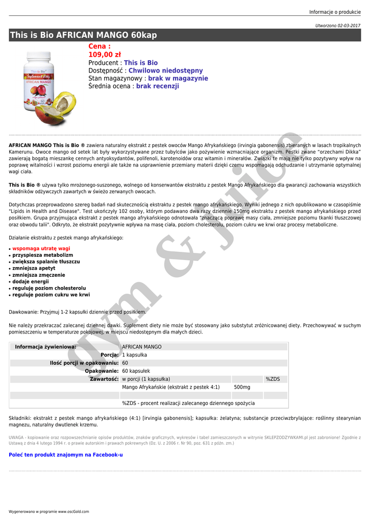 Informacje o produkcie Utworzono 02-03-2017 This is Bio AFRICAN MANGO 60kap Cena : 109,00 zł Producent : This is Bio Dostępność : Chwilowo niedostępny Stan magazynowy : brak w magazynie Średnia ocena : brak recenzji ju ic e AFRICAN MANGO This is Bio ® zawiera naturalny ekstrakt z pestek owoców Mango Afrykańskiego (irvingia gabonensis) zbieranych w lasach tropikalnych Kamerunu. Owoce mango od setek lat były wykorzystywane przez tubylców jako pożywienie wzmacniające organizm. Pestki zwane “orzechami Dikka” zawierają bogatą mieszankę cennych antyoksydantów, polifenoli, karotenoidów oraz witamin i minerałów. Związki te mają nie tylko pozytywny wpływ na poprawę witalności i wzrost poziomu energii ale także na usprawnienie przemiany materii dzięki czemu wspomagają odchudzanie i utrzymanie optymalnej wagi ciała. This is Bio ® używa tylko mrożonego-suszonego, wolnego od konserwantów ekstraktu z pestek Mango Afrykańskiego dla gwarancji zachowania wszystkich składników odżywczych zawartych w świeżo zerwanych owocach. Dotychczas przeprowadzono szereg badań nad skutecznością ekstraktu z pestek mango afrykańskiego. Wyniki jednego z nich opublikowano w czasopiśmie "Lipids in Health and Disease". Test ukończyły 102 osoby, którym podawano dwa razy dziennie 150mg ekstraktu z pestek mango afrykańskiego przed posiłkiem. Grupa przyjmująca ekstrakt z pestek mango afrykańskiego odnotowała "znaczącą poprawę masy ciała, zmniejsze poziomu tkanki tłuszczowej oraz obwodu talii". Odkryto, że ekstrakt pozytywnie wpływa na masę ciała, poziom cholesterolu, poziom cukru we krwi oraz procesy metaboliczne. Działanie ekstraktu z pestek mango afrykańskiego: ● ● ● ● ● ● wspomaga utratę wagi przyspiesza metabolizm zwiększa spalanie tłuszczu zmniejsza apetyt zmniejsza zmęczenie dodaje energii reguluję poziom cholesterolu reguluje poziom cukru we krwi & ● m ● Dawkowanie: Przyjmuj 1-2 kapsułki dziennie przed posiłkiem. gy Nie należy przekraczać zalecanej dziennej dawki. Suplement diety nie może być stosowany jako substytut zróżnicowanej diety. Przechowywać w suchym pomieszczeniu w temperaturze pokojowej, w miejscu niedostępnym dla małych dzieci. Informacja żywieniowa: AFRICAN MANGO Porcja: 1 kapsułka Ilość porcji w opakowaniu: 60 Opakowanie: 60 kapsułek Zawartość: w porcji (1 kapsułka) Mango Afrykańskie (ekstrakt z pestek 4:1) %ZDS 500mg %ZDS - procent realizacji zalecanego dziennego spożycia Składniki: ekstrakt z pestek mango afrykańskiego (4:1) [irvingia gabonensis]; kapsułka: żelatyna; substancje przeciwzbrylające: roślinny stearynian magnezu, naturalny dwutlenek krzemu. UWAGA - kopiowanie oraz rozpowszechnianie opisów produktów, znaków graficznych, wykresów i tabel zamieszczonych w witrynie SKLEPZODZYWKAMI.pl jest zabronione! Zgodnie z Ustawą z dnia 4 lutego 1994 r. o prawie autorskim i prawach pokrewnych (Dz. U. z 2006 r. Nr 90, poz. 631 z późn. zm.) Poleć ten produkt znajomym na Facebook-u Wygenerowano w programie www.oscGold.com