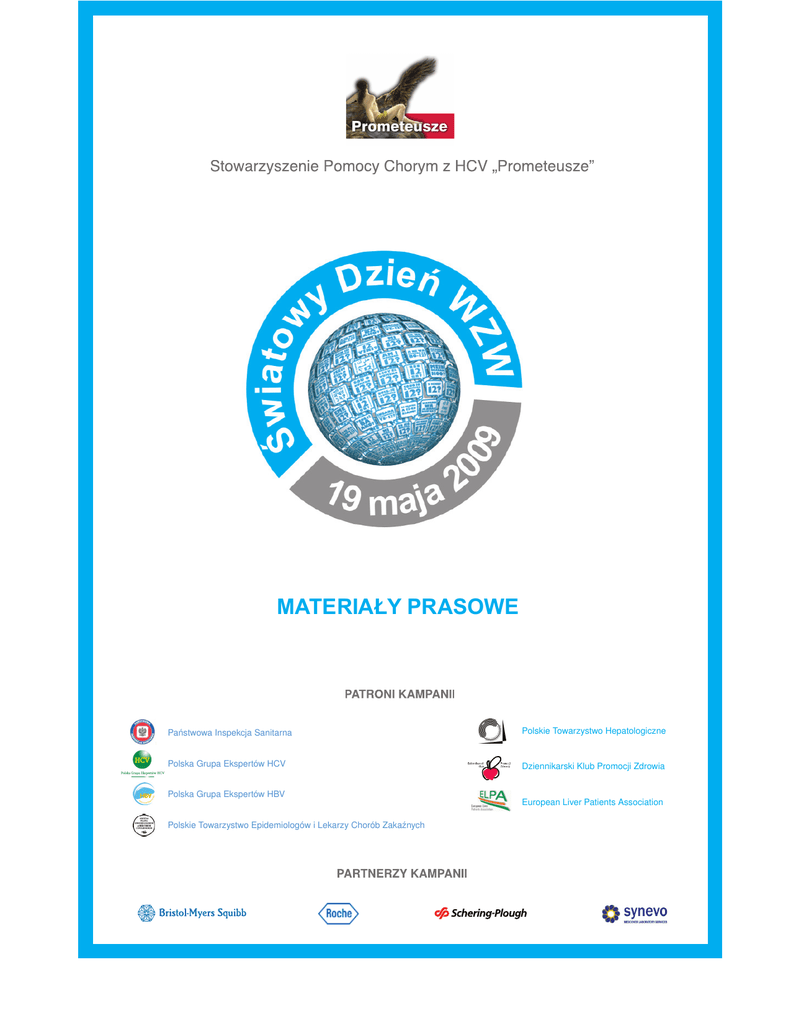 MATERIAŁY PRASOWE Państwowa Inspekcja Sanitarna Polskie Towarzystwo Hepatologiczne Polska Grupa Ekspertów HCV Dziennikarski Klub Promocji Zdrowia Polska Grupa Ekspertów HBV Polskie Towarzystwo Epidemiologów i Lekarzy Chorób Zakaźnych European Liver Patients Association KOMUNIKAT PRASOWY Warszawa, 19 maja 2009 r. Komunikat Prasowy 19 maja – Światowy Dzień Wirusowego Zapalenia Wątroby „HCV i HBV – zmniejsz ryzyko zakażenia, zadbaj o swoich najbliższych” 19 maja obchodzony jest Światowy Dzień Wirusowego Zapalenia Wątroby. Inicjatorami obchodów są organizacje pozarządowe, których celem jest popularyzowanie profilaktyki i informacji na temat wirusowych zapaleń wątroby. W Polsce obchody Światowego Dnia Wirusowego Zapalenia Wątroby zainaugurowało Stowarzyszenie Pomocy Chorym z HCV „Prometeusze”, mając na celu zwiększenie świadomości społeczeństwa oraz zaangażowania polityków w walkę z przewlekłym zapaleniem wątroby typu C i B, jak to ma miejsce w przypadku HIV/AIDS, malarii czy gruźlicy. Jak wynika z raportu World Hepatitis Alliance (WHA)1, aż 500 mln ludzi na świecie (co 12 mieszkaniec naszego globu) choruje na wirusowe zapalenie wątroby typu C, bądź B, a większość z nich nie ma świadomości swojego zakażenia. Rocznie wirusy HCV i HBV zabijają ok. 1,5 miliona ludzi. Wirusy zapalenia wątroby: typu C (HCV) oraz typu B (HBV), wywołują u człowieka zapalenie wątroby, które może przebiegać w postaci ostrego lub przewlekłego procesu zapalnego. Nieleczone WZW C oraz WZW B może prowadzić do marskości, niewydolności i raka wątroby, a w rezultacie – do śmierci. W przypadku wirusowego zapalenia wątroby typu C dostępne obecnie metody terapeutyczne umożliwiają wyleczenie zakażenia u ponad 50% chorych. Standardowym leczeniem WZW typu C jest terapia skojarzona z zastosowaniem pegylowanego interferonu alfa 2A lub 2B i rybawiryny. Skuteczność terapii zależy od stopnia zaawansowania choroby oraz genotypu wirusa. Gorzej odpowiadają na terapię pacjenci zakażeni genotypem 1 wirusa HCV, który jest najczęściej spotykanym w populacji genotypem. Na wirusa HCV jak dotąd nie wynaleziono szczepionki. Niezwykle istotna jest więc edukacja społeczna na temat dróg rozprzestrzeniania się wirusa i sposobów unikania zakażenia oraz badania przesiewowe anty-HCV. Wirusowe zapalenie wątroby typu B jest chorobą nieuleczalną, niemniej jednak zakażenia można uniknąć, bowiem istnieje skuteczna szczepionka przeciwko wirusowi HBV. Wdrożony w Polsce, w latach 1989-1996, program obowiązkowych szczepień noworodków oraz obowiązkowe szczepienia w grupach ryzyka pozwoliły zapanować nad rozprzestrzenianiem się wirusa HBV w Polsce i znacznie ograniczyć ilość nowych zakażeń. W latach 1979-1985 notowano średnio 15 785 nowych przypadków WZW typu B rocznie. Od 6 lat liczba zarejestrowanych przypadków jest mniejsza aniżeli 2000 rocznie. 1 www.aminumber12.org KOMUNIKAT PRASOWY Obecnie w Polsce dostępne są leki skutecznie działające na wirusa B, przy czym jeden z nich (interferon) jednocześnie wzmacnia układ odpornościowy zakażonego. Pozostałe leki podawane doustnie powodują działanie bezpośrednio antywirusowe. W terapii chorych obowiązuje zasada: im bardziej zostanie stłumione namnażanie się wirusa (wiremia), tym bardziej i gwałtownie maleje prawdopodobieństwo rozwoju niekorzystnych zmian w wątrobie, takich jak jej marskość i rak wątrobowo-komórkowy. Nie wszyscy zakażeni WZW B wymagają stosowania leków. Jednak zadecydować o tym może wyłącznie lekarz. W Polsce – wg danych Polskiej Grupy Ekspertów HCV – szacunkowa liczba zakażonych wirusem HCV może wynosić nawet 730 tys. osób, z czego ok. 95% nie jest świadomych swojej choroby. Zakażenie wirusem HCV jest bardzo często określane jako „cicha epidemia” za względu na wieloletni bezobjawowy przebieg. Zwykle choroba rozpoznawana jest przypadkowo, często po wielu latach trwania zakażenia. Pacjent, u którego test anty-HCV jest dodatni, musi być koniecznie skierowany do poradni chorób wątroby na dodatkowe badania. Wirus zapalenia wątroby typu C został zaliczony do karcynogenów klasy I. Wirusowe zapalenie wątroby typu B jest jedną z najczęściej występujących chorób zakaźnych – szacuje się, że kontakt z wirusem miało 2 mld osób na świecie (1/3 populacji). W Polsce – według szacunków Polskiej Grupy Ekspertów HBV – liczba zakażonych wynosi ok. 400–600 tys. osób. Wirus HBV jest 100 razy bardziej zakaźny niż wirus HIV i jest drugim co do częstości, po tytoniu, pojedynczym czynnikiem wywołującym raka. Podobnie jak w przypadku HCV, zakażenie wirusem HBV nie daje objawów charakterystycznych i najczęściej jest wykrywane przypadkowo. Niemniej, zakażeniom wirusem B bardzo skutecznie zapobiega się poprzez szczepienia. Głównym źródłem zakażeń zarówno wirusem HCV jak i HBV są zakażenia szpitalne (ok. 80%). Do zakażenia wirusem HCV dochodzi podczas kontaktu z krwią i jej pochodnymi. Zakażeniem grożą procedury medyczne dokonywane źle wysterylizowanym sprzętem. Ryzyko zakażenia występuje również w trakcie wykonywania zabiegów kosmetycznych i upiększających, takich jak: zabiegi tatuażu, przekłuwanie uszu i innych części ciała, zabiegi kosmetyczne oraz podczas wstrzykiwania narkotyków dożylnych. Zakażenie wirusem zapalenia wątroby typu C może wystąpić również na drodze kontaktów seksualnych, jednak zakażenia te są rzadkie, określa się je na około 2% przypadków. Drogi zakażenia wirusem HBV są podobne. Poza zakażeniami krwiopochodnymi wirusem typu B można zakazić się poprzez wszystkie wydzieliny organizmu tj. ślinę, spermę, śluz szyjkowy. Wśród młodych osób w przedziale wiekowym 18-25 lat do zakażenia bardzo często dochodzi poprzez niezabezpieczone kontakty seksualne, dożylne przyjmowanie narkotyków (wśród wszystkich zakażonych 40% stanowią narkomani). Wiru