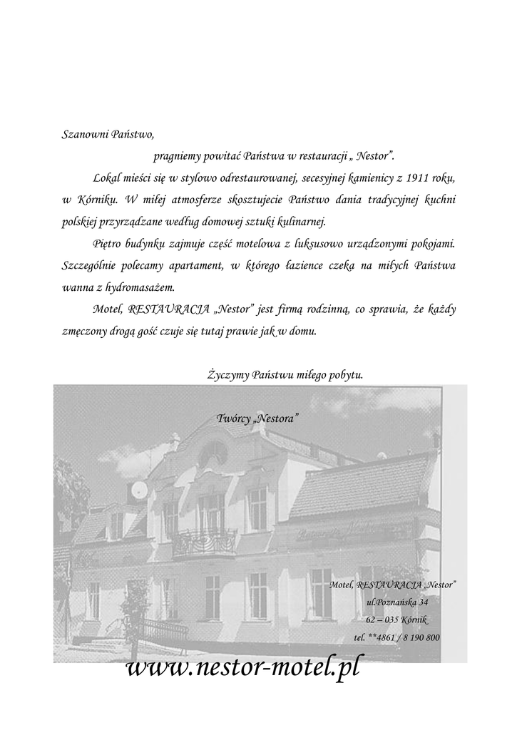 Szanowni Państwo, pragniemy powitać Państwa w restauracji „ Nestor”. Lokal mieści się w stylowo odrestaurowanej, secesyjnej kamienicy z 1911 roku, w Kórniku. W miłej atmosferze skosztujecie Państwo dania tradycyjnej kuchni polskiej przyrządzane według domowej sztuki kulinarnej. Piętro budynku zajmuje część motelowa z luksusowo urządzonymi pokojami. Szczególnie polecamy apartament, w którego łazience czeka na miłych Państwa wanna z hydromasażem. Motel, RESTAURACJA „Nestor” jest firmą rodzinną, co sprawia, że każdy zmęczony drogą gość czuje się tutaj prawie jak w domu. Życzymy Państwu miłego pobytu. Twórcy „Nestora” Motel, RESTAURACJA „Nestor” ul.Poznańska 34 62 – 035 Kórnik tel. **4861 / 8 190 800 www.nestor-motel.pl Zakąski zimne Owoc melonu pod szynką parmeńską 28 zł. Tatar ze świeżego łososia z kaparami i sosem vinegret 30 zł. Carpaccio z polędwicy wołowej, z serem pleśniowym, podane z ciepłymi grzaneczkami 30zł. Tradycyjny Befsztyk Tatarski z polędwicy wołowej 30 zł. & Zakąski ciepłe Wątróbka drobiowa z jabłkami, pieczarkami i zasmażaną cebulką 19 zł. Pieczarki z patelni 12 zł. Gzik wielkopolski z gorącymi pyrami i koperkiem 16 zł. Duszone w białym winie krewetki królewskie podane z małą sałatką grecką 32 zł. & Pierogarnia Pierogi ruskie okraszone skwareczkami i cebulką 18 zł. Pierogi z mięsem podane z kapustą zasmażaną 19 zł. Pyszne pierogi nadziewane szpinakiem i greckim serem feta, oprószone świeżo tartym parmezanem 25 zł. & Zupy Barszcz czysty 8 zł. Kołduny wileńskie w rosole 12 zł. Kołduny wileńskie w barszczu 12 zł. Żurek staropolski z chlebem 10 zł. Tradycyjny rosół z „własnoróbnym” makaronem 12 zł. Krem ze świeżych pomidorów z gęstą śmietaną i bazylią 12 zł. Krem brokułowy z zarumienionymi płatkami migdałowymi 12zł. Krem borowikowy z chrupiącymi grzaneczkami, z razowego chleba 15 zł. & Dania z drobiu Kotlet de Volaille z kurczaka 30 zł. ( marchewka z groszkiem, fasolka szparagowa, mała sałatka grecka, frytki ) Boeuf Stroganow z indyka, z kluskami kładzionymi 32 zł. ( buraczki, fasolka szparagowa, mała sałatka grecka ) Panierowany filet z kurczaka podany z jajkiem sadzonym 34 zł. ( mała sałatka grecka, fasolka szparagowa, mizeria, ziemniaki ) Nasza specjalność Kaczka pieczona z jabłkami, podana z modrą kapustą i pyzami 52 zł. & Dania z wieprzowiny Golonka próżona w jarzynach po bawarsku z kapustą zasmażaną – 100 g/5 zł. ( marchewka z groszkiem, ziemniaki ) Dodatki 12 zł. Polędwiczki wieprzowe z brzoskwinią 34 zł. ( fasolka szparagowa, mizeria, mała sałatka grecka, frytki ) Tradycyjny kotlet schabowy z pieczarkami 32 zł. ( marchewka z groszkiem, fasolka, mała sałatka grecka, ziemniaki ) Pieczeń wieprzowa z pyzami 32 zł. ( fasolka szparagowa, mała sałatka grecka, mizeria ) Polędwiczki wieprzowe w sosie kurkowym 38 zł. ( fasolka szparagowa, mizeria, mała sałatka grecka, ziemniaki ) & Dania z wołowiny Rolada wołowa w sosie z suszonych grzybów 36 zł. ( fasolka szparagowa, buraczki, mała sałatka grecka, pyzy ) Polędwica wołowa na grzance 49 zł. ( fasolka szparagowa, buraczki, mała sałatka grecka, frytki ) Polędwica wołowa w sosie z zielonego pieprzu 54 zł. ( fasolka szparagowa, buraczki, mała sałatka grecka, ziemniaki ) Polędwica wołowa podana w sosie z borowików 60 zł. ( fasolka szparagowa, buraczki, mała sałatka grecka, ziemniaki ) & Dania z cielęciny Pyszna pieczeń cielęca nadziewana szpinakiem, polana sosem śmietanowym z ziemniakami i warzywami 46 zł. Nasza specjalność Delikatnie próżona gicz cielęca podana z ziemniakami, mizerią, fasolką szparagową i małą sałatką grecką - 100 g/10 zł. Dodatki / 12 zł. & Dania rybne Pstrąg smażony na maśle z cytryną 35 zł. ( mizeria, fasolka szparagowa, mała sałatka grecka, ziemniaki ) Filet z sandacza 44 zł. ( mizeria, fasolka szparagowa, mała sałatka grecka, sosik pieprzowo-chrzanowy, ziemniaki ) Filet z łososia 42 zł. ( mizeria, fasolka szparagowa, mała sałatka grecka, sosik pieprzowo-chrzanowy, ziemniaki ) & Sałaty Sałatka grecka z serem feta 28 zł. Wykwintna sałatka z szynką parmeńską i awocado 35 zł. Pyszna sałatka z łososiem grillowanym, kaparami i ananasem 35 zł. Kurczak grillowany podany na sałacie lodowej z dodatkiem świeżych pomidorów 32 zł. Grillowana polędwica wołowa podana na sałacie lodowej, z cieplutkimi grzankami i odrobiną masła czosnkowego 46 zł. & Dania nie tylko dla dzieci Sznycelek z kurczaka z jajkiem sadzonym, z frytkami i gotowanymi warzywami 15 zł. Panierowany filecik z sandacza, z frytkami i gotowanymi warzywami 20 zł. „Własnoróbny” makaron z sosem, ze świeżych pomidorów, oprószony żółtym serem 18 zł. & Desery Szarlotka na ciepło z kulką lodów waniliowych, bitą śmietaną, całość polana sosem czekoladowym 15 zł. Sałatka owocowa 14 zł. Deser lodowy 15 zł. Lody czekoladowe z orzechami, bitą śmietaną i Advocatem 17 zł. Lody waniliowe podane z gorącymi malinami 15 zł. Lody waniliowe z gorącym owocem wiśni i odrobiną likieru Amaretto 15 zł. Sernik z pyszną, karmelizowaną brzoskwinią i bitą śmietaną 17 zł. Sernik z bitą śmietaną 15 zł. Sernik z gorącym owocem wiśni i likierem migdałowym 17 zł. & Naleśniki… Naleśnik podany ze świeżym musem jabłkowym, posypany cukrem cynamonowym 15 zł. Naleśnik z serem 17 zł. Naleśnik z brzoskwinią, bitą śmietaną i sosem czekoladowym 15 zł. Jabłko w cieście naleśnikowym z lodami waniliowymi i bitą śmietaną 17 zł. & Desery lodowe dla dzieci…. Pszczółka Maja 10 zł. Pinokio 10 zł. Statek Piratów 10 zł. Alkohole Aperitif Campari 50 ml 10 zł. 50 ml 10 zł. Gin Gin Gordon’s Gin Bombay Sapphire 50 ml 15 zł. Wódki Wódka Bols 50 ml 6 zł. Wódka Smirnoff 50 ml 6 zł. Wódka Wyborowa 50 ml 6 zł. Wódka Luksusowa 50 ml 5 zł Wódka Maximus 50 ml 7 zł. Wódka Absolut 