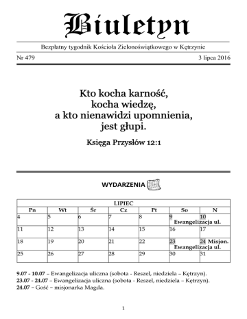 Biuletyn Bezpłatny tygodnik Kościoła Zielonoświątkowego w Kętrzynie Nr 479 3 lipca 2016 WYDARZENIA Pn Wt LIPIEC Cz Śr Pt 4 5 6 7 8 11 12 13 14 15 18 19 20 21 22 25 26 27 28 29 So 9 10 Ewangelizacja ul. 16 17 23 24 Misjon. Ewangelizacja ul. 30 31 9.07 - 10.07 – Ewangelizacja uliczna (sobota - Reszel, niedziela – Kętrzyn). 23.07 - 24.07 – Ewangelizacja uliczna (sobota - Reszel, niedziela – Kętrzyn). 24.07 – Gość – misjonarka Magda. 1 N Kazanie wygłosi: Arkadiusz Jurgiełajtis LISTA MODLITEWNA wyzdrowiałeś; już nigdy nie grzesz, aby ci się coś gorszego nie stało”. (Jana 5:14) * o zbawienie: Andrzeja D. (męża Ani). Danuty K. Tadeusza W. Lilli R. (żony Mirka) męża Bogumiły Panfil. rodziców Darka Biłdy. taty i brata Moniki Czerwonki. Justyny J. (żony Marcina Dominika). URODZINY W tym tygodniu urodziny obchodzi: 9.07. Marysia Jakowicz Życzymy Bożych błogosławieństw! * o zdrowie: Danuty K. Patrycji i Magdy Owierczuk. Debory Marczuk. Marianny i Jerzego Zakrzewskich. Alfredy Kopaczel. Bogumiły Panfil. *** Dziś (3 lipca) przypada kolejna rocznica chrztu Lucyny Tęczy. Życzymy błogosławieństw Bożych! ROZWAŻANIE * o uzdrowienie i wzrost duchowy Rafała (bratanka Lucyny Tęczy.); Marchew, jajko czy ziarna kawy? * o błogosławieństwa, Boże prowadzenie dla Władysława i Krystyny Plewińskich, będących na misji za granicą. W jednym z przeczytanych niedawno artykułów uderzył mnie pewien cytat: W czekaniu nie chodzi o to, co otrzymam na końcu, ale oto, kim staję się, gdy czekam. Rzeczywiście, patrząc z perspektywy czasu, okres oczekiwania może okazać się albo ogromnym błogosławieństwem, albo czasem zmarnowanym, albo – co najgorsze – początkiem zbaczania z właściwej drogi lub nawet całkowitego odwrócenia się od celu, do którego zmierzaliśmy. REFLEKSJE Wyzdrowienie bez zaprzestania czynienia tego, co grzeszne, może sprowadzić na nas więcej nieszczęść niż sama choroba. Słowa Jezusa skierowane do właśnie uzdrowionego człowieka pozostają wciąż aktualnym ostrzeżeniem: „Oto 2 Każdy z nas zmaga się z różnymi przeciwnościami. Jako chrześcijanie przynosimy nasze troski i problemy w modlitwach naszemu niebiańskiemu Ojcu i powierzamy Mu nasze prośby (Flp 4:6). Jednak często odpowiedź – np. rozwiązanie problemu lub otrzymanie konkretnego błogosławieństwa – nie nadchodzi szybko. Czekamy, modlimy się, a dalej nic się nie dzieje. Czasami przedłużający się okres doświadczeń i cierpienia eksploatuje zupełnie nasze siły, a pomimo zanoszonych modlitw, nie odczuwamy upragnionej ulgi. Bardzo często wkraczają wtedy na scenę zniecierpliwienie, żal, rozczarowanie, złość czy zwątpienie. To właśnie w tych momentach przedłużającego się oczekiwania i niebiańskiej ciszy najprędzej jesteśmy skłonni poddawać w wątpliwość Bożą miłość do nas i Jego „myśli o pokoju, a nie o niedoli” (Jer 29:11), które On ma względem swoich dzieci. Niebezpiecznie łatwo wtedy, zamiast mocno trzymać się obietnic Słowa Bożego mówiących nam o Bożej wierności i dobroci, zacząć użalać się nad sobą lub zatwardzać serce w poczuciu krzywdy. przemieniając bezbarwną wodę w pyszny, aromatyczny napój o intensywnym kolorze. Apostoł Paweł napisał w liście do Koryntian, że mamy być wonnością Chrystusową (2 Kor 2:15). Tak samo więc my możemy swoją postawą pełną ufności i uwielbienia przemienić bolesny czas oczekiwania w zachwycającą wonność dla Bożej chwały. Niestety, nie zawsze wygląda to w ten sposób. Znane są historie ludzi, którzy pod wpływem trudności i doświadczeń całkowicie załamali się albo wręcz przeciwnie, zatwardzili swoje serca i odwrócili się od Boga. Nigdzie w Biblii nie mamy obietnicy, że zawsze będziemy wiedzieli, dlaczego musimy przechodzić przez taką akurat sytuację. Jednak apostoł Piotr napisał: Weselcie się z tego, mimo że teraz na krótko, gdy trzeba, zasmuceni bywacie różnorodnymi doświadczeniami, ażeby wypróbowana wiara wasza okazała się cenniejsza niż znikome złoto, w ogniu wypróbowane, ku chwale i czci, i sławie, gdy się objawi Jezus Chrystus (1 Ptr 1:6-7). Pomimo więc tego, że nie zawsze rozumiemy otaczające nas okoliczności, możemy mieć pewność, że suwerenny Bóg nawet w nich współdziała ku dobremu i być może właśnie poprzez te trudne doświadczenia hartuje naszą wiarę i charakter, abyśmy mogli osiągnąć cel wiary – zbawienie duszy. Apostoł Piotr zachęcał do tego, abyśmy pomimo zasmucających nas prób skierowali swój wzrok na to, co ma nastąpić, czyli na objawienie się Jezusa Chrystusa oraz chwałę, cześć i sławę, których dostąpimy wraz z Nim. Możemy położyć Marchew, jajko czy ziarna kawy? Przeczytałam kiedyś pewną anegdotę, która mocno zapadła mi w pamięć. Na trudności można reagować w trojaki sposób: jak marchew, jak jajko lub jak ziarna kawy. Marchewka pod wpływem wrzątku mięknie i rozpada się. Jajko zaś twardnieje. Natomiast ziarna kawy pod wpływem wrzątku uwalniają wspaniały zapach i smak, 3 swoją ufność w Zbawicielu, który obiecał, że przygotuje dla nas miejsce tam, gdzie nie będzie już śmierci, bólu i łez, za to odnajdziemy rozkosz w Jego obecności i pełnię radości – na wieczność! Przytoczony powyżej fragment listu Piotra rozpoczyna się od słów „weselcie się z tego”. Z czego więc mamy się weselić? O tym mówią wcześniejsze wersety (1 Ptr 1:3-5): Błogosławiony niech będzie Bóg i Ojciec Pana naszego Jezusa Chrystusa, który według wielkiego miłosierdzia swego odrodził nas ku nadziei żywej przez zmartwychwstanie Jezusa Chrystusa, ku dziedzictwu nieznikomemu i nieskalanemu, i niezwiędłemu, jakie zachowane jest w niebie dla was, którzy mocą Bożą strzeżeni jesteście przez wiarę w zbawienie, przygotowane do objawienia się w czasie ostatecznym. właśnie kilkakrotnie przestrzega nas Pismo, które 