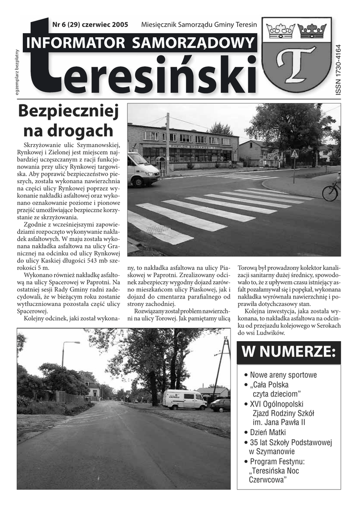 Miesięcznik Samorządu Gminy Teresin egzemplarz bezpłatny ISSN 1730-4164 Nr 6 (29) czerwiec 2005 Bezpieczniej na drogach Skrzyżowanie ulic Szymanowskiej, Rynkowej i Zielonej jest miejscem najbardziej uczęszczanym z racji funkcjonowania przy ulicy Rynkowej targowiska. Aby poprawić bezpieczeństwo pieszych, została wykonana nawierzchnia na części ulicy Rynkowej poprzez wykonanie nakładki asfaltowej oraz wykonano oznakowanie poziome i pionowe przejść umożliwiające bezpieczne korzystanie ze skrzyżowania. Zgodnie z wcześniejszymi zapowiedziami rozpoczęto wykonywanie nakładek asfaltowych. W maju została wykonana nakładka asfaltowa na ulicy Granicznej na odcinku od ulicy Rynkowej do ulicy Kaskiej długości 543 mb szerokości 5 m. Wykonano również nakładkę asfaltową na ulicy Spacerowej w Paprotni. Na ostatniej sesji Rady Gminy radni zadecydowali, że w bieżącym roku zostanie wytłuczniowana pozostała część ulicy Spacerowej. Kolejny odcinek, jaki został wykona- ny, to nakładka asfaltowa na ulicy Piaskowej w Paprotni. Zrealizowany odcinek zabezpieczy wygodny dojazd zarówno mieszkańcom ulicy Piaskowej, jak i dojazd do cmentarza parafialnego od strony zachodniej. Rozwiązany został problem nawierzchni na ulicy Torowej. Jak pamiętamy ulicą Torową był prowadzony kolektor kanalizacji sanitarny dużej średnicy, spowodowało to, że z upływem czasu istniejący asfalt pozałamywał się i popękał, wykonana nakładka wyrównała nawierzchnię i poprawiła dotychczasowy stan. Kolejna inwestycja, jaka została wykonana, to nakładka asfaltowa na odcinku od przejazdu kolejowego w Serokach do wsi Ludwików. W NUMERZE: Nowe areny sportowe „Cała Polska czyta dzieciom” XVI Ogólnopolski Zjazd Rodziny Szkół im. Jana Pawła II Dzień Matki 35 lat Szkoły Podstawowej w Szymanowie Program Festynu: „Teresińska Noc Czerwcowa” 2 Teresiński Informator Samorządowy – nr 6/2005 Z prac Rady Gminy loletnim Planie Inwestycyjnym Gminy Teresin na lata 2004 – 2008, uwzględniających środki na przebudowę boisk na terenie stadionu. Zgodnie z wnioskiem grupy radnych o zaciągnięcie kredytu na zrealizowanie zaplanowanych na 2005 rok zadań inwestycyjnych, przygotowany został stosowny projekt uchwały w sprawie zaciągnięcia kredytu inwestycyjnego. W przedłożonym projekcie uchwały proponuje się zwiększenie kwoty kredytu na budowę dróg do wysokości 900.000 zł (w budżecie planowano 728 tys. zł) oraz kredytu na budowę chodników do wysokości 1.200.000 zł (w budżecie planowano 336 tys. zł). Oprócz tych, zaplanowanych wcześniej w budżecie na 2005 r. kredytów, pojawiła się konieczność wzięcia kredytu na ujęte w tym budżecie zadania, na które były zaplanowane zbyt małe środki (np. na chodniki). Zadłużenie gminy na dzień 31 grudnia 2005 r. wyniesie 5.321.048 zł i nie przekroczy górnej granicy ustalonej w ustawie o finansach publicznych. Pod obrady Rady Gminy trafił projekt nowego Statutu Gminy Teresin – wynik kilkumiesięcznej pracy Komisji Statutowej działającej w składzie: Tadeusz Olechowski (przewodniczący), Andrzej Bartosik, Hubert Konecki, Małgorzata Matela, Krzysztof Piskorz, Halina Zielska. Zdaniem radcy prawnego Andrzeja Jaworskiego przygotowany przez Komisję projekt można uznać za wzorcowy. Statut został przez Radę Gminy zatwierdzony jednogłośnie. Ostatnią podjętą na VI sesji uchwałą było dokonanie zmian w budżecie gminy na 2005 rok. Zmiany w dochodach wynikały głównie ze zmniejszenia dotacji na wybory przedterminowe wójta gminy (9.444 zł) oraz kwoty subwencji oświatowej (ok. 40 tys. zł), a także z ich zwiększenia o kwotę 22.738 zł z tytułu udziału gmin w podatkach stanowiących dochód budżetu państwa oraz z wprowadzenia do budżetu kwoty 7.378 zł pochodzącej z dotacji celowej na pokrycie kosztów stypendiów dla uczniów najuboższych. Zmiany i przesunięcia po stronie wydatków budżetowych polegały przede wszystkim na: zwiększeniu środków na wydatki inwestycyjne (utwardzanie dróg, budowa chodników) w związku z decyzją o zwiększeniu zakresu prac; przesunięciach w rozdziale „Szkoły Podstawowe” – zgodnie z wnioskami dyrektorów; zwiększeniu o kwotę 7.000 zł w rozdz. „Rozliczenia z tytułu poręczeń”; zwiększeniu o 6.500 zł w rozdz. „Pobór podatków, opłat i nieopodatkowanych należności budżetowych”. Dorota Dorodzińska Na VI sesji Rady Gminy, która odbyła się w dniu 13 czerwca 2005 r., podjęto 10 uchwał. Radni rozpoczęli od przyjęcia preliminarza wydatków związanych z profilaktyką i rozwiązywaniem problemów alkoholowych na rok 2005. Kwota 105.000 zł, przeznaczona na działalność przeciwalkoholową, rozdysponowana została m.in. na: finansowanie leczenia osób uzależnionych, obsługę dyżuru Telefonu Zaufania, organizację ferii zimowych, wycieczek oraz kolonii profilaktyczno-terapeutycznych dla dzieci z grup ryzyka, programy profilaktyczne w szkołach i inne. Kolejne trzy uchwały dotyczyły spraw z zakresu zagospodarowania przestrzennego. Podjęto decyzję o nabyciu na rzecz mienia komunalnego działek o ogólnej powierzchni 3.370 m2, co pozwoli na utwardzenie ulic: Cichej i Piaskowej w Paprotni. Postanowiono ponadto o przyjęciu przez Gminę – w formie darowizny – nieruchomości położonej w Granicach, na której planuje się budowę garaży dla OSP Teresin. Radni nadali również nazwę „Spacerowa” ulicy zlokalizowanej w obrębie Teresin-Gaj. Nadanie nazwy tej ulicy, która stanowi przedłużenie ul. Spacerowej w Paprotni, pozwoli na uporządkowanie numeracji posesji w Teresinie-Gaju. Następna uchwała, którą podjęła Rada Gminy, dotyczy przeprowadzenia konsultacji z mieszkańcami gminy w sprawie zniesienia nazw miejscowości figurujących w urzędowym wykazie miejscowości, a pochodzących jeszcze z lat 60-tych. Nazwy te w większości wzięły się z potocznego obiegu, a obecnie nie są już używane. Proponowane do zniesi