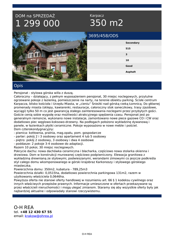 DOM na SPRZEDAŻ 1 299 000 Karpacz 350 m2 3695/458/ODS Secondary 515 3 10 Good Asphalt Opis Pensjonat - stylowa górska willa z duszą. Całoroczny – działający, z pełnym wyposażeniem pensjonat, 30 miejsc noclegowych, przytulne ogrzewane pokoje z łazienką, pomieszczenie na narty, na terenie obiektu parking. Ścisłe centrum Karpacza, blisko kościoła i Urzędu Miasta, w „cieniu” Śnieżki nad górską rzeką Łomnicą. Do głównej promenady miasta (sklepy, kawiarenki, restauracje, całoroczny stok saneczkowy, trasy zjazdowe, wyciągi) tylko 50 m co jest gwarancją stałego zainteresowania noclegami przez przybyłych gości. Goście cenią sobie wygodę oraz możliwości atrakcyjnego spędzenia czasu. Pensjonat jest po generalnym remoncie, wykonano nowe instalacje, zamontowano nowe piece gazowe CO i CW oraz dodatkowo piec węglowo-koksowo-drzewny. Na podłogach położono wykładzinę dywanową i panele, w łazienkach płytki ceramiczne. Pokoje wyposażono w nowe meble i pościel. Dom czterokondygnacyjny: - piwnica: kotłownia, pralnia, mag.opału, pom. gospodarcze - parter: pokój 2 i 3 osobowy oraz apartament 4 lub 5 osobowy - piętro: pokój 2 osobowy, 3 osobowy i dwa 4 osobowe - poddasze: 2 pokoje 3-4 osobowe do adaptacji. Razem 10 pokoi, 30 miejsc noclegowych. Pokrycie dachu: nowa dachówka ceramiczna i blacharka, częściowo nowa stolarka okienna i drzwiowa. Dom w konstrukcji murowanej częściowo podpiwniczony. Elewacja granitowa z wykładziną drewnianą ze stylowymi, podwieszanymi, werandami zimowymi co jeszcze podkreśla styl całego domu wkomponowanego w górski krajobraz Karkonoszy i stylowego górskiego miasteczka. Powierzchnia domu: 350m2, kubatura - 789,25m3 Powierzchnia działki: 0,0515ha, dodatkowo powierzchnia parkingowa 131m2, razem w użytkowaniu właściciela 0,0646ha. Powyższa oferta nie stanowi oferty handlowej w rozumieniu art. 66 § 1 kodeksu cywilnego oraz innych właściwych przepisów prawnych. Informacje umieszczone w ofertach przekazywane są przez właścicieli nieruchomości i mogą ulegać zmianom. Staramy się aby wszystkie oferty były jak najbardziej aktualne i odpowiadały stanowi rzeczywistemu. O-H REA tel. +48 12 430 67 55 email: [email protected] O-H REA O-H REA Powered by TCPDF (www.tcpdf.org)