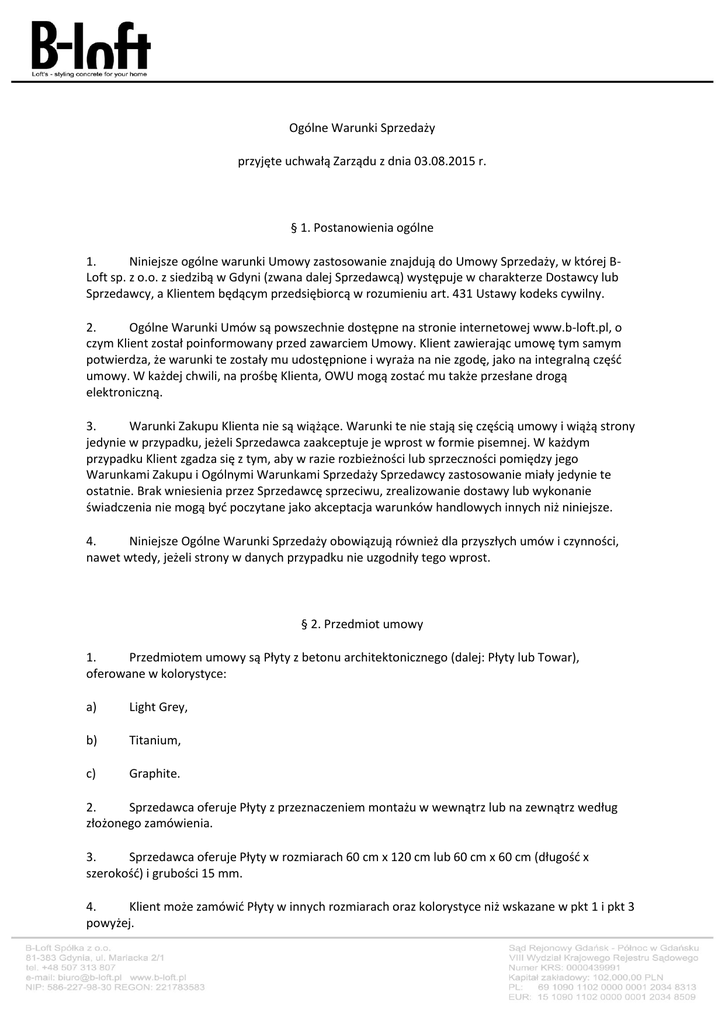 Ogólne Warunki Sprzedaży przyjęte uchwałą Zarządu z dnia 03.08.2015 r. § 1. Postanowienia ogólne 1. Niniejsze ogólne warunki Umowy zastosowanie znajdują do Umowy Sprzedaży, w której BLoft sp. z o.o. z siedzibą w Gdyni (zwana dalej Sprzedawcą) występuje w charakterze Dostawcy lub Sprzedawcy, a Klientem będącym przedsiębiorcą w rozumieniu art. 431 Ustawy kodeks cywilny. 2. Ogólne Warunki Umów są powszechnie dostępne na stronie internetowej www.b-loft.pl, o czym Klient został poinformowany przed zawarciem Umowy. Klient zawierając umowę tym samym potwierdza, że warunki te zostały mu udostępnione i wyraża na nie zgodę, jako na integralną część umowy. W każdej chwili, na prośbę Klienta, OWU mogą zostać mu także przesłane drogą elektroniczną. 3. Warunki Zakupu Klienta nie są wiążące. Warunki te nie stają się częścią umowy i wiążą strony jedynie w przypadku, jeżeli Sprzedawca zaakceptuje je wprost w formie pisemnej. W każdym przypadku Klient zgadza się z tym, aby w razie rozbieżności lub sprzeczności pomiędzy jego Warunkami Zakupu i Ogólnymi Warunkami Sprzedaży Sprzedawcy zastosowanie miały jedynie te ostatnie. Brak wniesienia przez Sprzedawcę sprzeciwu, zrealizowanie dostawy lub wykonanie świadczenia nie mogą być poczytane jako akceptacja warunków handlowych innych niż niniejsze. 4. Niniejsze Ogólne Warunki Sprzedaży obowiązują również dla przyszłych umów i czynności, nawet wtedy, jeżeli strony w danych przypadku nie uzgodniły tego wprost. § 2. Przedmiot umowy 1. Przedmiotem umowy są Płyty z betonu architektonicznego (dalej: Płyty lub Towar), oferowane w kolorystyce: a) Light Grey, b) Titanium, c) Graphite. 2. Sprzedawca oferuje Płyty z przeznaczeniem montażu w wewnątrz lub na zewnątrz według złożonego zamówienia. 3. Sprzedawca oferuje Płyty w rozmiarach 60 cm x 120 cm lub 60 cm x 60 cm (długość x szerokość) i grubości 15 mm. 4. Klient może zamówić Płyty w innych rozmiarach oraz kolorystyce niż wskazane w pkt 1 i pkt 3 powyżej. 5. Płyty z przeznaczeniem montażu na zewnątrz są poddane działaniu środka głęboko impregnującego. 6. Płyty z przeznaczeniem montażu do wewnątrz w celu prawidłowego użytkowania powinny zostać zaimpregnowane przez Klienta środkiem głęboko penetrującym Mapei, Antipluviol S lub W, dostępnym w ofercie Sprzedawcy jako usługa impregnacyjna. § 3. Zawarcie umowy 1. Ogłoszenia, reklamy, cenniki i inne informacje handlowe przekazane przez Sprzedawcę nie stanowią oferty w rozumieniu kodeksu cywilnego, a jedynie zaproszenie do rozpoczęcia rokowań w celu zawarcia umowy, chyba że wyraźnie stanowią one inaczej. 2. Umowa dochodzi do skutku poprzez potwierdzenie zamówienia wskazanego w Zestawieniu Ofertowym przez Klienta i dokonanie płatności zadatku w wysokości wskazanej w Zestawieniu Ofertowym lub Fakturze VAT. 3. Sprzedawca potwierdzi przyjęcie zamówienia po zaksięgowaniu zadatku, na rachunku bankowym, wskazanym w Zestawieniu ofertowym lub „Pro Formie”. 4. W Zestawieniu Ofertowym Sprzedawca określa: nazwę asortymentu, jego wymiary, kolor, wielkość zamówienia (ilość), jednostkę miary podaną w metrach kwadratowych (m2), warunki dostawy, zgodnie z informacjami pozyskanymi od Klienta. 5. Klient oświadcza, że dane zawarte przez niego w Zestawieniu Ofertowym są prawdziwe oraz zgodne z aktualnym stanem prawnym. W przypadku zmiany podanych w treści Zestawienia Ofertowego danych, Klient zobowiązany jest niezwłocznie powiadomić Sprzedawcę. W przypadku braku informacji o zmianie adresu Klienta doręczenia pod wskazany w Zestawieniu Ofertowym adres uznaje się za skuteczne. 6. W przypadku, gdy warunki zamówienia złożone przez Klienta nie mogą zostać przyjęte, Sprzedawca zawiadamia o tym Klienta w terminie 5 dni roboczych od daty otrzymania zamówienia określając własne warunki sprzedaży. Brak odpowiedzi Klienta najpóźniej w przeciągu kolejnych 3 dni roboczych uważa się za wyrażenie zgody na przystąpienie do wykonania zamówienia na warunkach określonych przez Sprzedawcę. 7. O treści zawartej umowy decyduje w razie wątpliwości treść Zestawienia Ofertowego przesłanego Klientowi przez Sprzedawcę. 8. Sprzedawca zobowiązany jest do poinformowania Klienta o terminie wykonania zamówienia i wskazania terminu do wpłaty całości wynagrodzenia za sprzedany Towar, zgodnie z informacjami zawartymi w Zestawieniu Ofertowym lub Fakturze VAT. 9. Podane ceny są cenami netto, do których naliczony zostanie należny podatek VAT. Cena nie obejmuje kosztów transportu, opakowania, montażu i impregnacji Towaru, chyba że Strony umówiły się inaczej. § 4. Dostawa 1. Przybliżany Termin dostawy określony jest w Zestawieniu Ofertowym a następnie potwierdzany drogą mailową lub telefonicznie przez Sprzedawcę. 2. Sprzedawca wyda Klientowi Towar z dniem opłacenia końcowej Faktury VAT. Przez wydanie Towaru klientowi strony rozumieją również przekazanie go przedsiębiorstwu transportowemu w celu dostarczenia do Klienta. 3. Termin dostawy ulega wydłużeniu o okres niezawinionej przez Sprzedawcę przeszkody (siła wyższa, strajk itp.) lub przeszkody zaistniałej po stronie jego podwykonawcy, a ponadto o okres ewentualnego przysługującego Sprzedawcy prawa zatrzymania. 4. Sprzedawcy przysługuje prawo zatrzymania, dopóki Klient opóźnia się ze spełnieniem zobowiązań wynikających z niniejszej umowy lub z innej umowy wiążącej Strony. 5. Wydanie Towarów odbywa się wg EXW (Incoterms 2000) siedziba Sprzedawcy, chyba że strony uzgodniły inaczej za dodatkową odpłatnością zgodnie z ust. 6 i 7 poniżej. 6. Jeżeli strony wyraźnie postanowią, iż Towar ma być dostarczony w obszarze miast Gdańsk, Sopot lub Gdynia oraz miejsc oddalonych od nich 30 kilometrów, wówczas Sprzedawca zobowiąże się dostarczyć Towar objęty umową, zgodnie z zasadami wskazanymi w Zestawieniu Ofertowym, na koszt Klienta. 7. Jeżeli