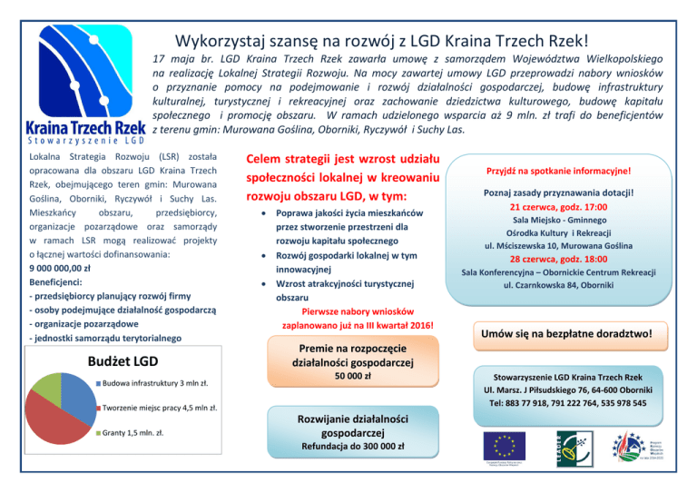 Wykorzystaj szansę na rozwój z LGD Kraina Trzech Rzek! 17 maja br. LGD Kraina Trzech Rzek zawarła umowę z samorządem Województwa Wielkopolskiego na realizację Lokalnej Strategii Rozwoju. Na mocy zawartej umowy LGD przeprowadzi nabory wniosków o przyznanie pomocy na podejmowanie i rozwój działalności gospodarczej, budowę infrastruktury kulturalnej, turystycznej i rekreacyjnej oraz zachowanie dziedzictwa kulturowego, budowę kapitału społecznego i promocję obszaru. W ramach udzielonego wsparcia aż 9 mln. zł trafi do beneficjentów z terenu gmin: Murowana Goślina, Oborniki, Ryczywół i Suchy Las. Lokalna Strategia Rozwoju (LSR) została opracowana dla obszaru LGD Kraina Trzech Rzek, obejmującego teren gmin: Murowana Goślina, Oborniki, Ryczywół i Suchy Las. Mieszkańcy obszaru, przedsiębiorcy, organizacje pozarządowe oraz samorządy w ramach LSR mogą realizować projekty o łącznej wartości dofinansowania: 9 000 000,00 zł Beneficjenci: - przedsiębiorcy planujący rozwój firmy - osoby podejmujące działalność gospodarczą - organizacje pozarządowe - jednostki samorządu terytorialnego Budżet LGD Budowa infrastruktury 3 mln zł. Celem strategii jest wzrost udziału społeczności lokalnej w kreowaniu rozwoju obszaru LGD, w tym: Poprawa jakości życia mieszkańców przez stworzenie przestrzeni dla rozwoju kapitału społecznego Rozwój gospodarki lokalnej w tym innowacyjnej Wzrost atrakcyjności turystycznej obszaru Pierwsze nabory wniosków zaplanowano już na III kwartał 2016! Poznaj zasady przyznawania dotacji! 21 czerwca, godz. 17:00 Sala Miejsko - Gminnego Ośrodka Kultury i Rekreacji ul. Mściszewska 10, Murowana Goślina 28 czerwca, godz. 18:00 Sala Konferencyjna – Obornickie Centrum Rekreacji ul. Czarnkowska 84, Oborniki Umów się na bezpłatne doradztwo! Premie na rozpoczęcie działalności gospodarczej 50 000 zł Tworzenie miejsc pracy 4,5 mln zł. Granty 1,5 mln. zł. Przyjdź na spotkanie informacyjne! Rozwijanie działalności gospodarczej Refundacja do 300 000 zł Stowarzyszenie LGD Kraina Trzech Rzek Ul. Marsz. J Piłsudskiego 76, 64-600 Oborniki Tel: 883 77 918, 791 222 764, 535 978 545