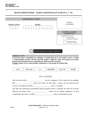 JĘZYK HISZPAŃSKI KARTA ROZWIĄZAŃ ZADAŃ 6., 7. i 8. UZUPEŁNIA UCZEŃ KOD UCZNIA miejsce na naklejkę PESEL UZUPEŁNIA ZESPÓŁ NADZORUJĄCY Uprawnienia ucznia do: dostosowania kryteriów oceniania nieprzenoszenia zaznaczeń na kartę Poniżej zapisz rozwiązanie zadania 6. Zadanie 6. (0–5) Przeczytaj tekst. Uzupełnij go, wpisując w każdą lukę (6.1.–6.5.) jeden wyraz z ramki w odpowiedniej formie, tak aby powstał spójny i logiczny tekst. Wymagana jest pełna poprawność gramatyczna i ortograficzna wpisywanych wyrazów. Uwaga! Jeden wyraz został podany dodatkowo i nie pasuje do żadnej luki. UNA TRATAR LA PRIMERO LLEVAR PEDIR SOY CANGURO Hoy ha sido mi 6.1. ____________________ día de «canguro». Por la tarde me he quedado 6.2. ____________________ horas con Luisa, de siete años, y Juana, de seis, hijas de mis vecinos. Su madre me lo 6.3. ____________________ ayer y yo acepté. ¡Ha sido una experiencia fenomenal! Hemos jugado mucho y después de cenar les he leído historias de piratas. 6.4. ____________________ niñas son de verdad simpáticas. Se han comportado muy bien y me 6.5. ____________________ como a un hermano mayor. GE-R1 Język hiszpański – karta rozwiązań zadań Strona 1 z 4 Poniżej zapisz rozwiązanie zadania 7. Zadanie 7. (0–5) Uzupełnij zdania 7.1.–7.5., wykorzystując podane w nawiasach wyrazy w odpowiedniej formie. Nie należy zmieniać kolejności podanych wyrazów, trzeba natomiast – jeżeli jest to konieczne – dodać inne wyrazy, tak aby otrzymać logiczne i gramatycznie poprawne zdania. Wymagana jest pełna poprawność ortograficzna wpisywanych fragmentów. Uwaga! W każdą lukę możesz wpisać maksymalnie cztery wyrazy, wliczając w to wyrazy już podane. 7.1. ¿No te acuerdas de que hoy (ser / cumpleaños) _________________________________ de la abuela? 7.2. El año pasado mis amigos se (ir / vacaciones) __________________________________ a Francia. 7.3. Ahora no os podemos ayudar. Es que (estar / muy / ocupado) _____________________ _______________________________________________________________________. 7.4. Llevo tres (mes / estudiar) ___________________________________________ alemán y ya lo hablo bastante bien. 7.5. ¿Esta (foto / ser / tu) ________________________________________ o de tu hermana? Rozwiązanie zadania 8. zapisz na następnej stronie. Zadanie 8. (0–10) Kilka dni temu przeprowadziłeś(-aś) się do nowego domu/mieszkania. W e-mailu do kolegi z Hiszpanii: wyjaśnij, dlaczego Twoja rodzina zmieniła miejsce zamieszkania zrelacjonuj wydarzenie, które miało miejsce podczas przeprowadzki opisz swój nowy pokój. Podpisz się jako XYZ. Rozwiń swoją wypowiedź w każdym z trzech podpunktów, pamiętając, że długość e-maila powinna wynosić od 50 do 100 słów. Oceniana jest umiejętność pełnego przekazania informacji, spójność, bogactwo językowe oraz poprawność językowa. Język hiszpański – karta rozwiązań zadań Strona 2 z 4 GE-R1 CZYSTOPIS Mensaje De: [email protected] Para: [email protected] Asunto: ¡Hola! ………………………………………………………………………………………… ………………………………………………………………………………………… ………………………………………………………………………………………… ………………………………………………………………………………………… ………………………………………………………………………………………… ………………………………………………………………………………………… ………………………………………………………………………………………… ………………………………………………………………………………………… ………………………………………………………………………………………… ………………………………………………………………………………………… ………………………………………………………………………………………… ………………………………………………………………………………………… ………………………………………………………………………………………… ………………………………………………………………………………………… ………………………………………………………………………………………… …………………………………………………………………………………………. treść liczba punktów GE-R1 0 1 2 3 4 spójność i logika wypowiedzi zakres środków językowych poprawność środków językowych 0 0 0 1 2 1 2 Język hiszpański – karta rozwiązań zadań Strona 3 z 4 1 2 RAZEM BRUDNOPIS (nie podlega ocenie) Język hiszpański – karta rozwiązań zadań Strona 4 z 4 GE-R1
