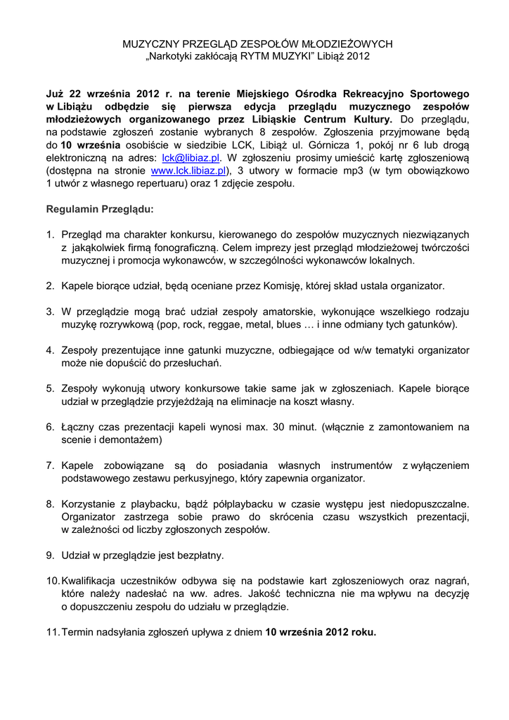 MUZYCZNY PRZEGLĄD ZESPOŁÓW MŁODZIEŻOWYCH „Narkotyki zakłócają RYTM MUZYKI” Libiąż 2012 Już 22 września 2012 r. na terenie Miejskiego Ośrodka Rekreacyjno Sportowego w Libiążu odbędzie się pierwsza edycja przeglądu muzycznego zespołów młodzieżowych organizowanego przez Libiąskie Centrum Kultury. Do przeglądu, na podstawie zgłoszeń zostanie wybranych 8 zespołów. Zgłoszenia przyjmowane będą do 10 września osobiście w siedzibie LCK, Libiąż ul. Górnicza 1, pokój nr 6 lub drogą elektroniczną na adres: [email protected]. W zgłoszeniu prosimy umieścić kartę zgłoszeniową (dostępna na stronie www.lck.libiaz.pl), 3 utwory w formacie mp3 (w tym obowiązkowo 1 utwór z własnego repertuaru) oraz 1 zdjęcie zespołu. Regulamin Przeglądu: 1. Przegląd ma charakter konkursu, kierowanego do zespołów muzycznych niezwiązanych z jakąkolwiek firmą fonograficzną. Celem imprezy jest przegląd młodzieżowej twórczości muzycznej i promocja wykonawców, w szczególności wykonawców lokalnych. 2. Kapele biorące udział, będą oceniane przez Komisję, której skład ustala organizator. 3. W przeglądzie mogą brać udział zespoły amatorskie, wykonujące wszelkiego rodzaju muzykę rozrywkową (pop, rock, reggae, metal, blues … i inne odmiany tych gatunków). 4. Zespoły prezentujące inne gatunki muzyczne, odbiegające od w/w tematyki organizator może nie dopuścić do przesłuchań. 5. Zespoły wykonują utwory konkursowe takie same jak w zgłoszeniach. Kapele biorące udział w przeglądzie przyjeżdżają na eliminacje na koszt własny. 6. Łączny czas prezentacji kapeli wynosi max. 30 minut. (włącznie z zamontowaniem na scenie i demontażem) 7. Kapele zobowiązane są do posiadania własnych instrumentów podstawowego zestawu perkusyjnego, który zapewnia organizator. z wyłączeniem 8. Korzystanie z playbacku, bądź półplaybacku w czasie występu jest niedopuszczalne. Organizator zastrzega sobie prawo do skrócenia czasu wszystkich prezentacji, w zależności od liczby zgłoszonych zespołów. 9. Udział w przeglądzie jest bezpłatny. 10. Kwalifikacja uczestników odbywa się na podstawie kart zgłoszeniowych oraz nagrań, które należy nadesłać na ww. adres. Jakość techniczna nie ma wpływu na decyzję o dopuszczeniu zespołu do udziału w przeglądzie. 11. Termin nadsyłania zgłoszeń upływa z dniem 10 września 2012 roku. 12. Organizator nie zwraca nadesłanych materiałów. 13. W przypadku małej liczby zgłoszeń komisja może zakwalifikować wszystkie zespoły, które nadeślą swój materiał demonstracyjny, bez przesłuchiwania i oceniania. 14. Lista zakwalifikowanych zespołów zostanie umieszczona na stronie internetowej organizatora (www.lck.libiaz.pl). 15. Dokładny program ze wskazaniem czasu prezentacji dla poszczególnych zespołów dostępny będzie na stronie internetowej organizatora na 7 dni przed przeglądem. 16. Zespoły zobowiązane są przybyć na miejsce przeglądu na godzinę przed planowanym występem i zgłosić organizatorom swoją obecność. Niestawienie się dyskwalifikuje zespół. 17. Organizatorzy zapewniają: sprzęt nagłaśniający, oświetlenie, podstawowy zestaw perkusyjny (perkusiści są zobowiązani do używania własnych pałek, talerzy, werbla i stopy), mikrofony na statywach. 18. Dostarczona organizatorowi karta zgłoszeniowa kapeli jest równoznaczna z akceptacją niniejszego regulaminu. 19. Wypełnienie karty, zgłoszenie i jej podpisanie, jest równoznaczne ze zgodą na bezpłatne rejestrowanie materiału z konkursu, jego publiczne odtwarzanie w celach reklamowych, przetwarzanie danych osobowych przez organizatora. 20. Werdykt Jury jest ostateczny. 21. Przewidywane nagrody: • I m-ce nagroda pieniężna dla najlepszego zespołu 750,00 zł oraz możliwość występu podczas Dni Libiąża 2013. • II m-ce nagroda pieniężna w wysokości 500,00 zł • III m-ce nagroda pieniężna w wysokości 350,00 zł • wyróżnienia (2 x 150,00 zł) 22. Organizator zastrzega sobie prawo do zmian w Regulaminie Przeglądu. 23. Kwestie sporne, nieobjęte regulaminem lub wymagające dodatkowych interpretacji rozstrzygać będzie organizator.